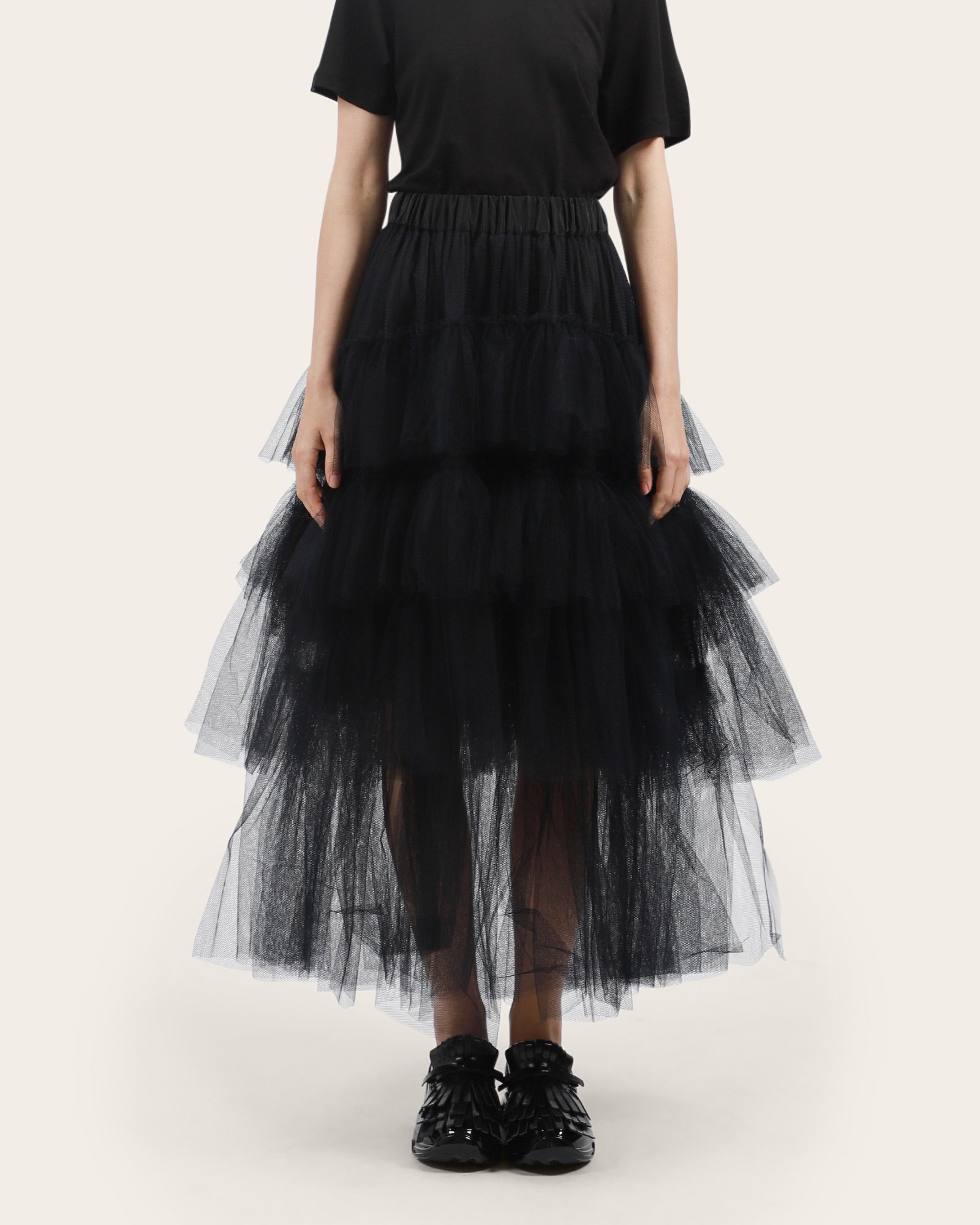Dreamy and playful, this light blue tulle skirt is designed with cascading ruffled tiers for an ethereal, voluminous look. The elastic waistband ensures a comfortable fit, while the sheer layers add a whimsical touch. Perfect for dressing up any outfit.