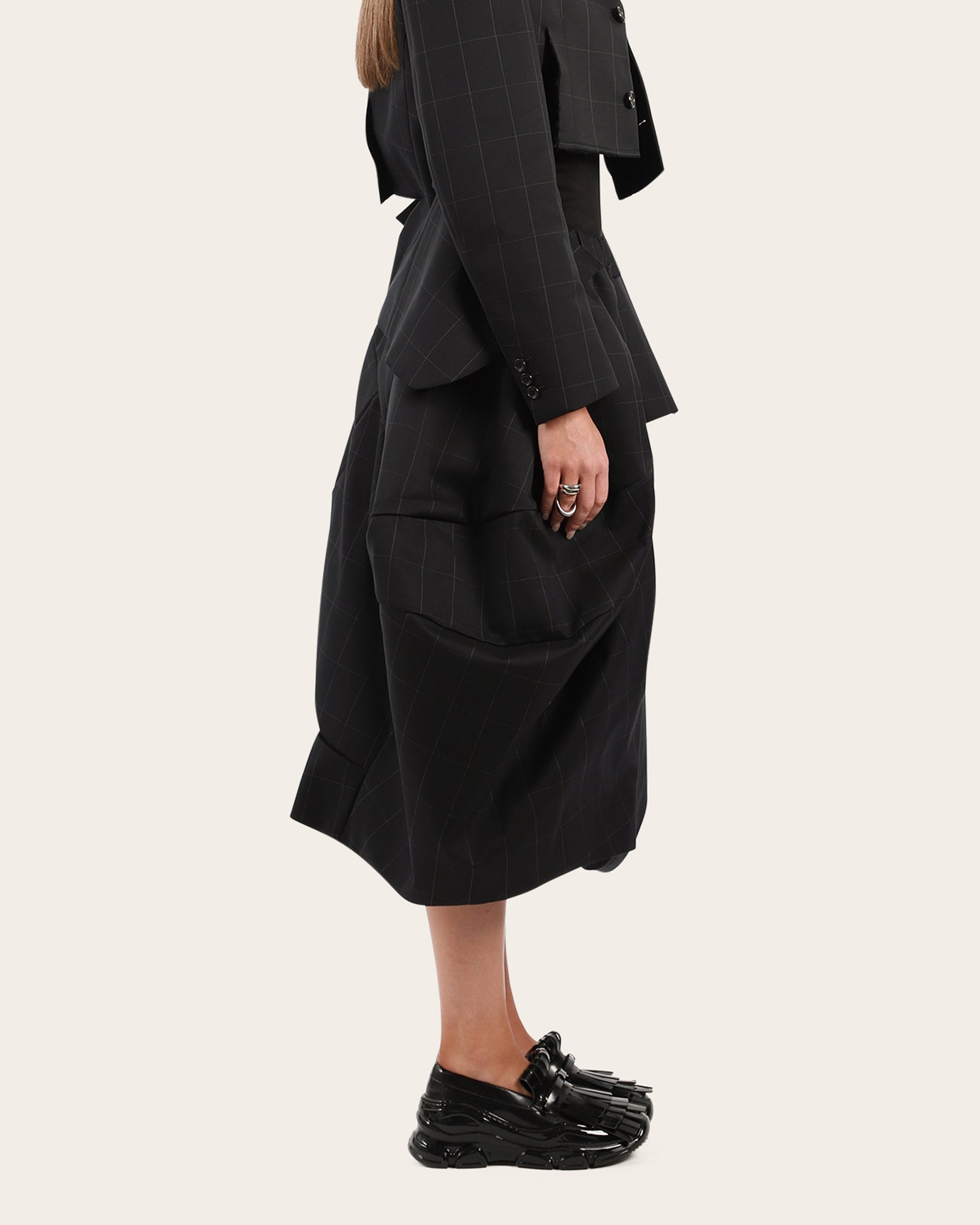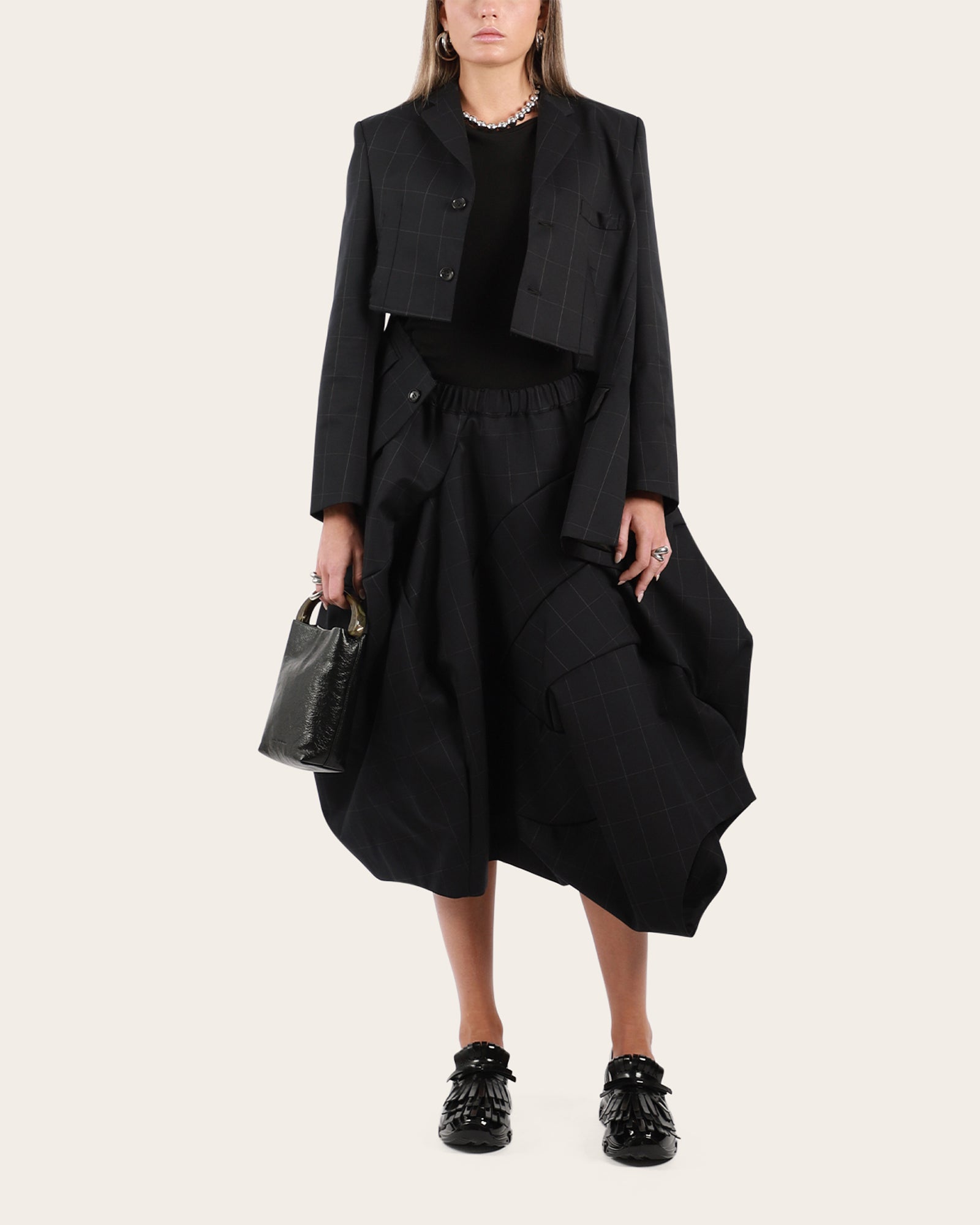 • A midi skirt, featuring an elasticated waistline, asymmetrical silhouette with cuts in fabrics , bringing voluminous 3D detail. Perfect to pair with the matching Deconstructed Jacket from Comme Des Garcons. Made in Japan.