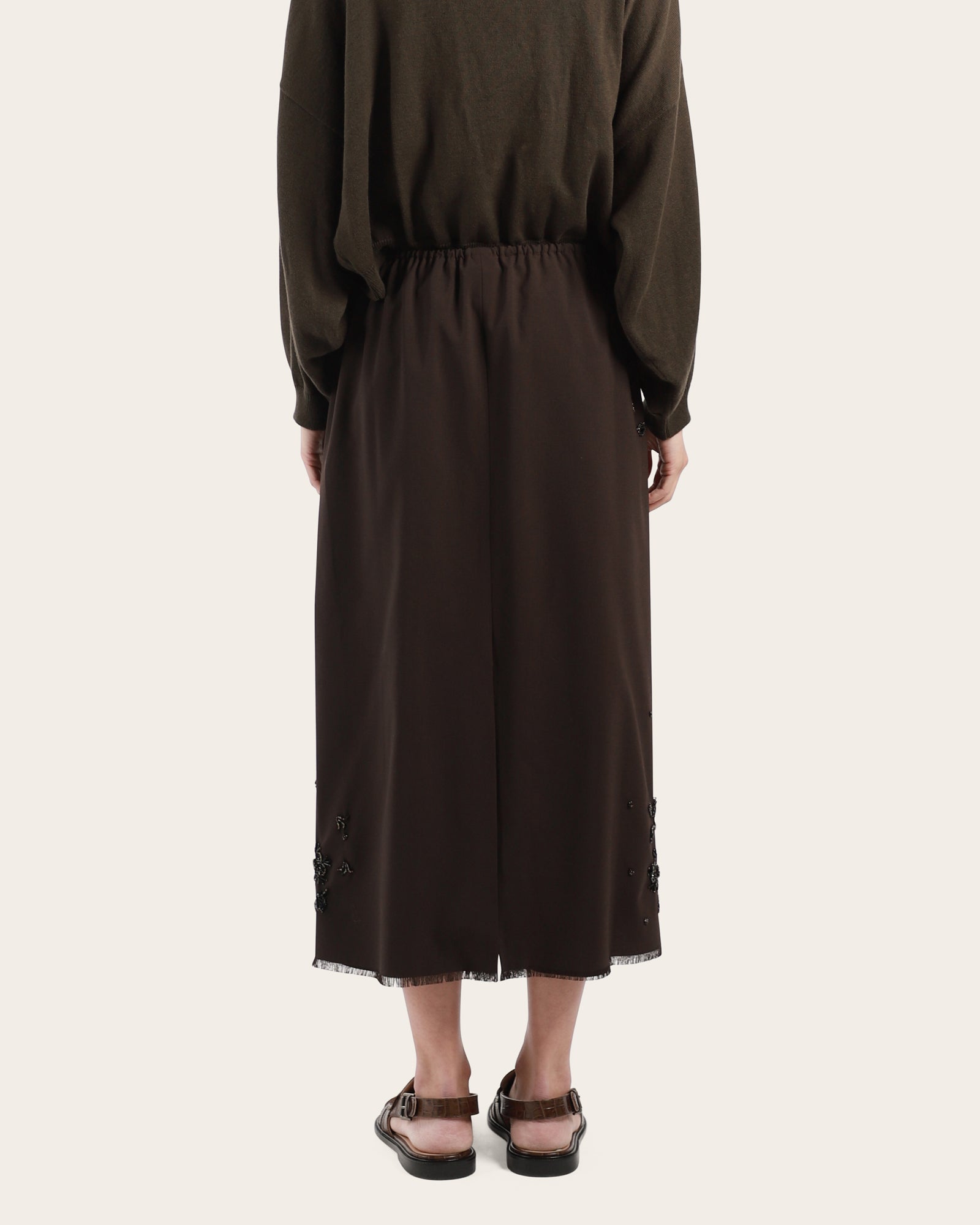 Lightweight midi skirt with fluid movement, detailed with delicate hand-applied beading and a raw-edge hem for subtle texture. Designed with a slim elastic waistband and a discreet slit, it’s a versatile piece that balances ease and elegance. Made in Spain.