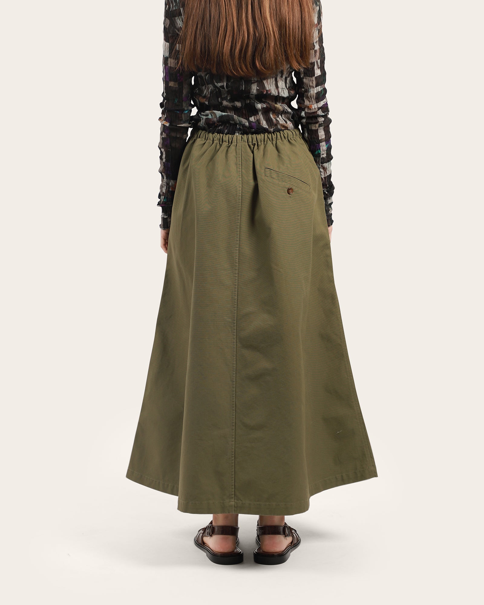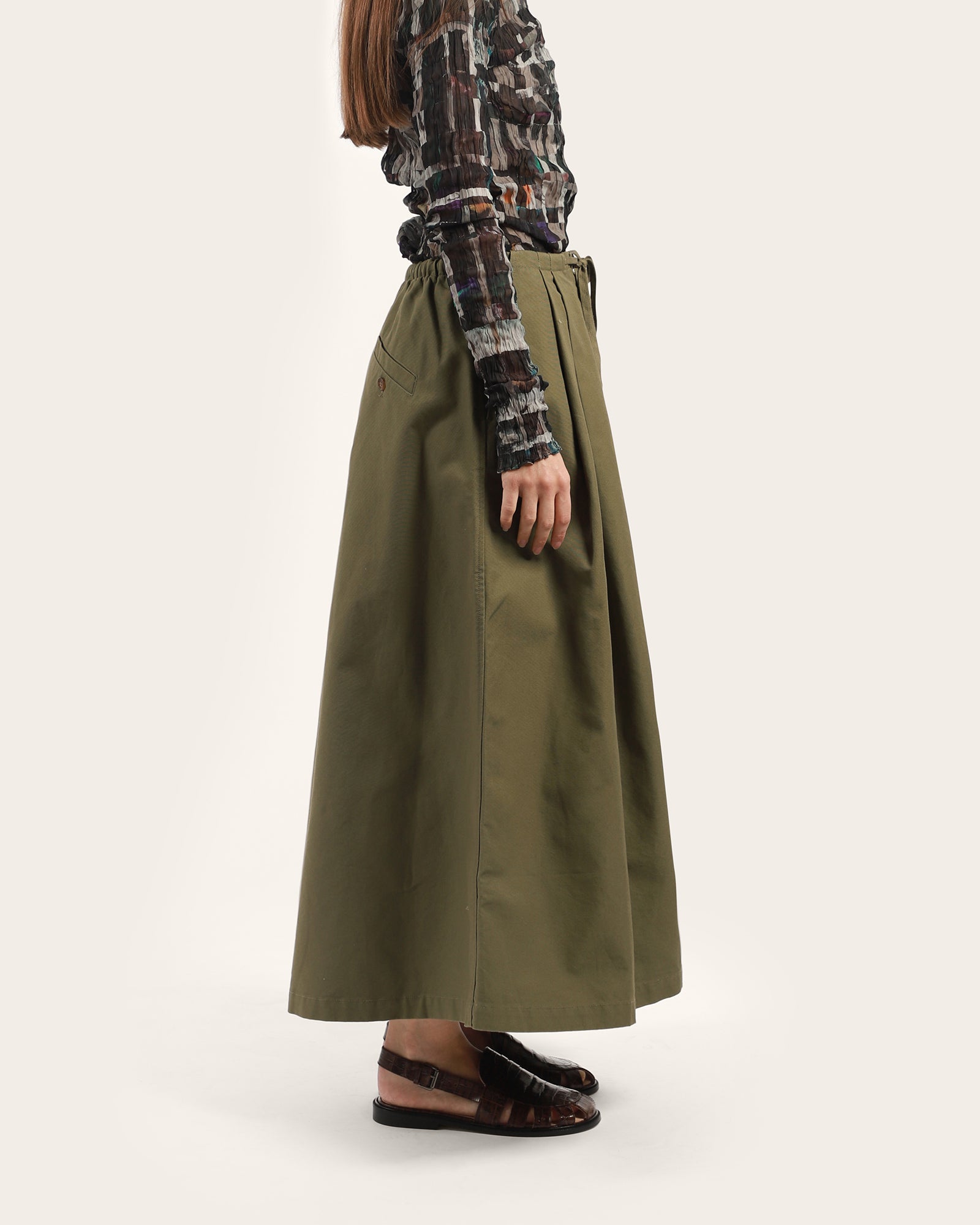Deep pleats and slant pockets reminiscent of a chino. Elastic back and cotton herringbone draw cord for ease, in a flattering flared cut. -