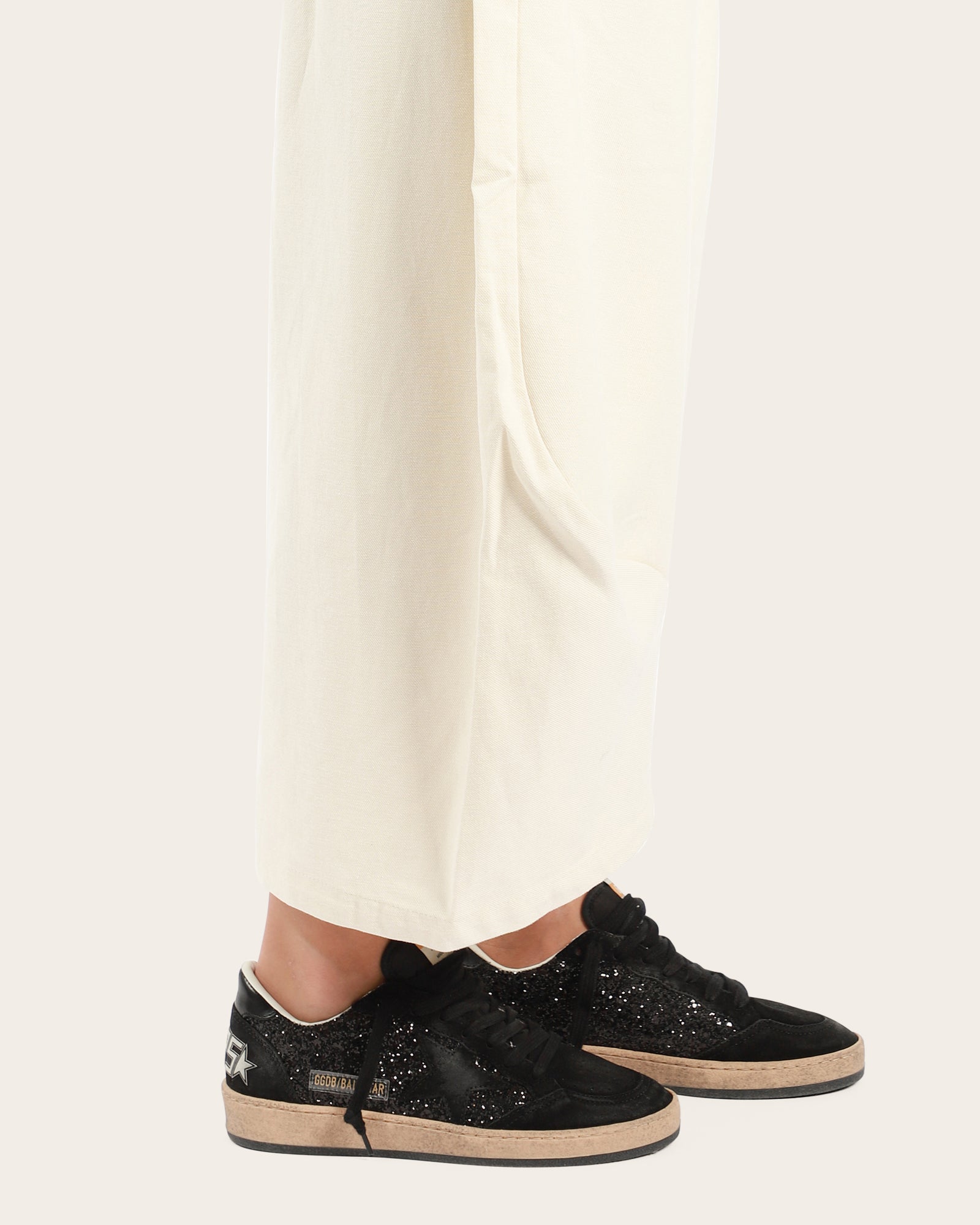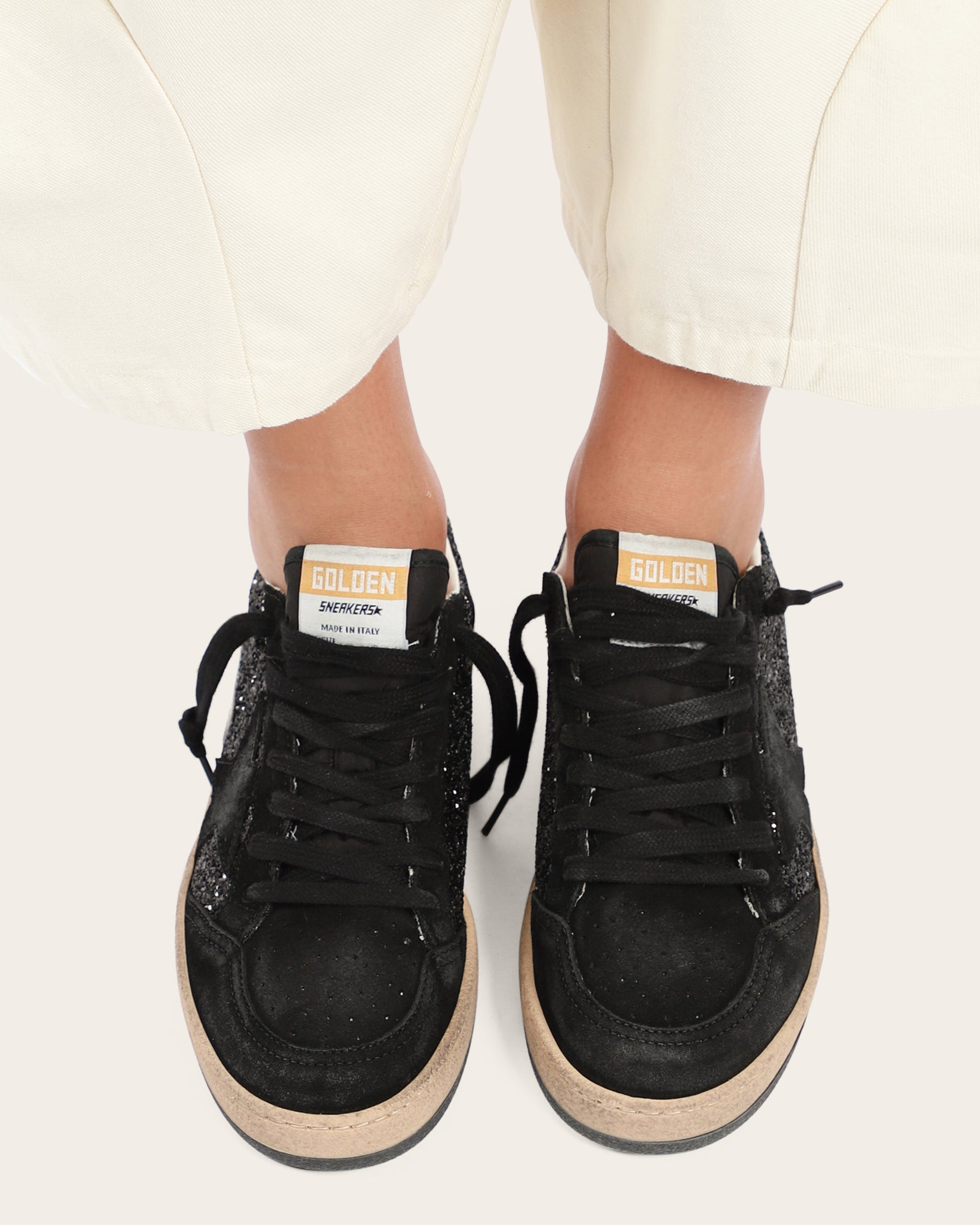 The classic Ballstar sneakers featuring a smooth black calfskin leather upper, black suede leather toe and star on side, black glitter back heel with distressed off white rubber sole. Made in Italy.