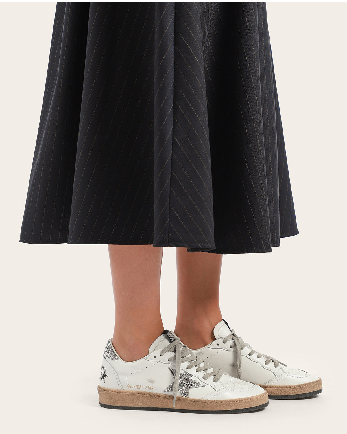 These Ballstar glitter sneakers, feature a white upper in calf leather with contrast laces, silver glitter star on side and back heel, contrast beige rubber sole with a classic distressed look all over. Made in Italy.