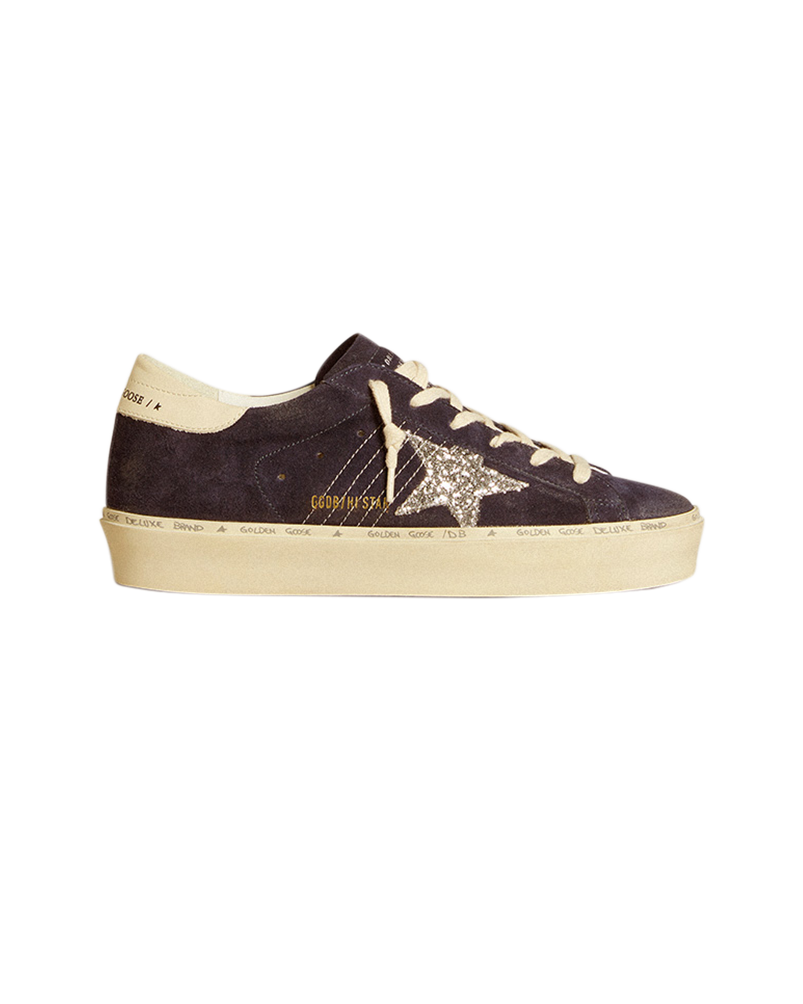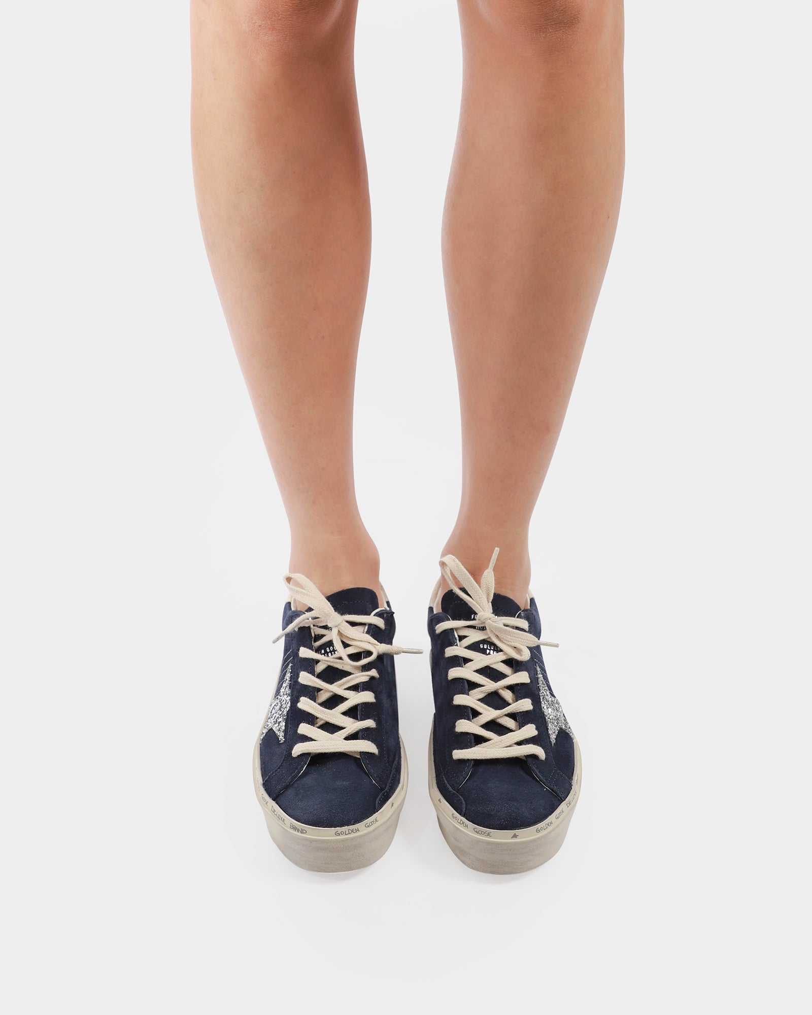 The Hi Star Classic With List sneakers feature a blue suede upper leather, white leather heel tab and white rubber sole. They have white laces and a silver glitter star on side. Made in Italy.