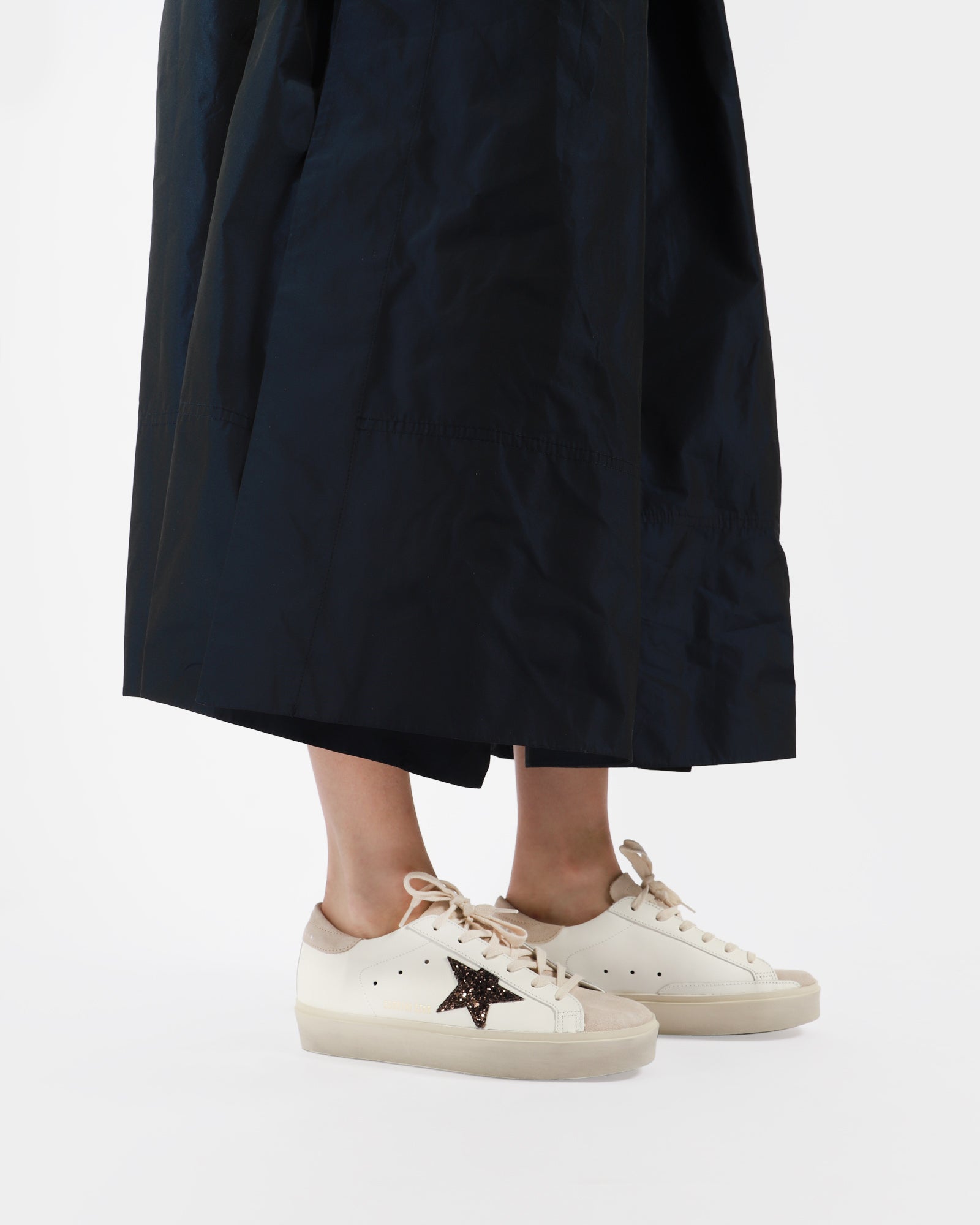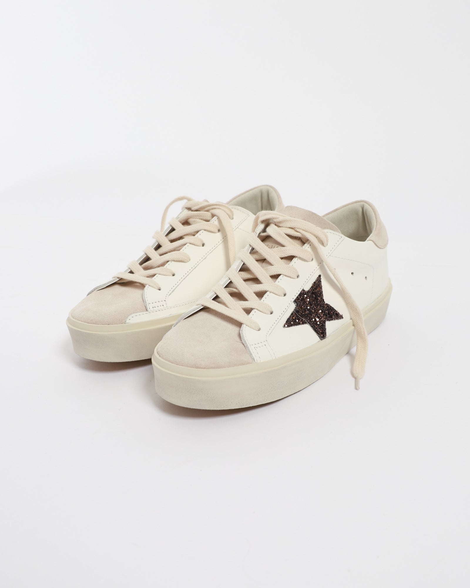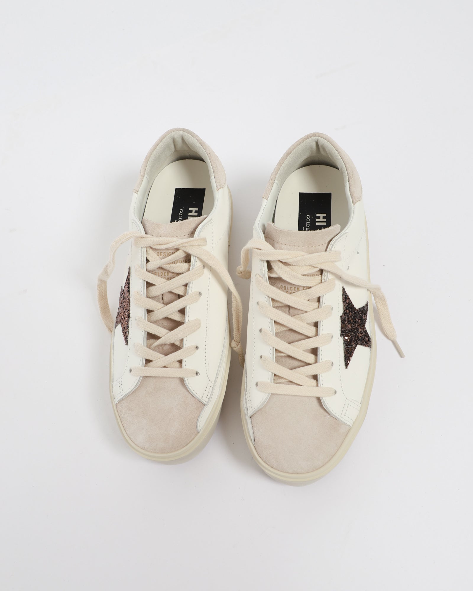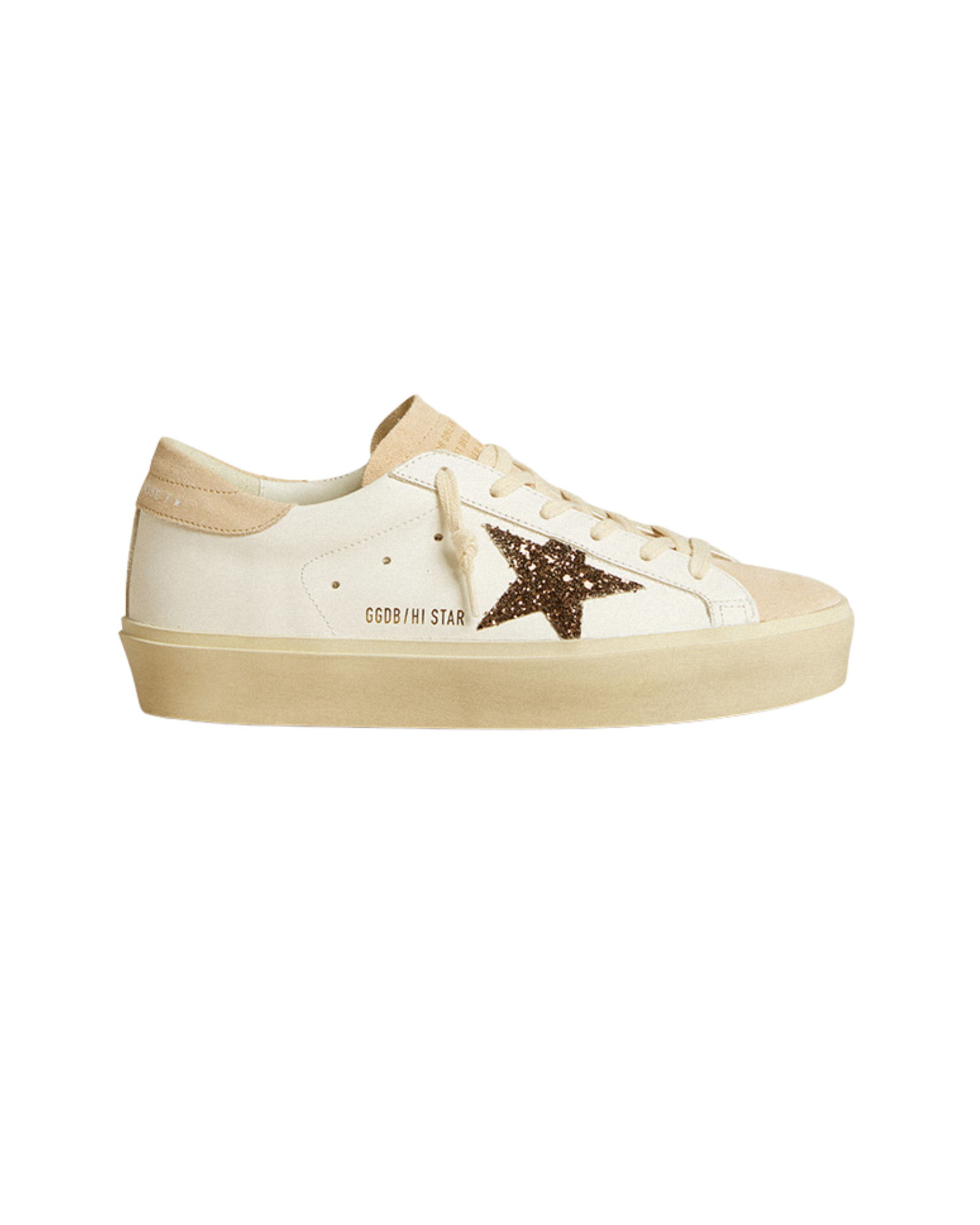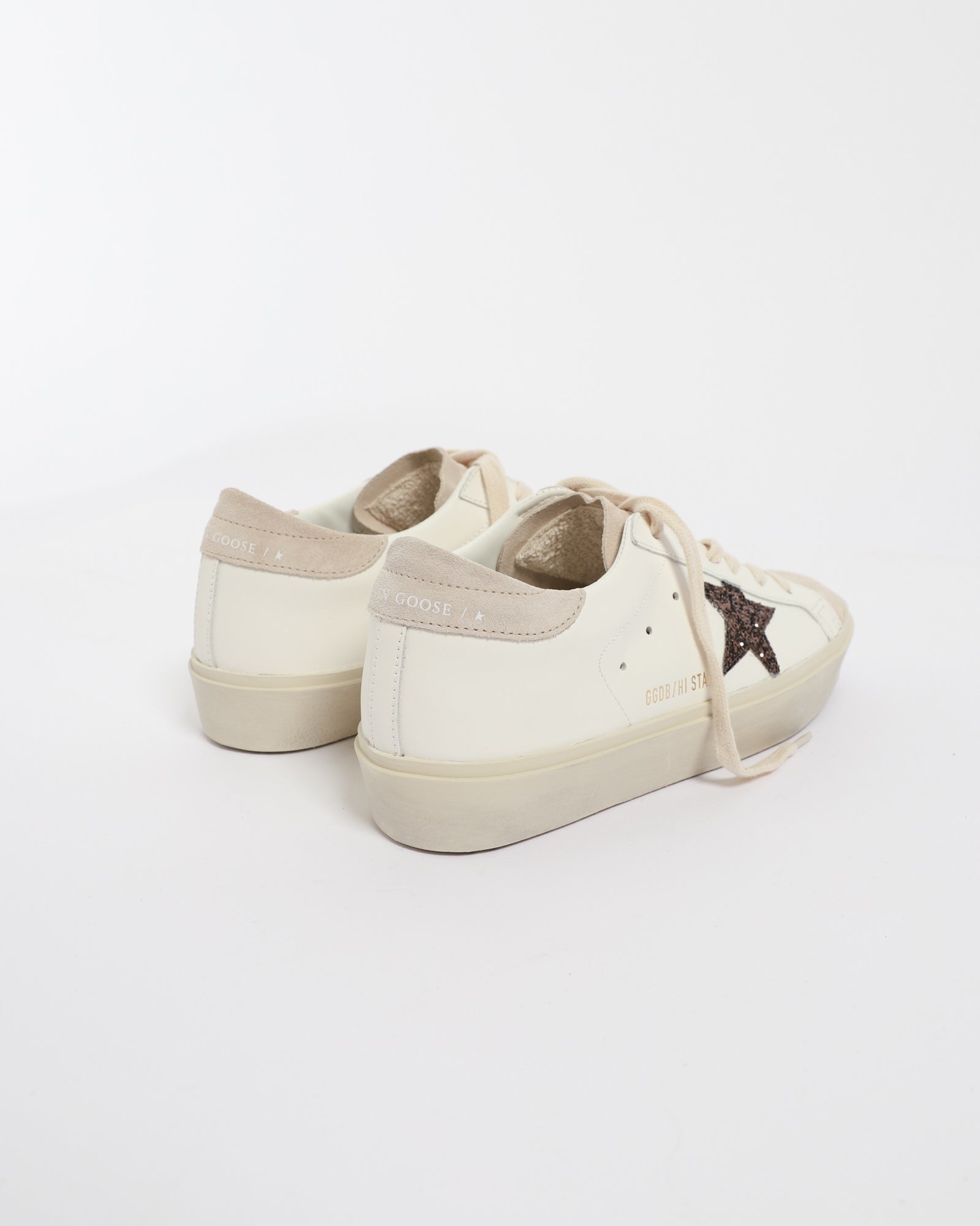 The Golden Goose Hi Star Classic sneaker features a cow leather suede upper, finished with glitter star detailing and branded accents throughout.
