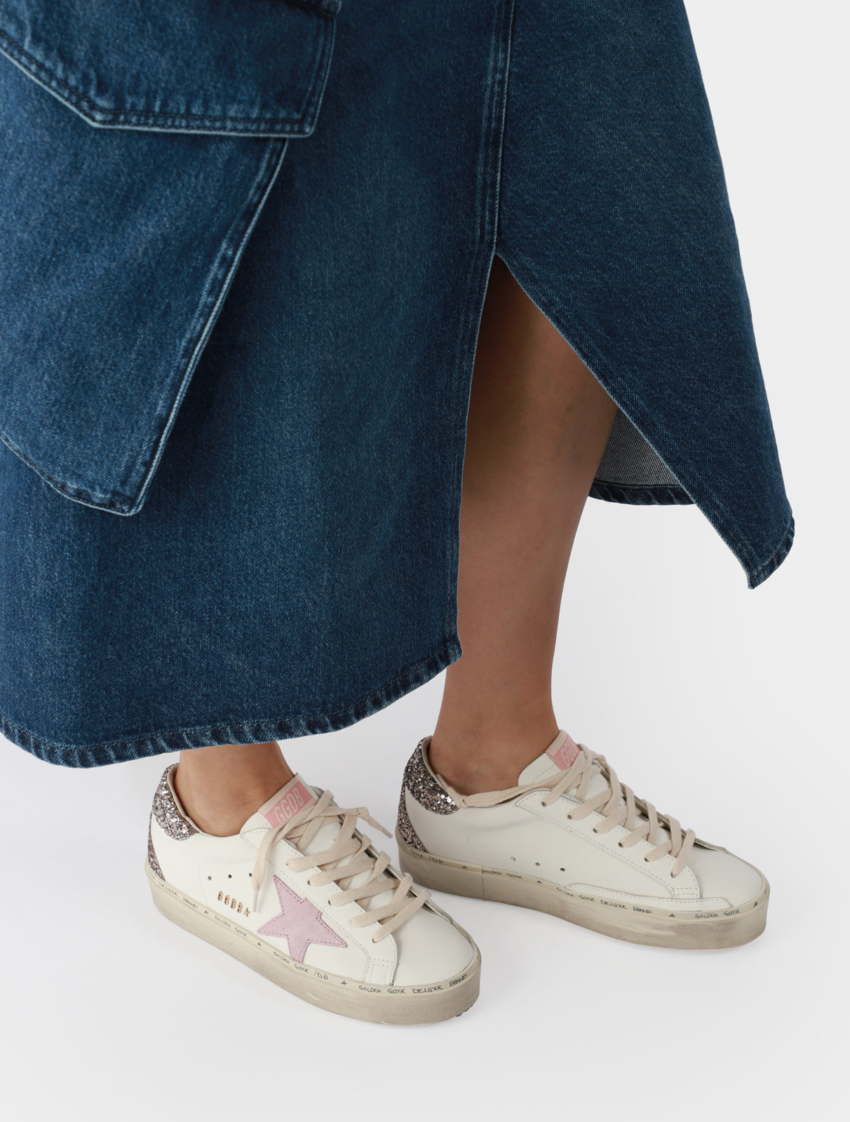 Hi Star sneakers from Golden Goose featuring a round toe, leather upper, suede star, glitter heel, contrast colour outer sole, off white laces, spur metal lettering.