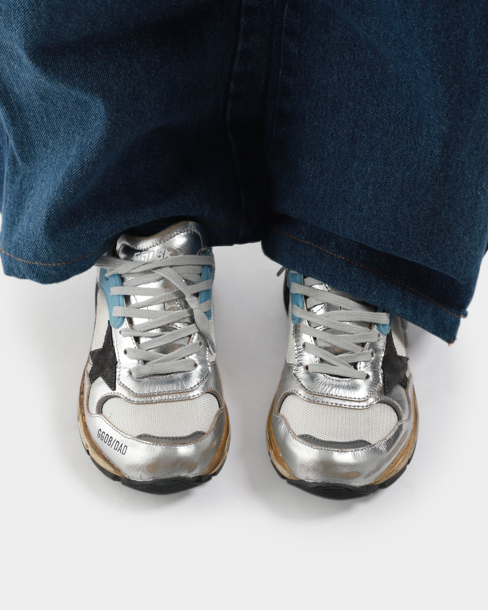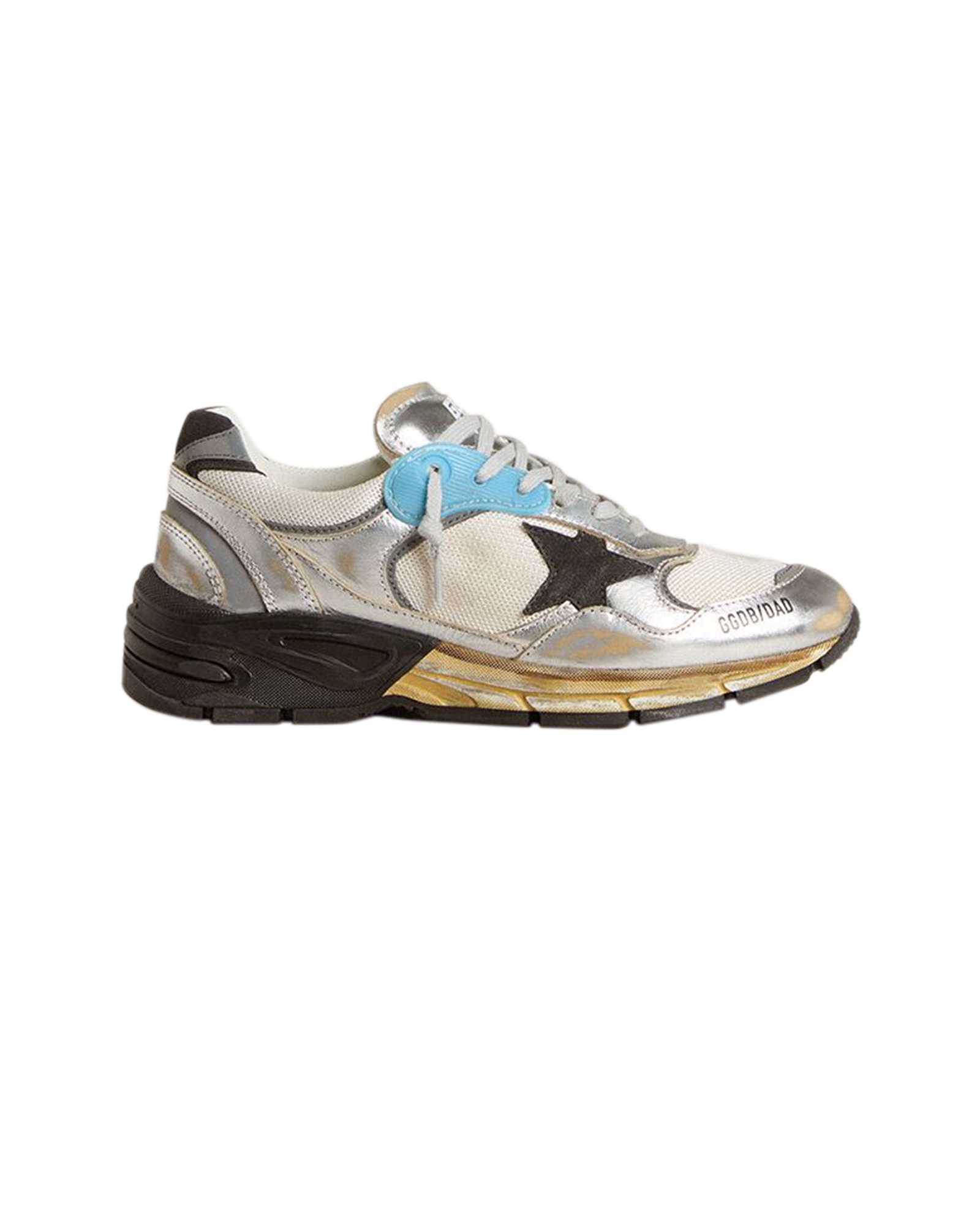 The Dad-Star sneakers blend timeless style with modern details. This version pairs white mesh and silver leather with a black star, suede heel tab, light blue eyelets, two-tone sole, and ice-gray laces. Handmade in Italy.
