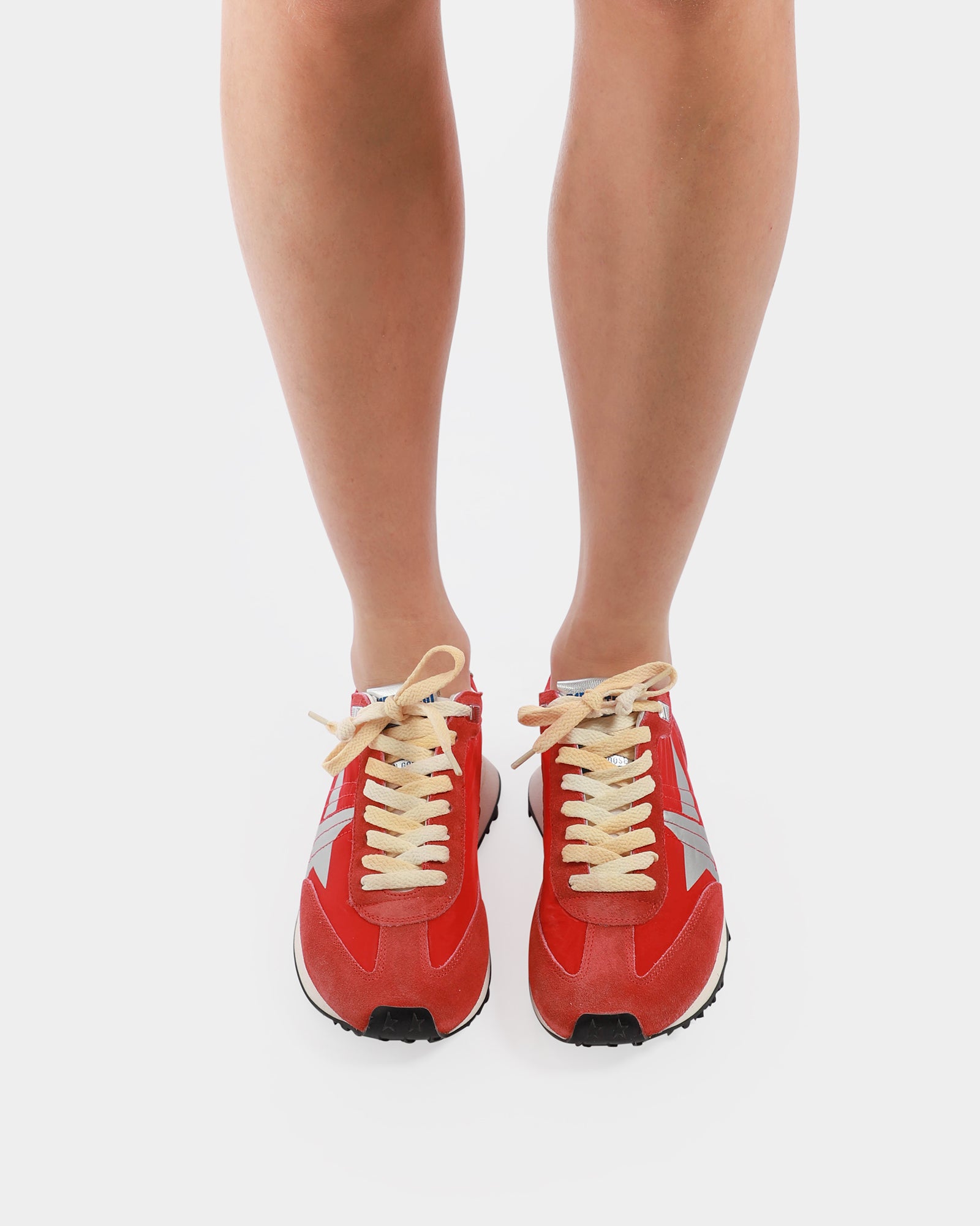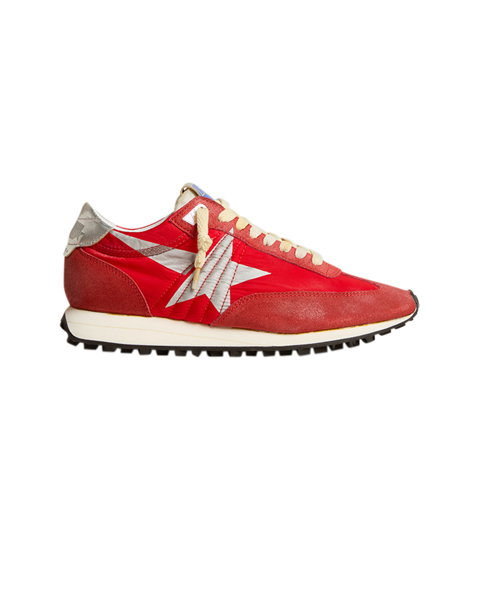 The Running Marathon M77 sneakers are seventies track and field-inspired. They feature a nylon upper, silver star, and a red suede toe. The laces are unevenly-dyed with a starred outsole making a unique impression. Handmade in Italy.