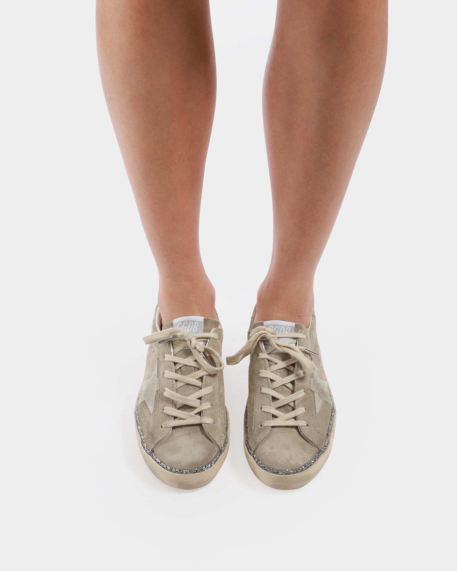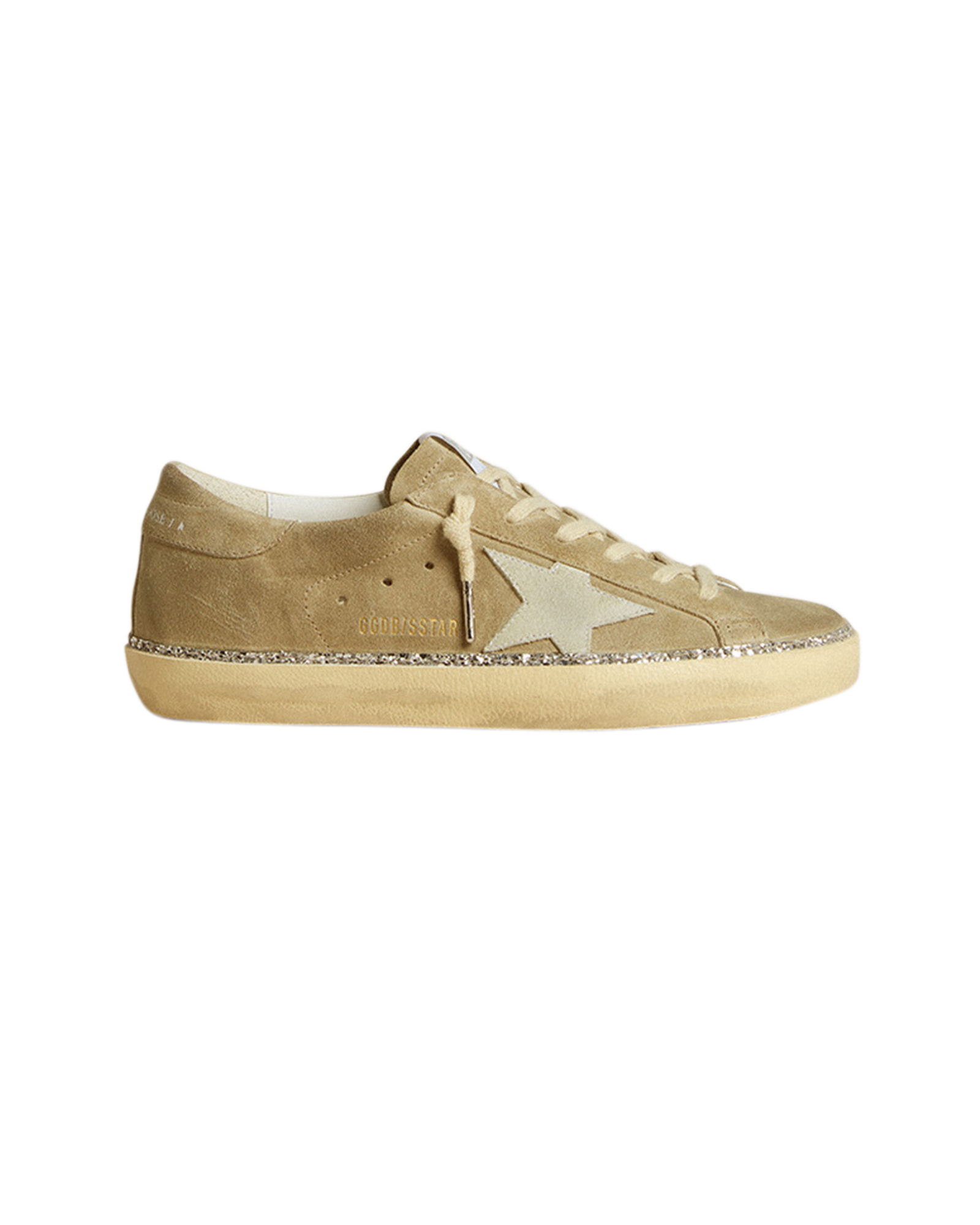 The Super Star Classic With List sneakers feature a beige suede leather upper with distressed finish, a chalk star on side. They have off white laces and a silver glitter finish above the rubber sole. Made in Italy.