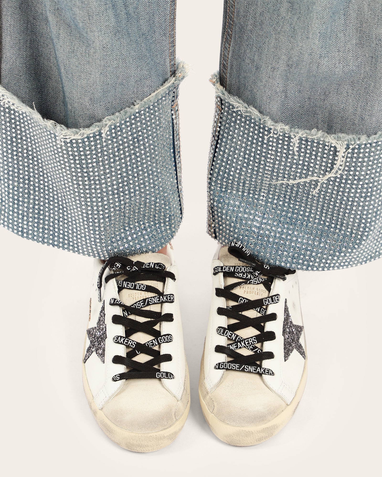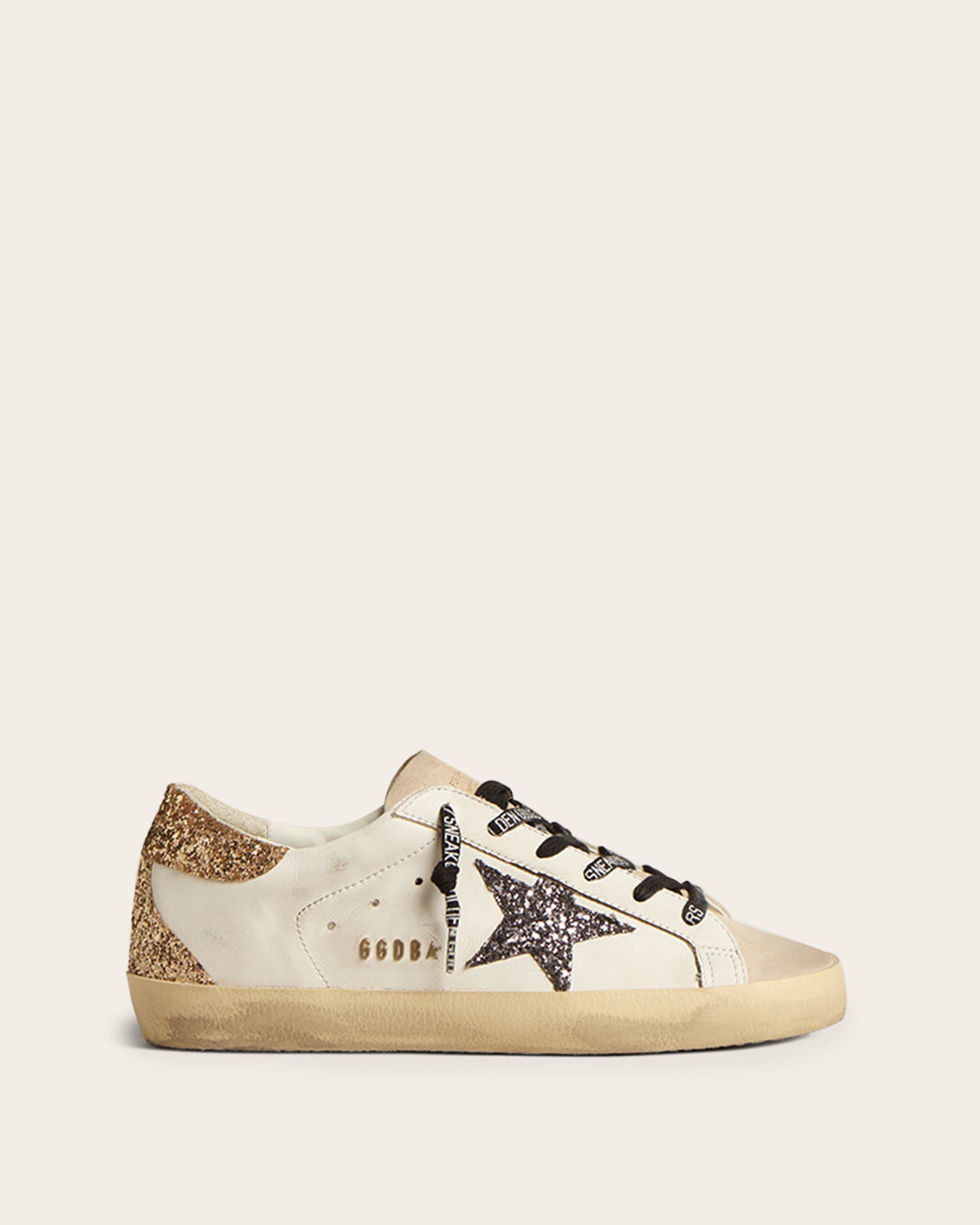 Super-Star Leather Upper Glitter Star Heel And Spur Metal Lettering, featuring an upper distressed look, a gold glitter back heel and a black glitter star on side, black laces with brand name and distressed rubber sole. Made in Italy.