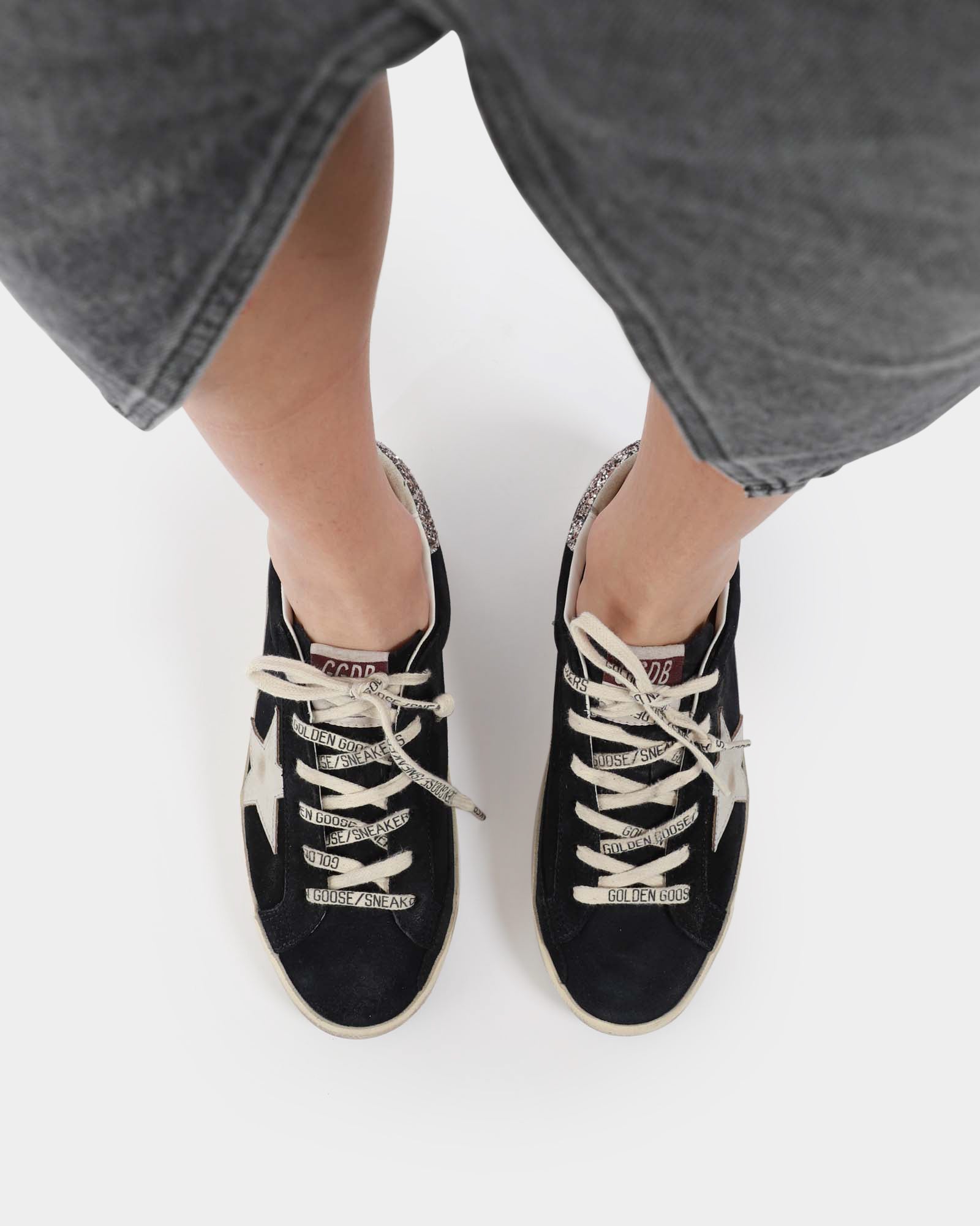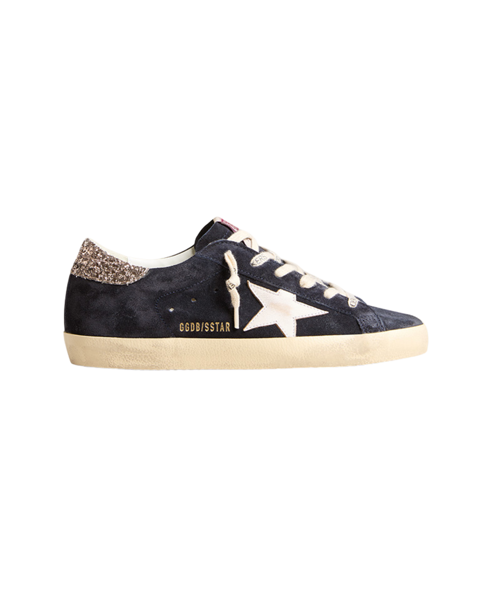 The Golden Goose Superstar Classic sneaker features cow leather suede, finished with star and glitter detailing and branded accents throughout.