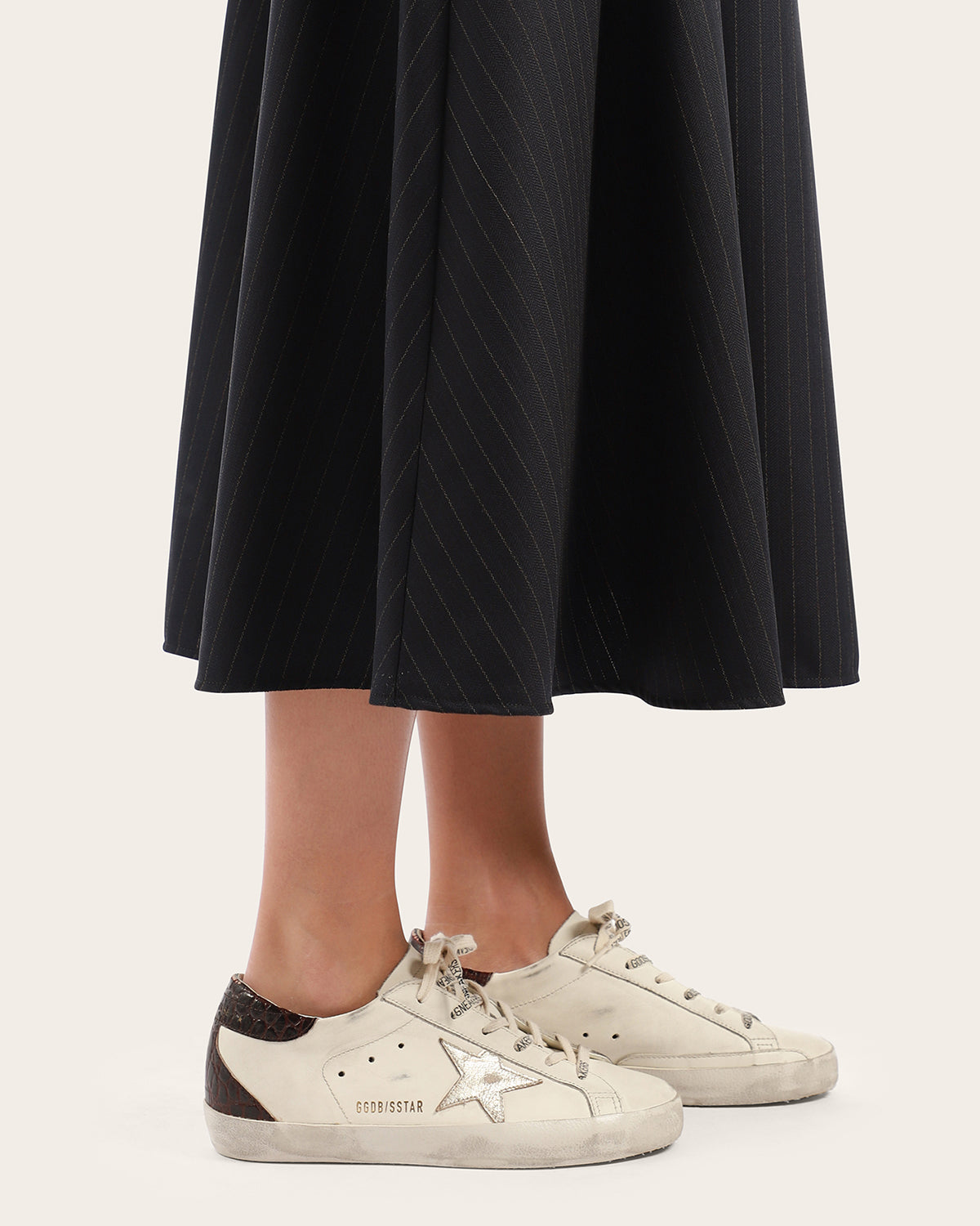 The Superstar Cocco sneakers, feature white upper calfskin leather, laces with Golden Goose writing on it, shiny star, back heel in crocodile print, classic distressed details all over. Made in Italy.