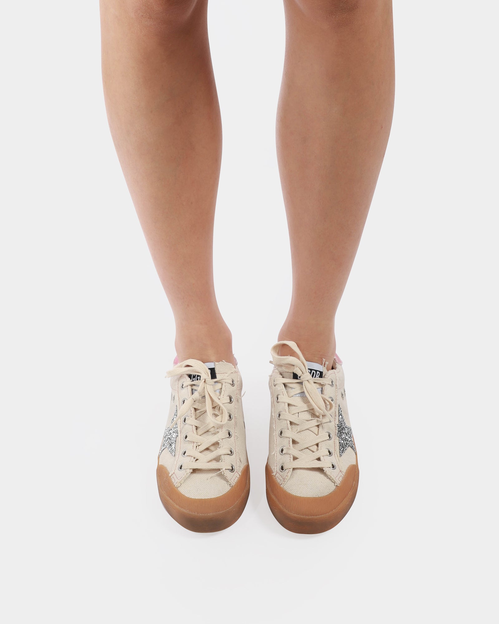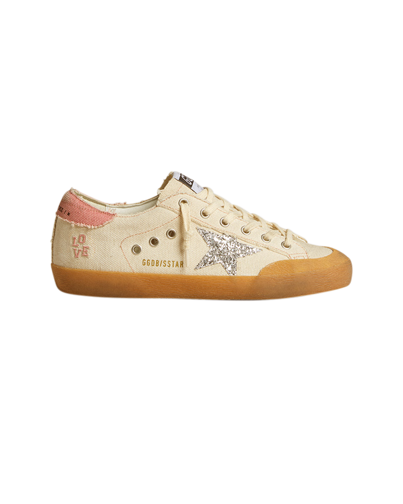 • The Superstar Penstar Classic With List sneakers, feature an off white canvas upper and a pink heel. The sneakers have a silver glitter star on side, a 'LOVE' embroidered detail and a contrast rubber sole. Made in Italy.
