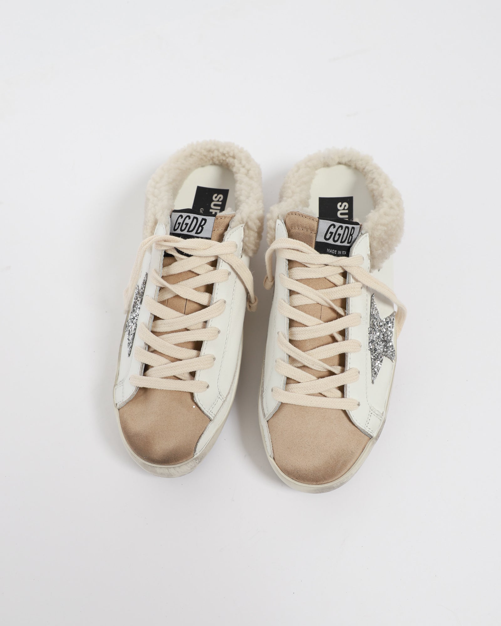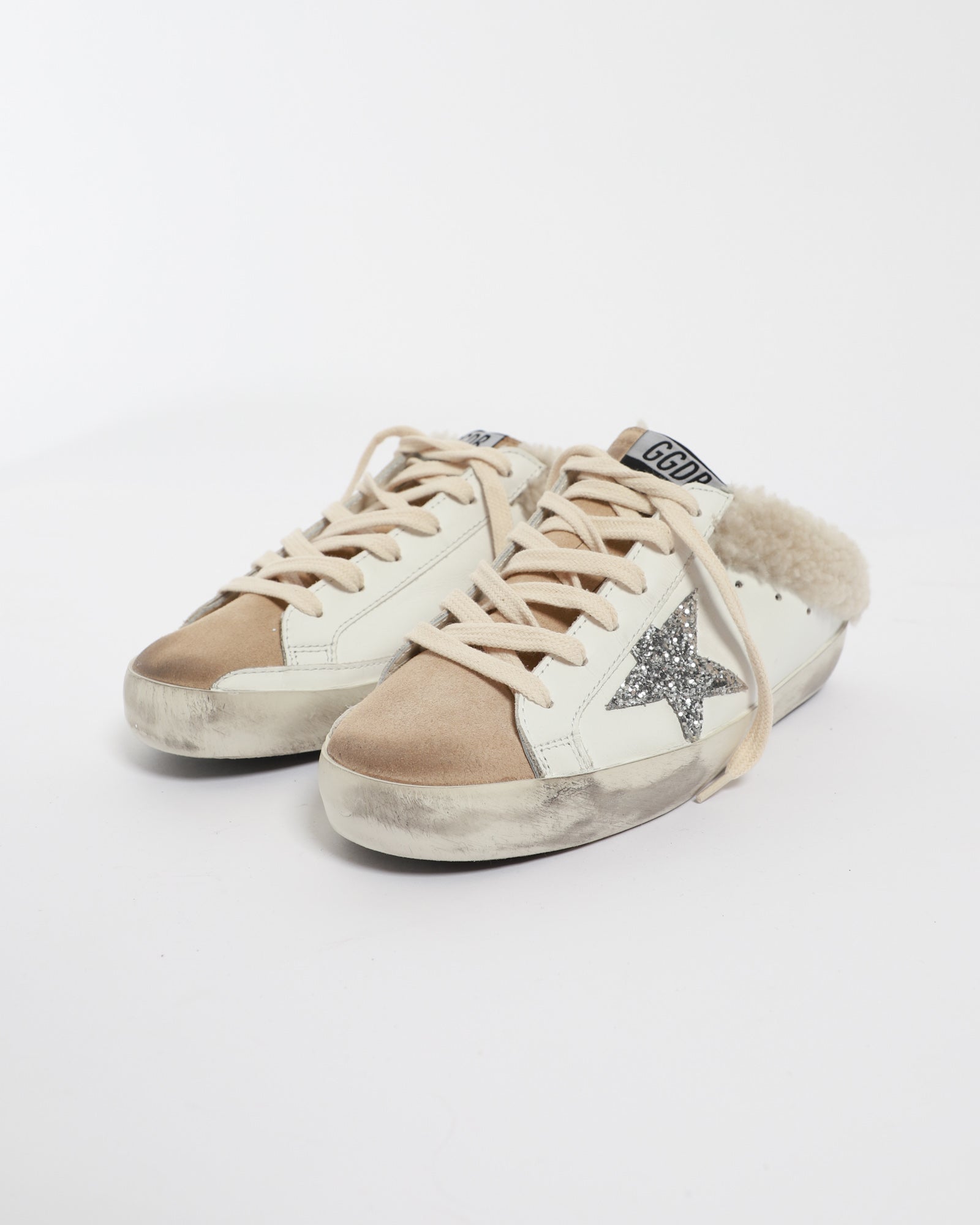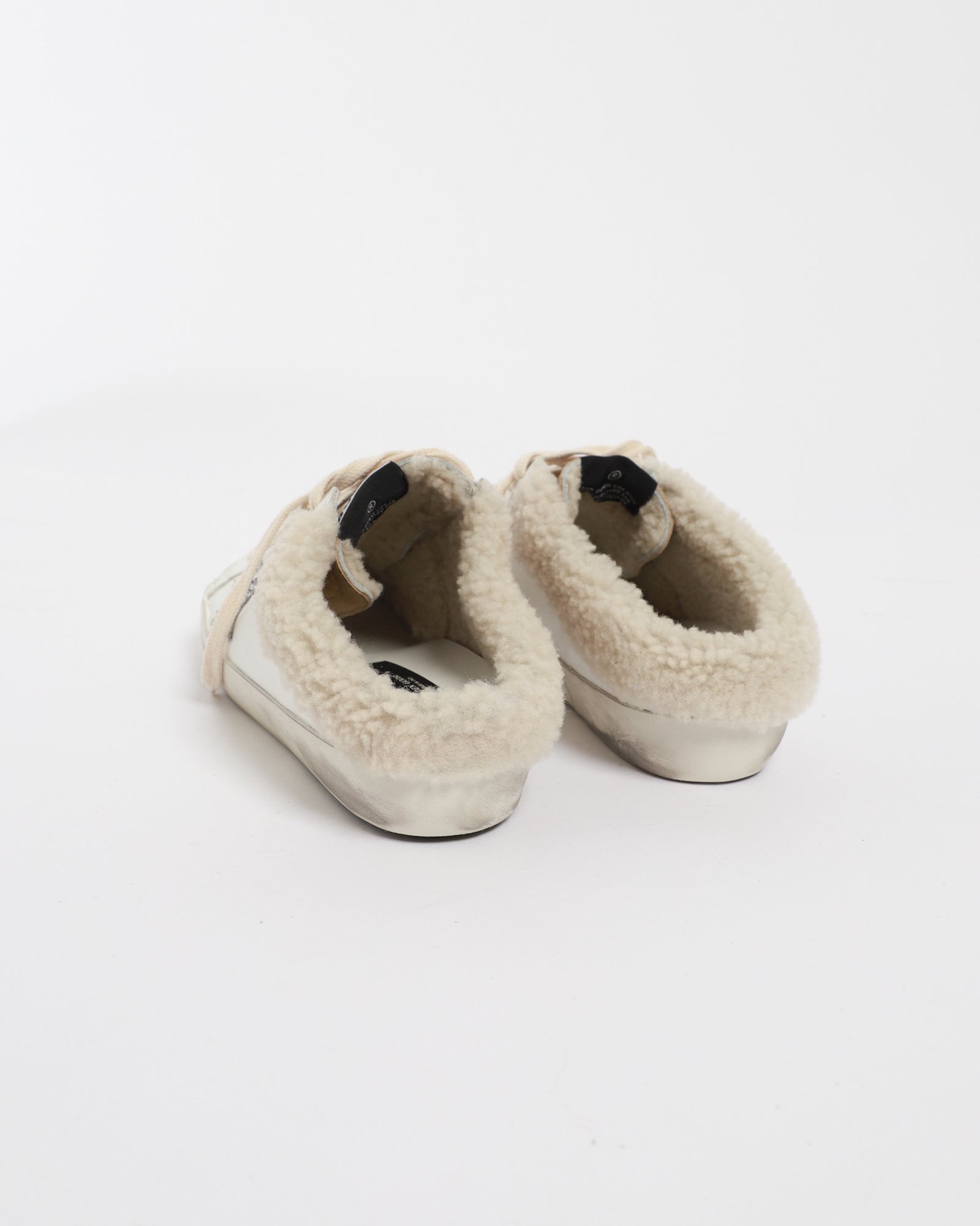 Golden Goose Superstar Superstar Sabot are a new take on the brand's iconic Superstar Sneakers, designed with a removed back to create a slip-on style. Crafted in a white leather upper and lined with cream-coloured shearling, this pair feature a silver glitter star appliqué and gold logo print. Finished with grey laces and signature pre-scuffed mid-sole and toe.