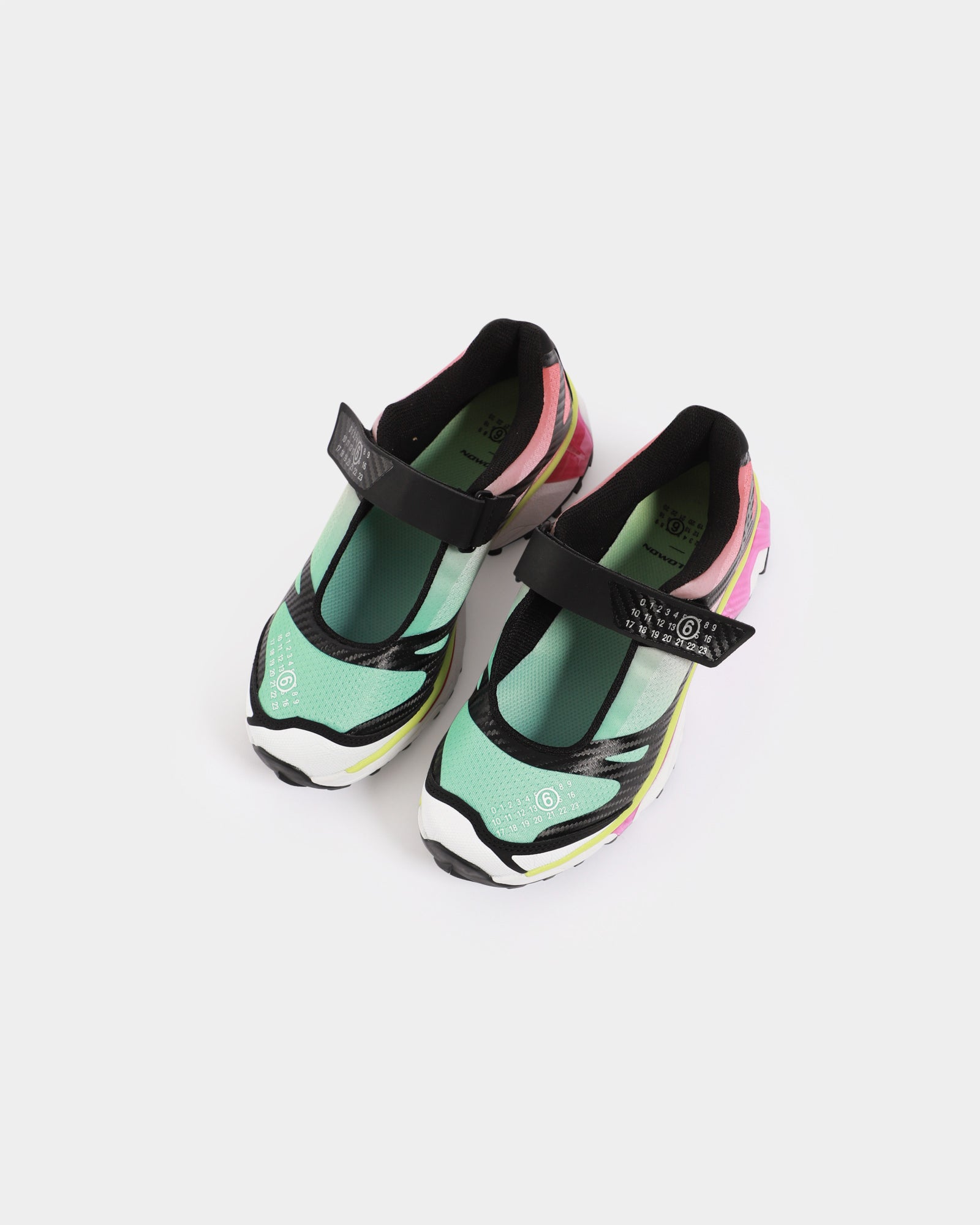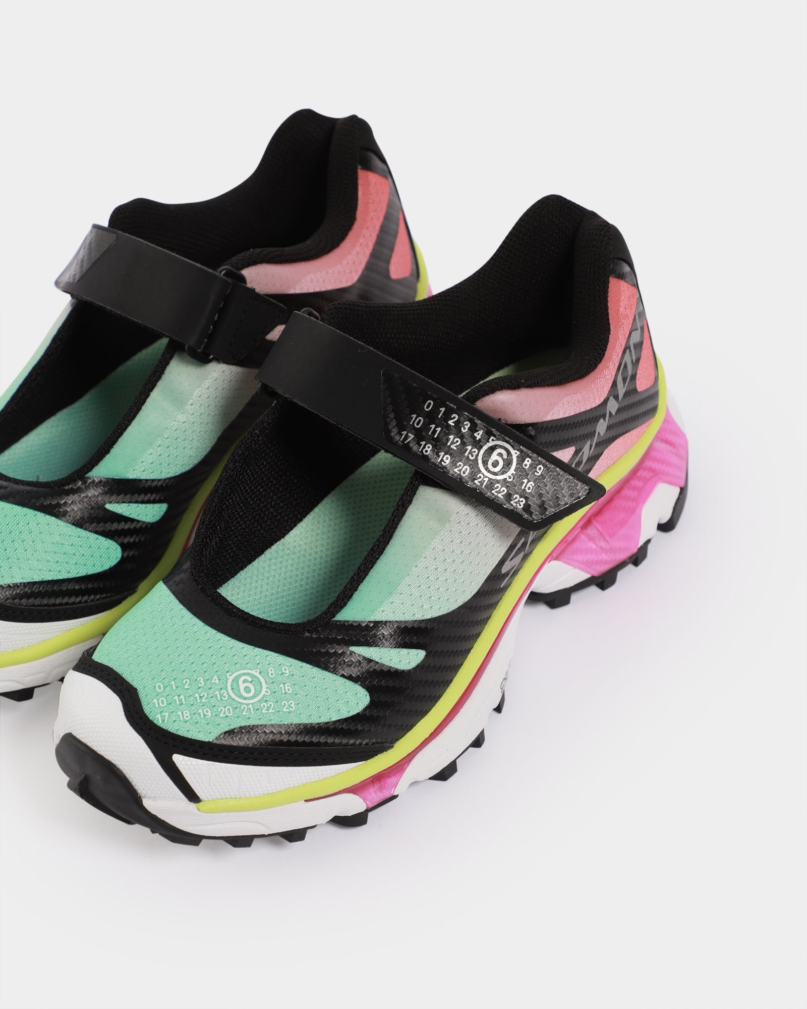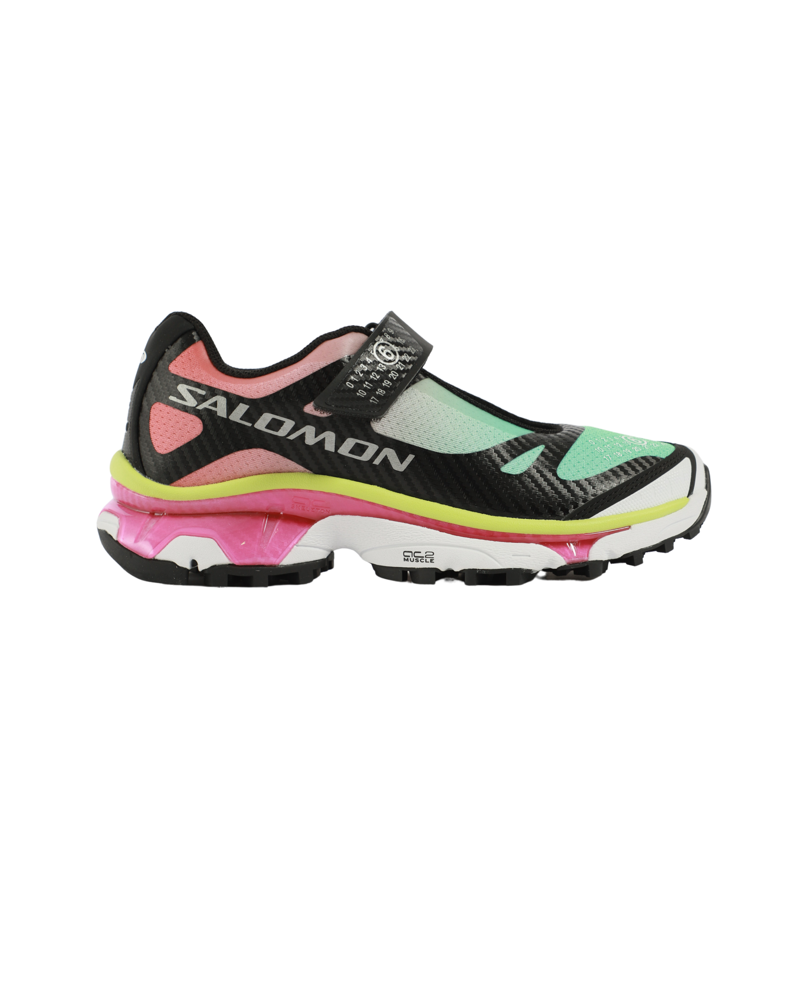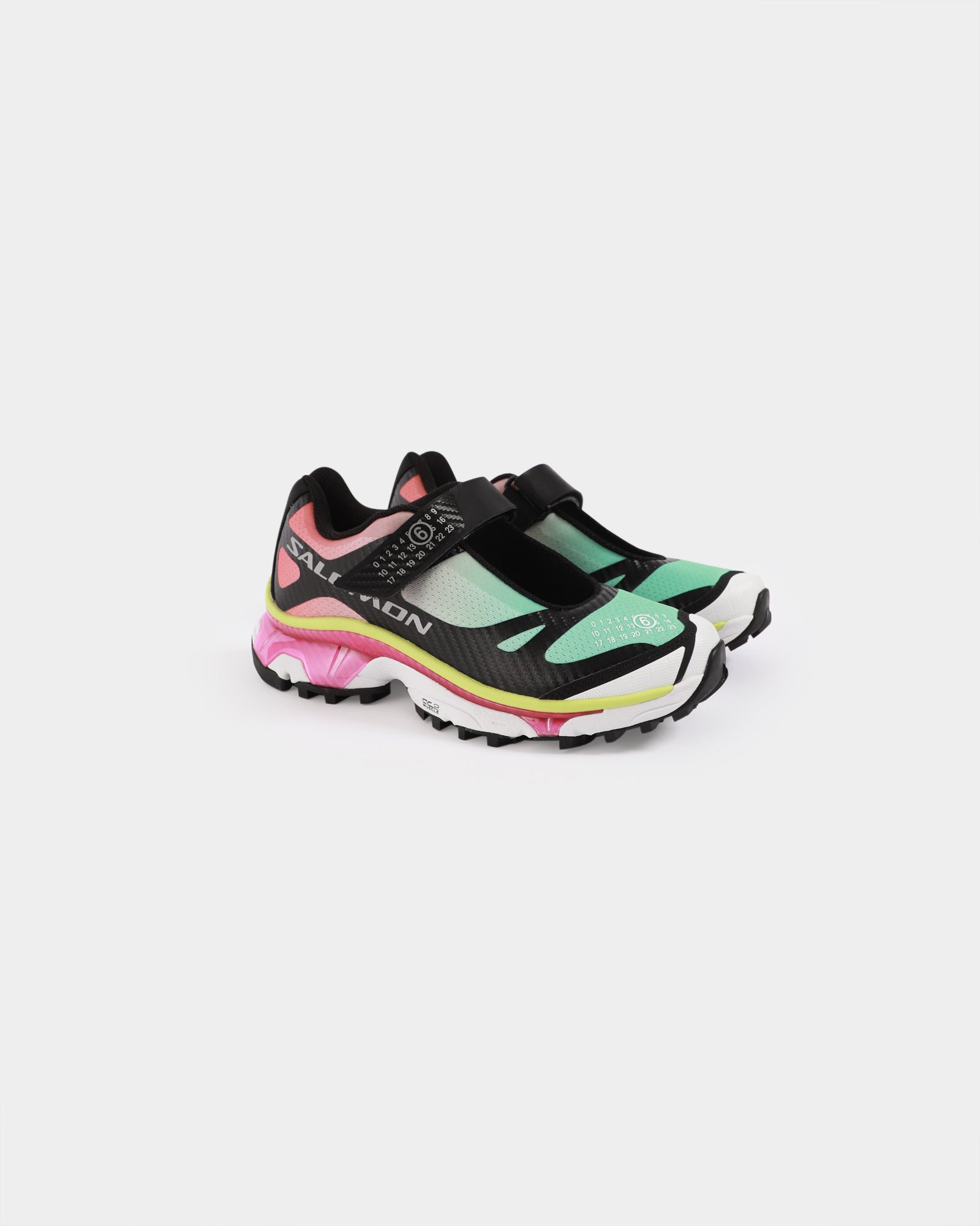 The XT-Mary J MM6 Maison Margiela / Salomon Sneaker features a classic round toe, a velcro strap closure with branding on the inner sole, outer toe and strap.
