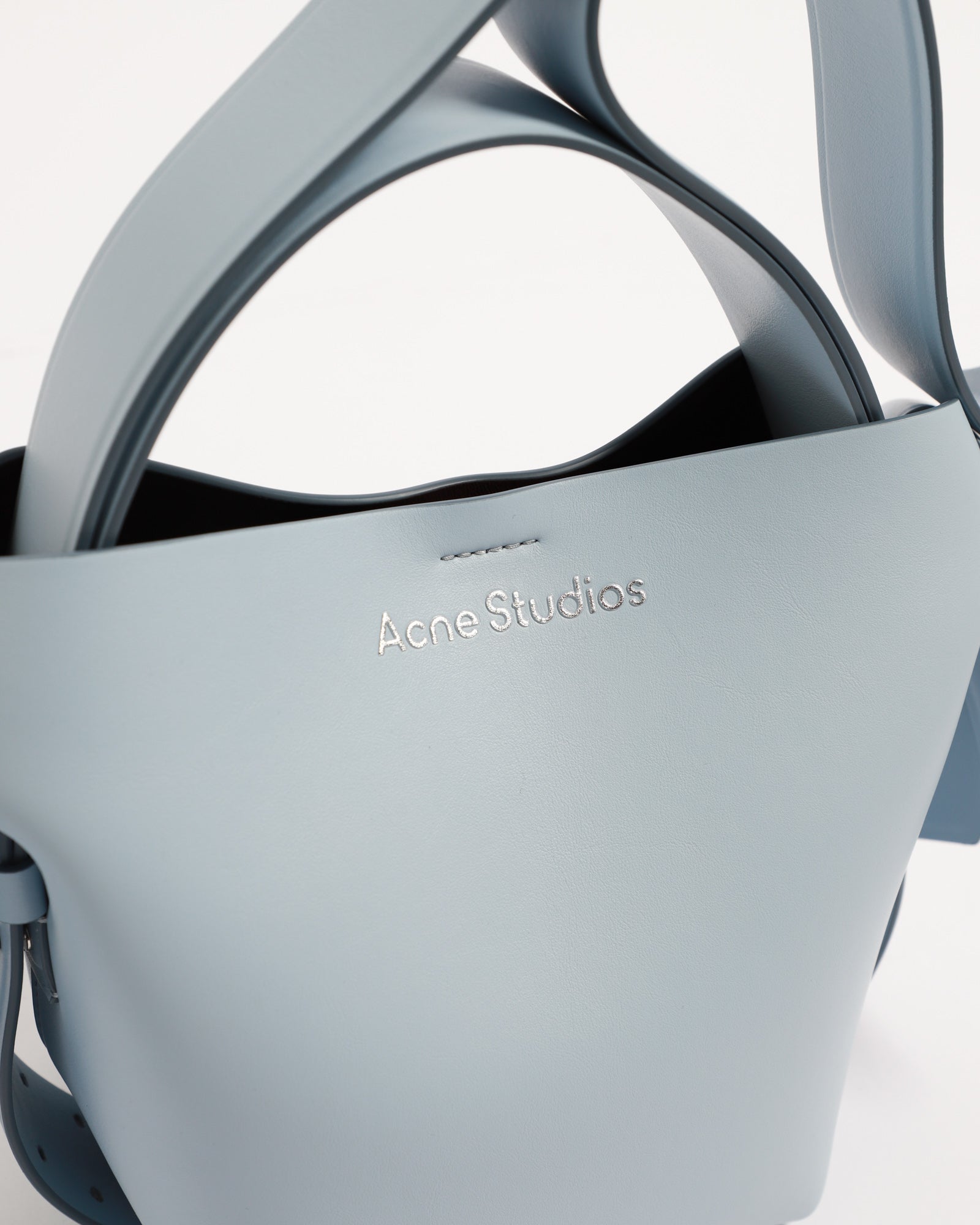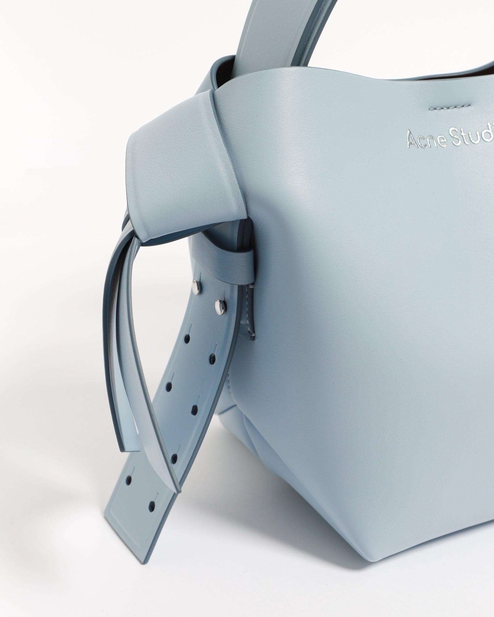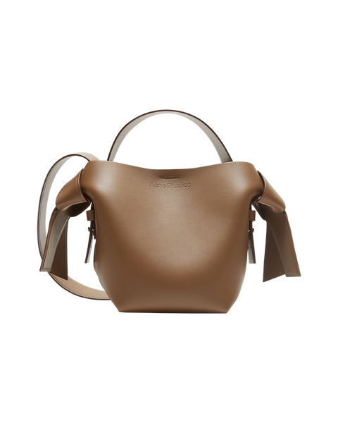 An Acne Studios mini shoulder bag, adorned with twisted musubi knots on each side, inspired by traditional Japanese obi sashes. Crafted from soft leather, detailed with an embossed Acne Studios logo.