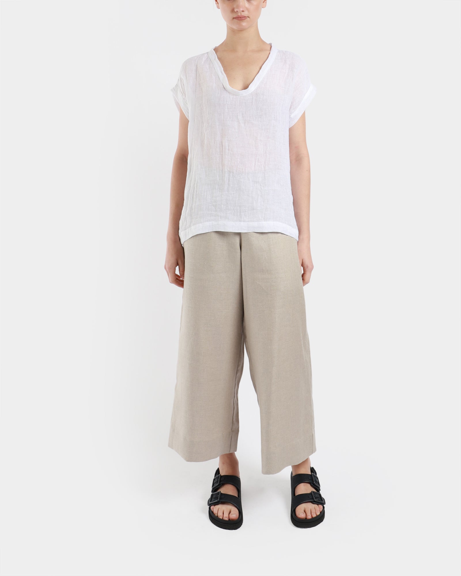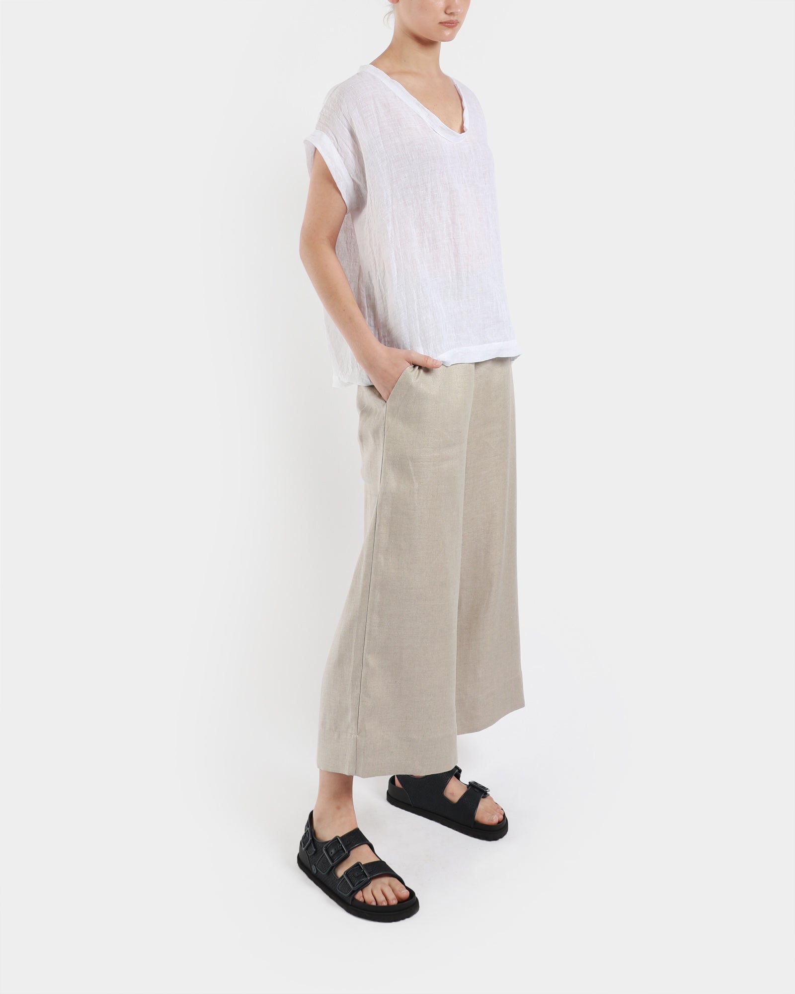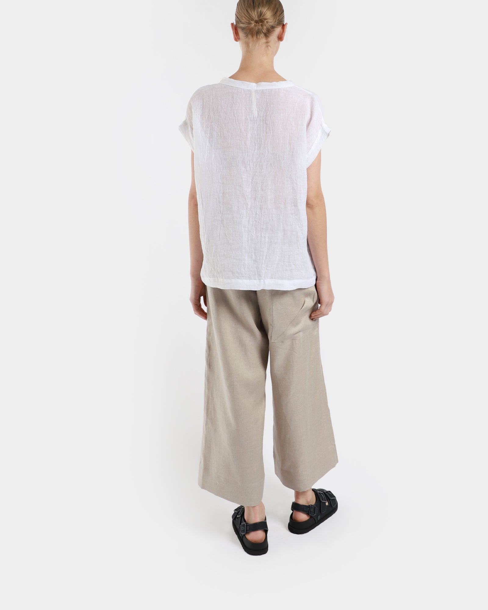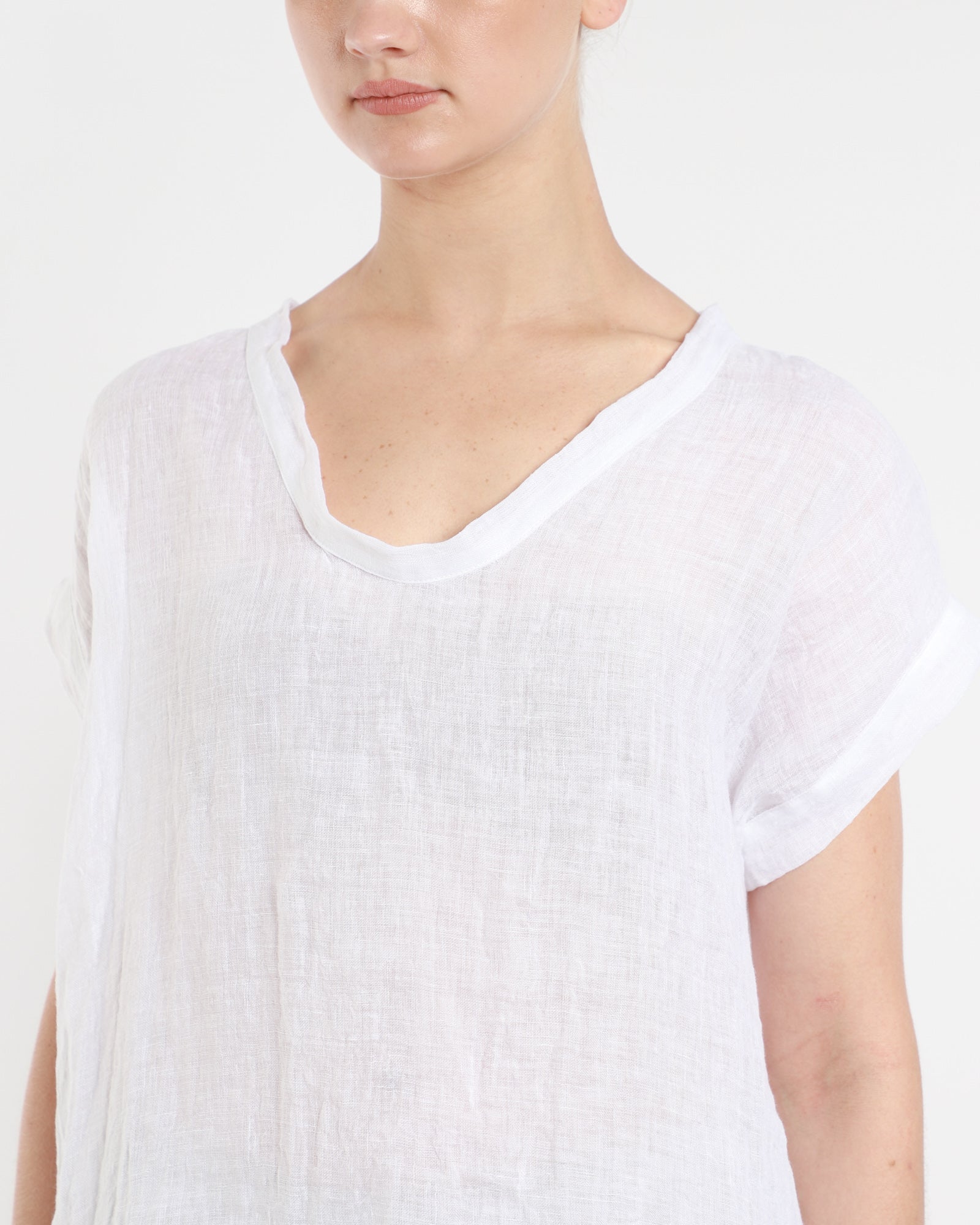 This airy gauze linen top has a delicate V-neckline and relaxed batwing sleeves. It's made from a slightly sheer linen fabric that is lightweight in feel, and has a subtle dropped back hem and shoulder. Made in Australia.