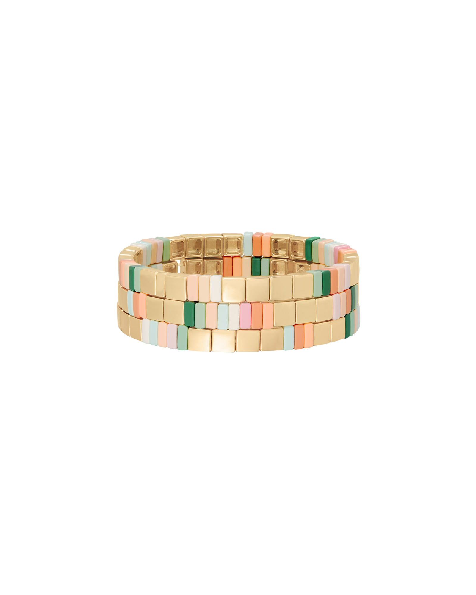 A set of three bracelets strung with an array of enamel and gold-tone beads. Easy to slip on and off and mix and match.