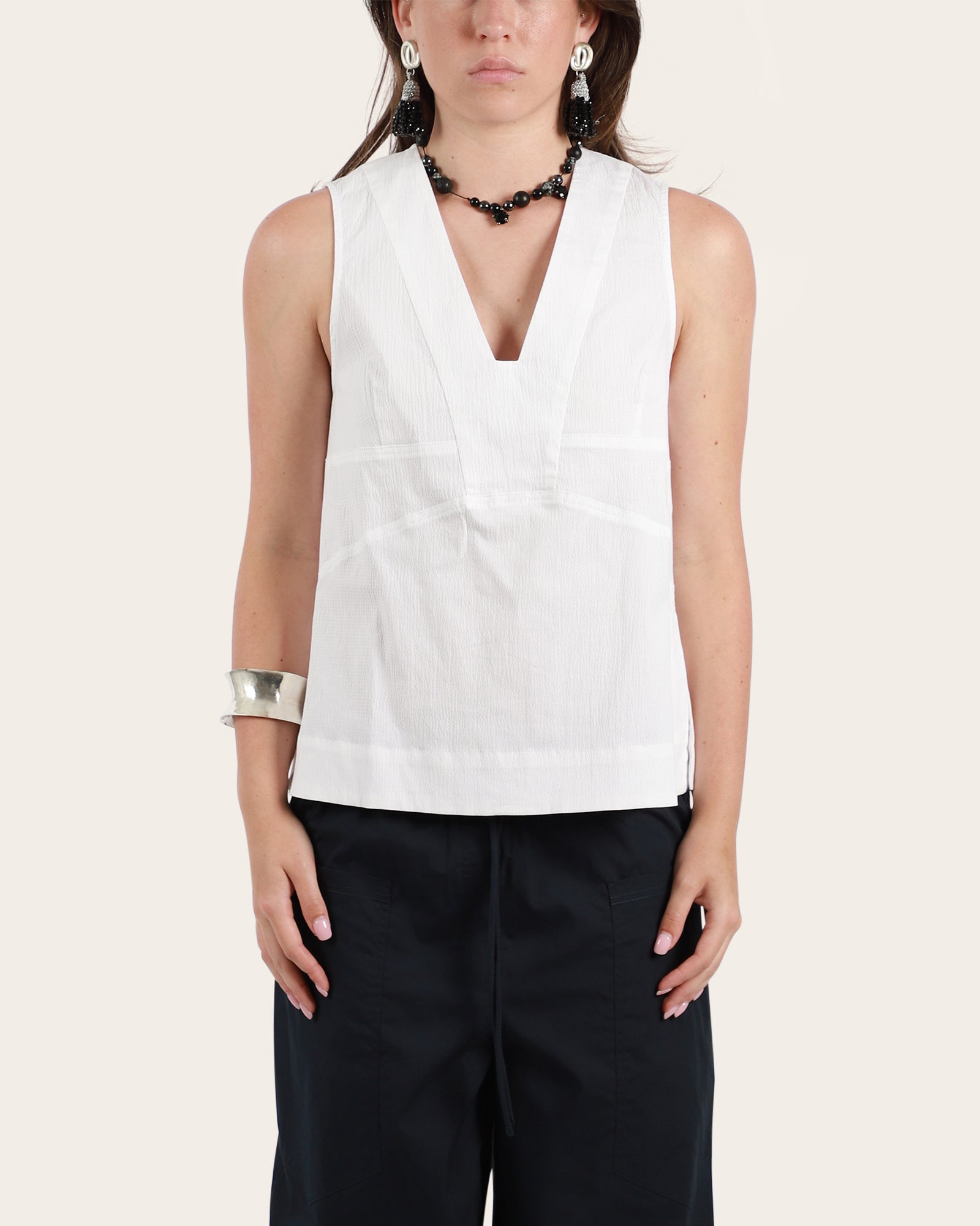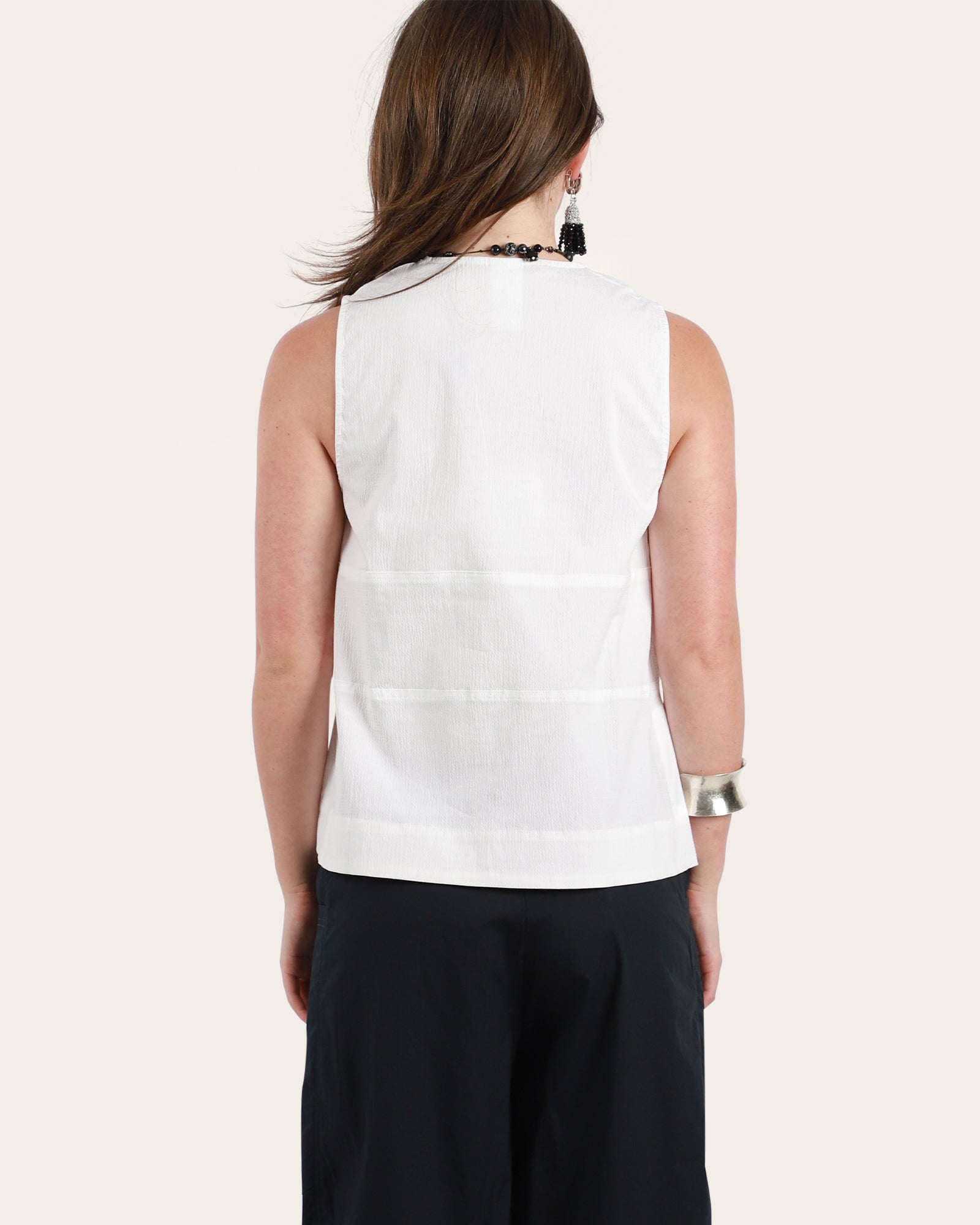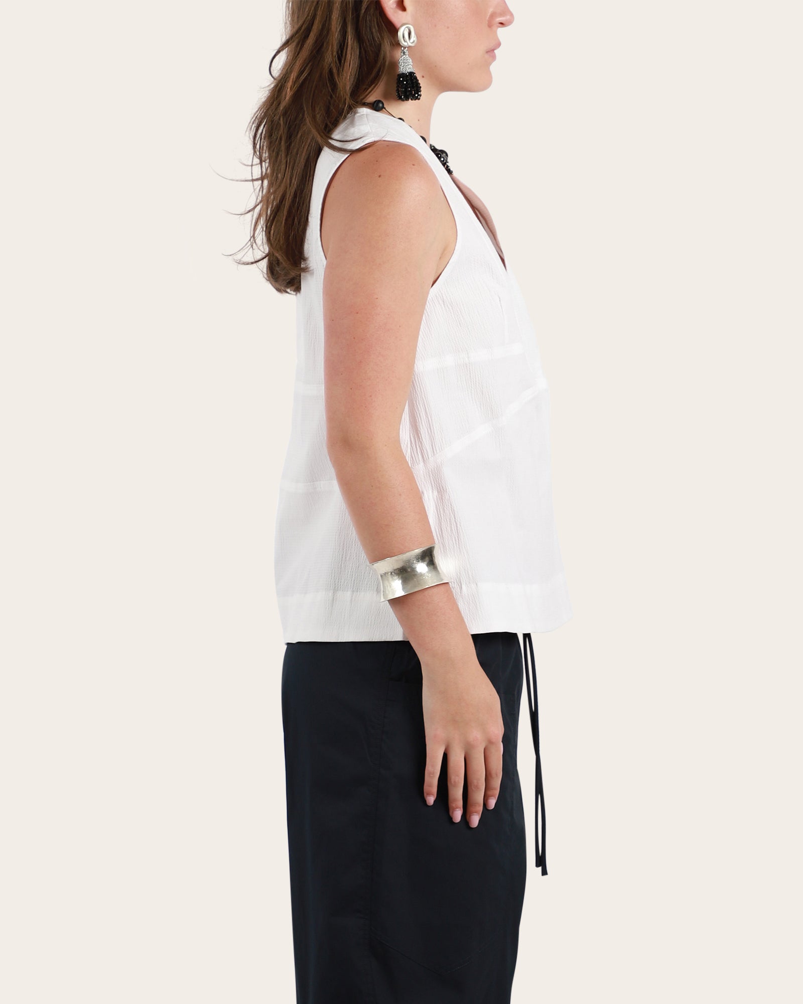 • A refined expression of minimalism, this sleeveless top is crafted from lightweight cotton seersucker for subtle texture and ease. A deep V-neckline is balanced by precise seamwork that shapes the silhouette, while side splits allow for fluid movement. Clean lines and a pared-back cut make it an effortless layering piece—directional yet versatile, and true to Foemina’s considered approach to everyday dressing.