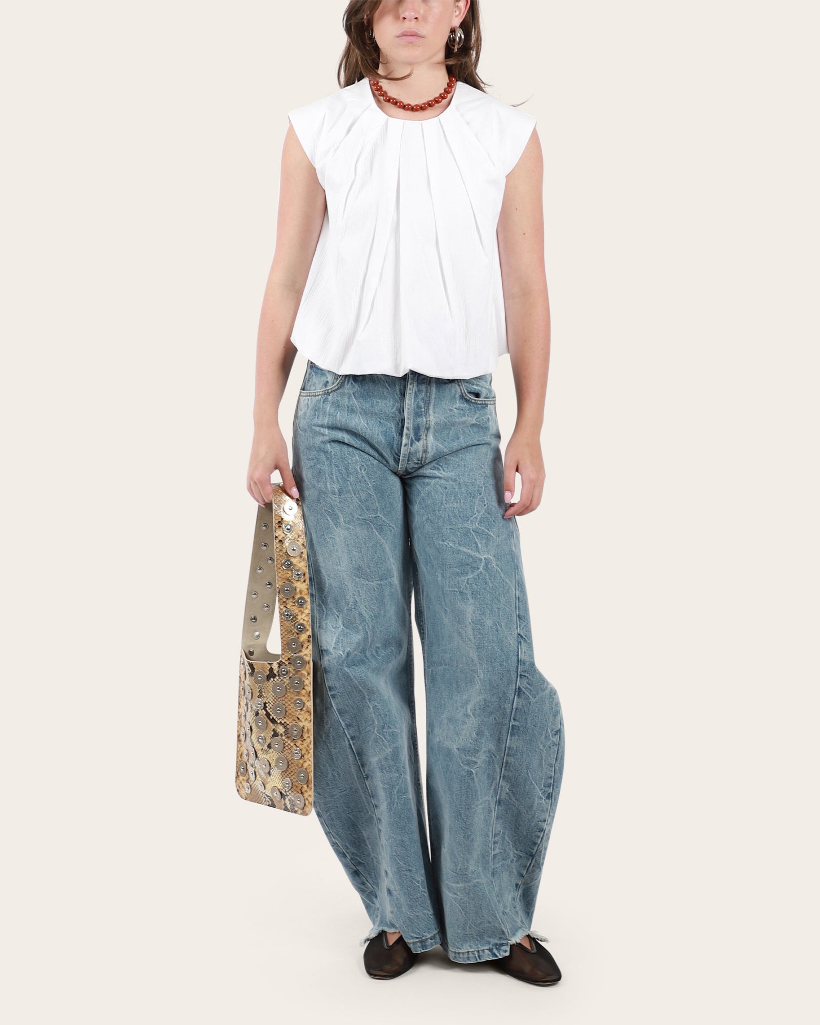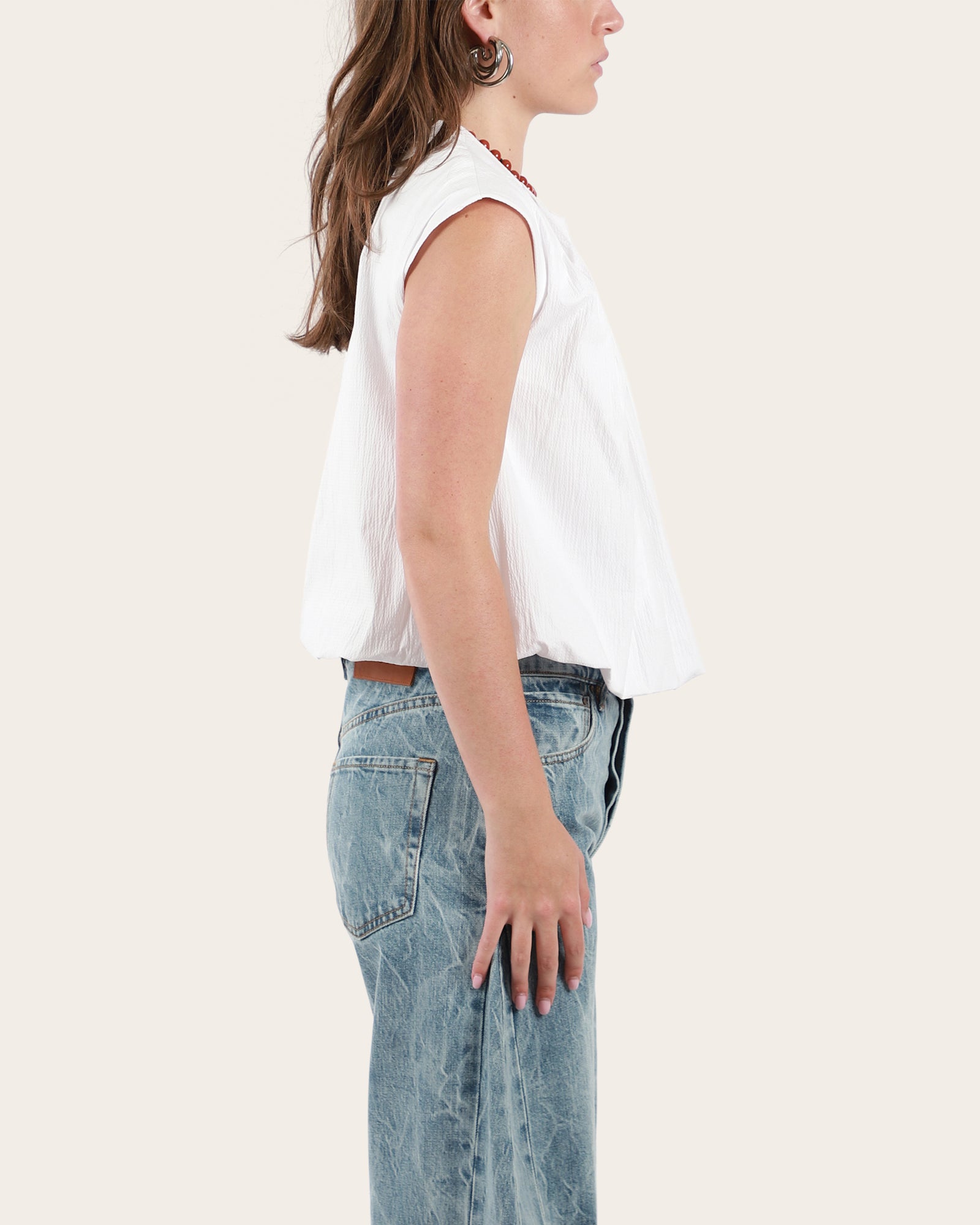 This sleeveless top features soft gathers at the neckline that create gentle volume through the body. A bubble hem adds shape and ease, while a delicate button-and-loop closure at the back offers a refined finishing touch. Effortlessly minimal, the silhouette balances structure with fluidity.