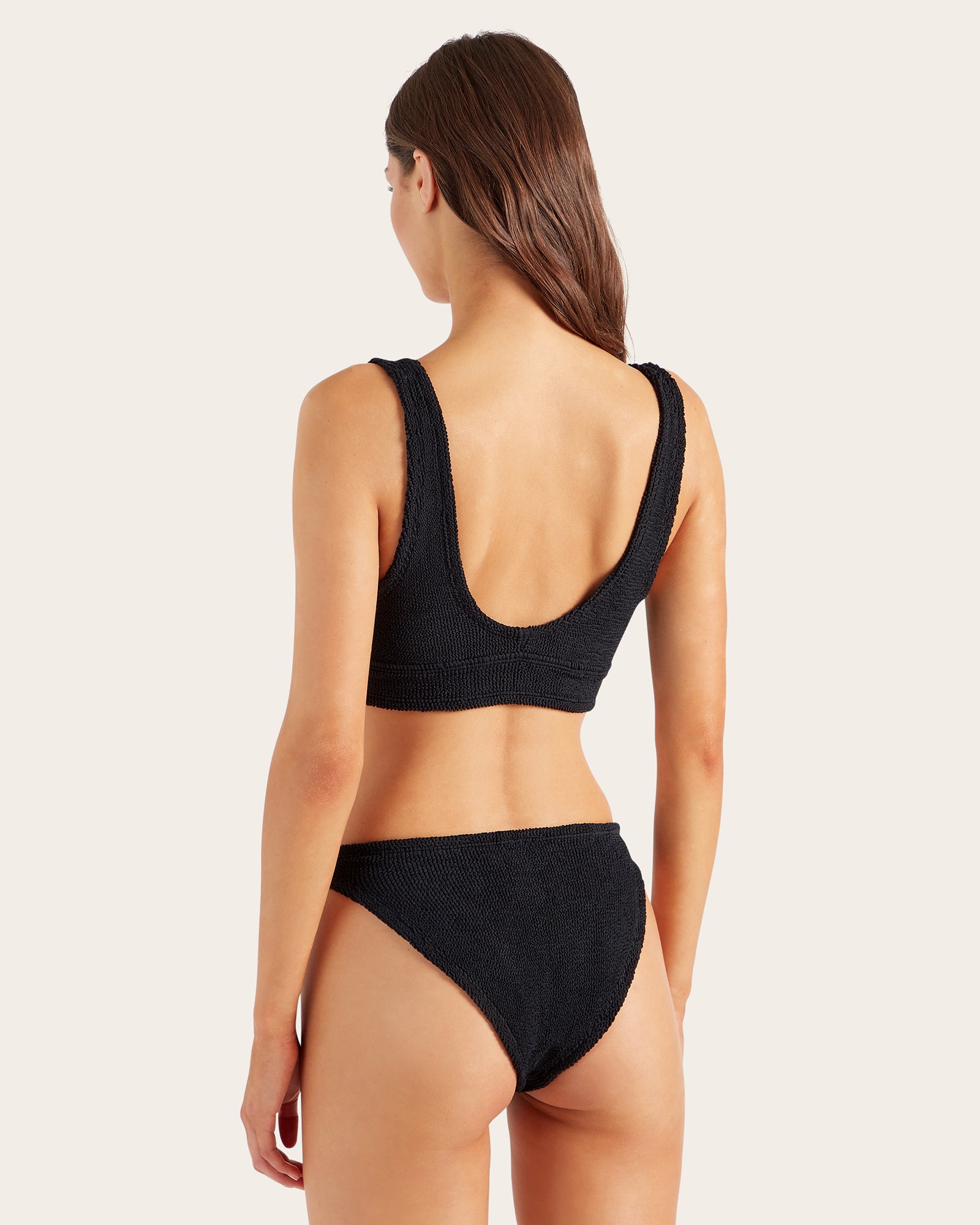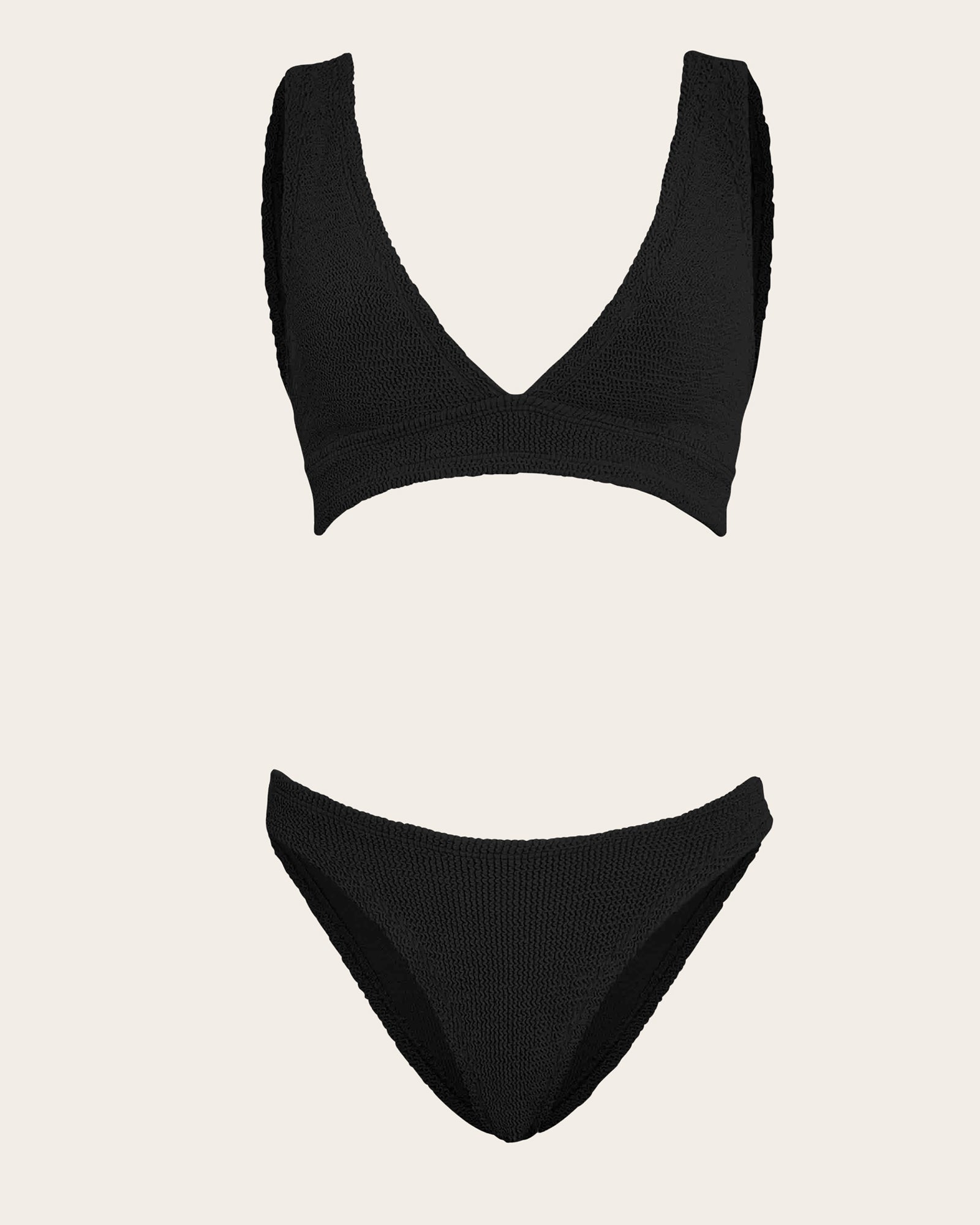• A two pieces bikini, featuring a deep v neckline, thick straps and low back with a classic bottom coverage.