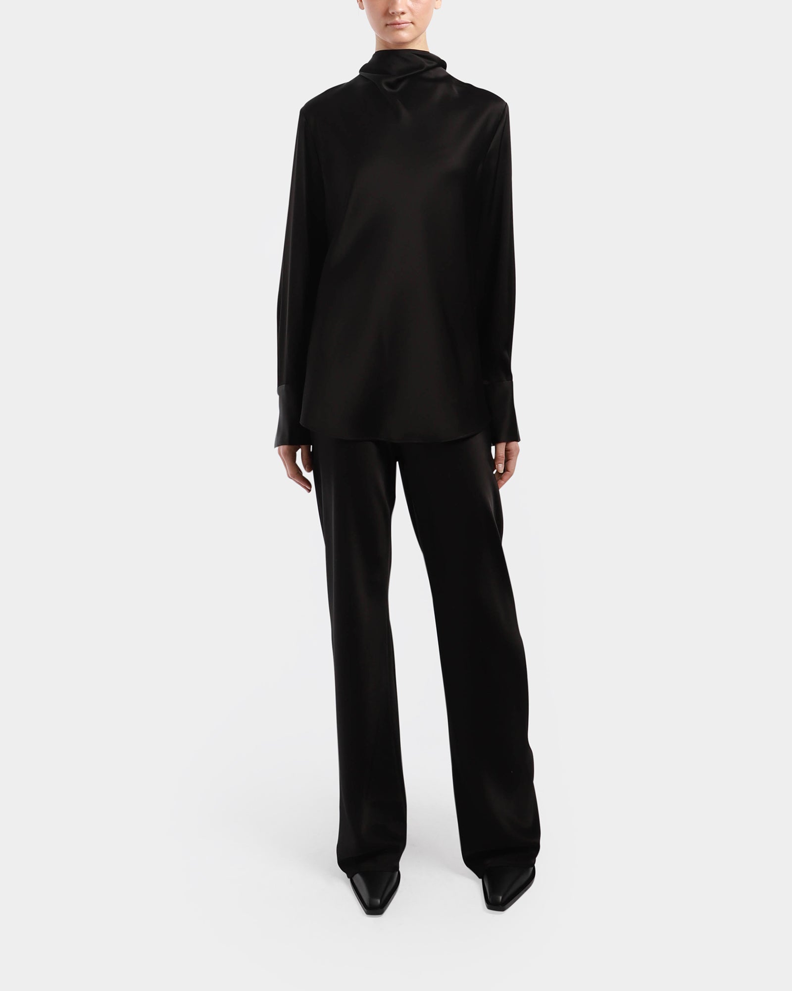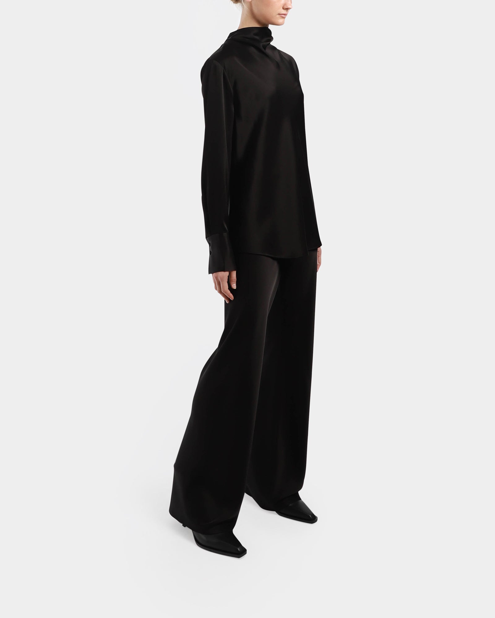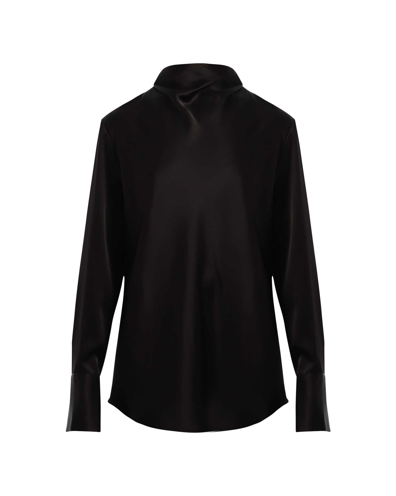 This elegant shirt is made from Japanese triacetate which is offering a fluid and drape shape. It features a cowl neck, wide cuffs and a centre back with double button to close.