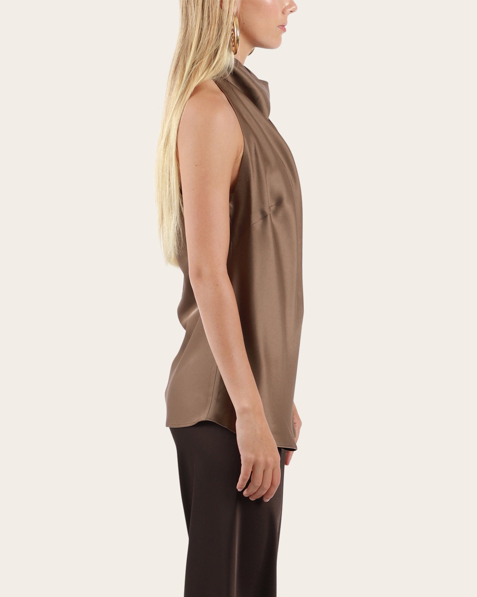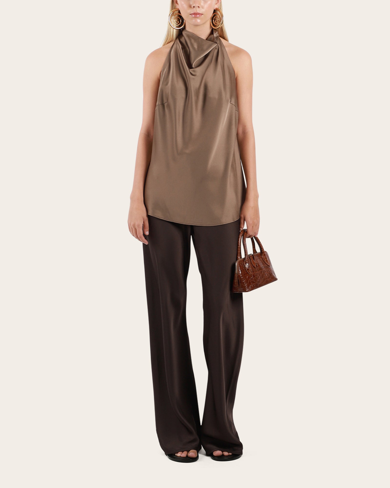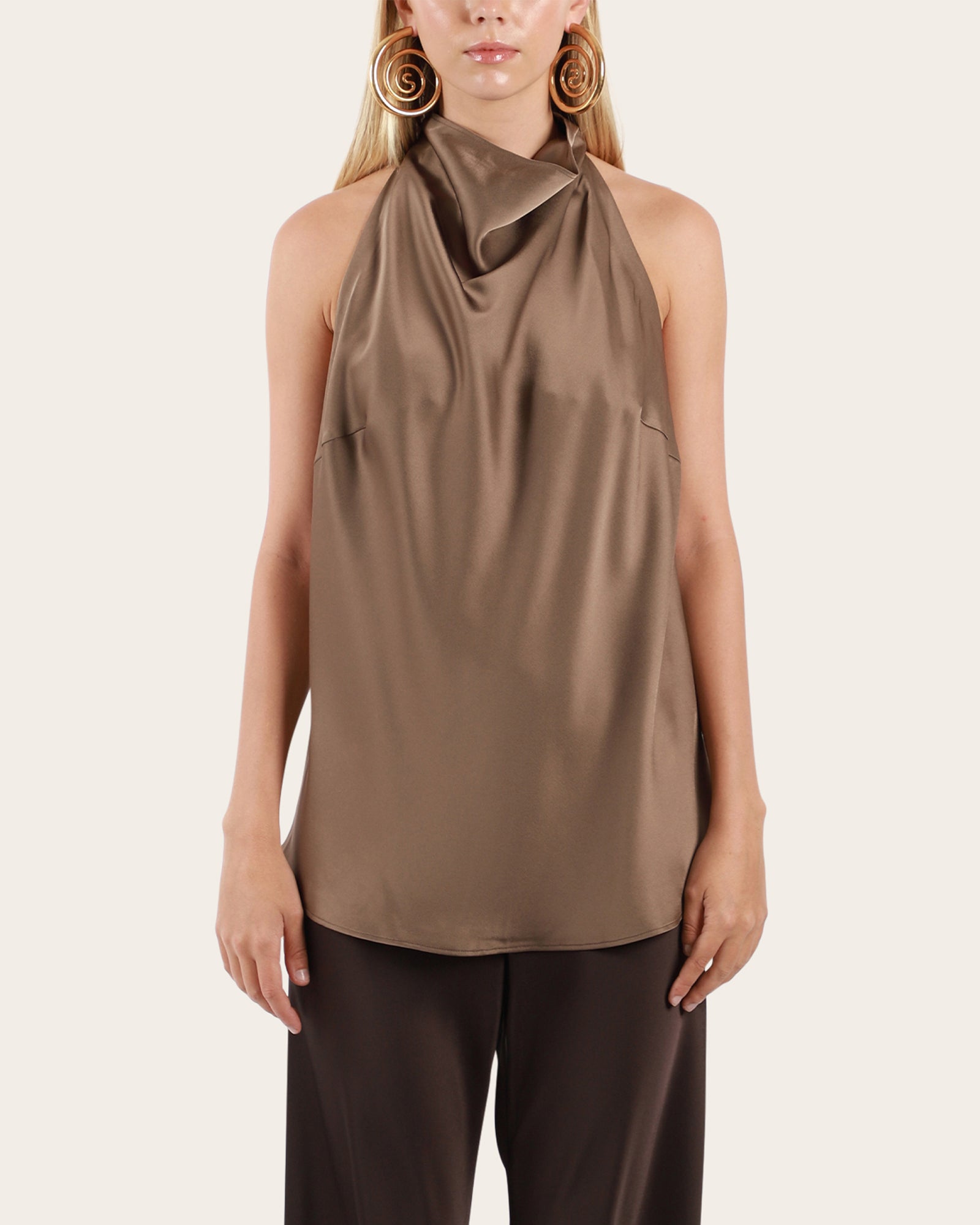 The Alfen Top is an elegant halter-neck silhouette, cut on the bias from premium Japanese triacetate for a fluid, flattering drape. Finished with two self-covered buttons at the back neck for a clean, refined closure.