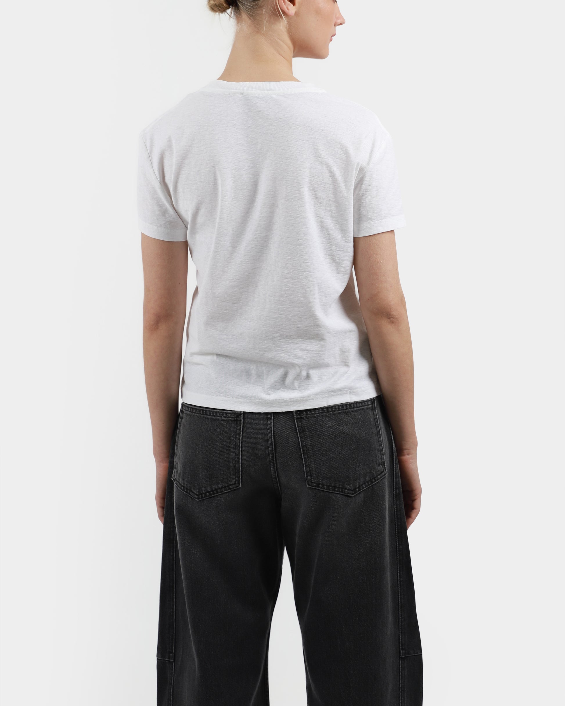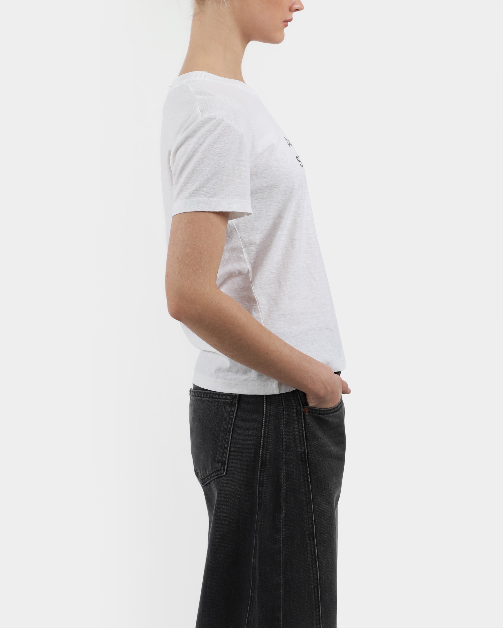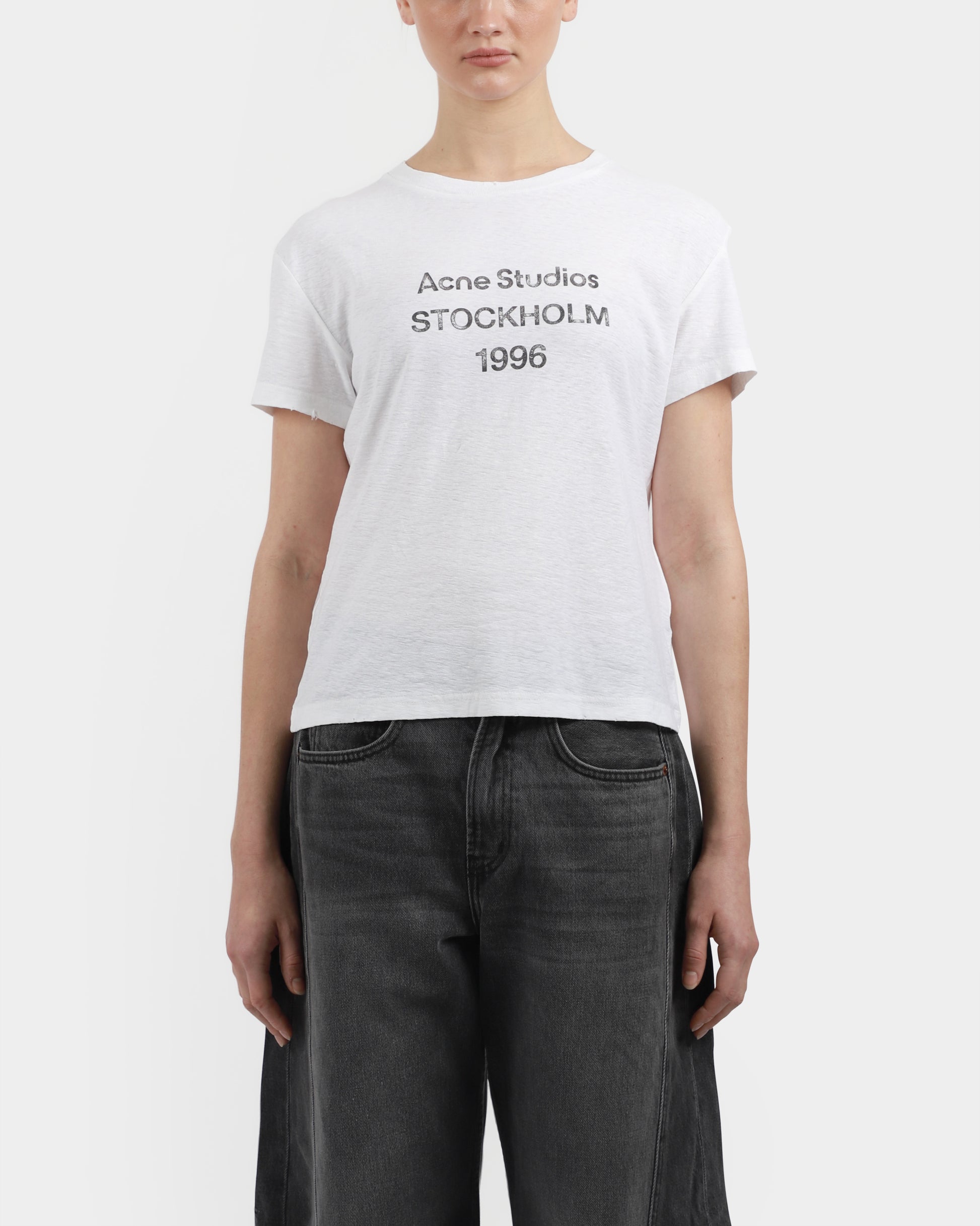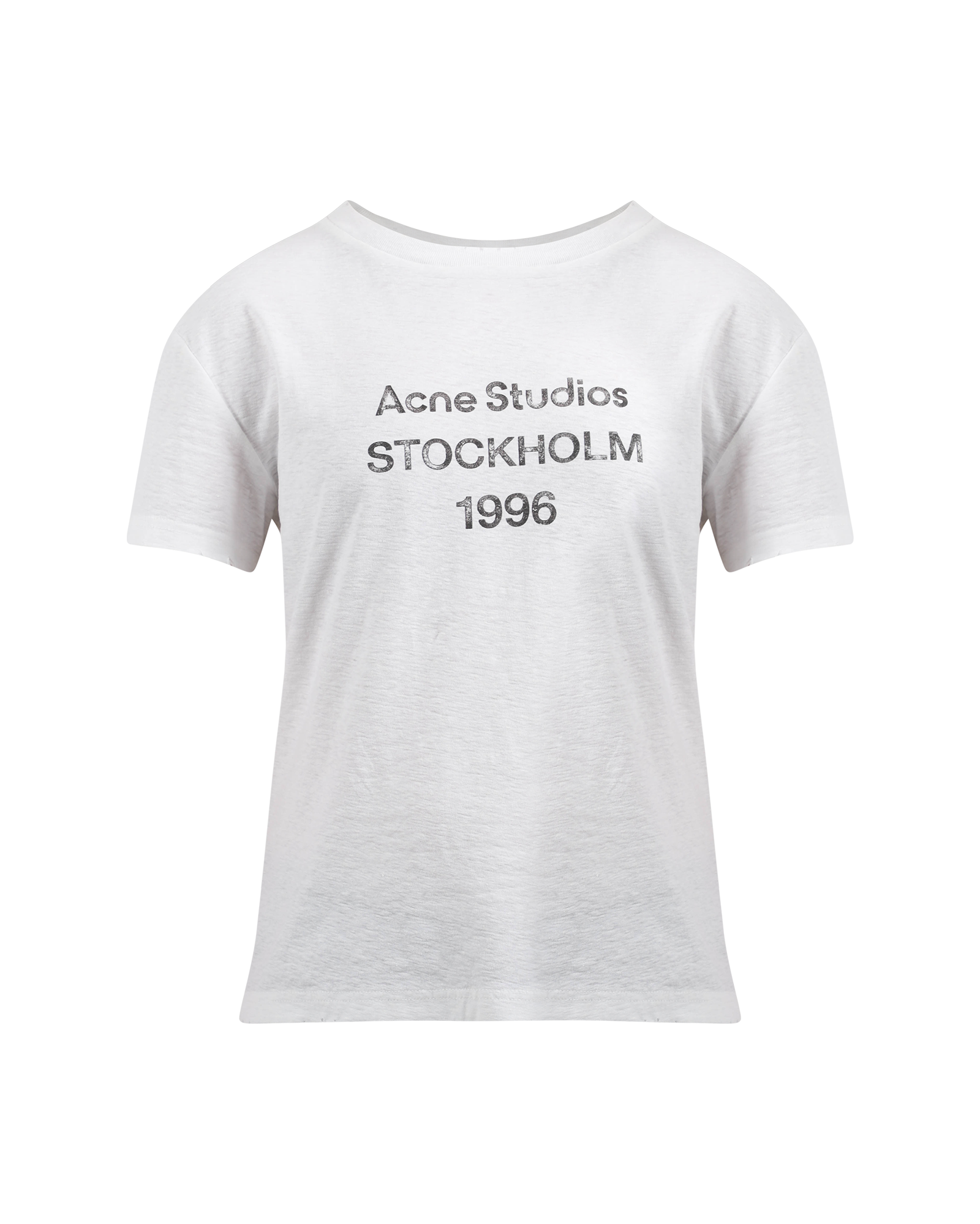 A crew neck tee with Acne Studios 1996 logo and distressed trim. Made from organic cotton-hemp blend in a regular, hip-length fit.