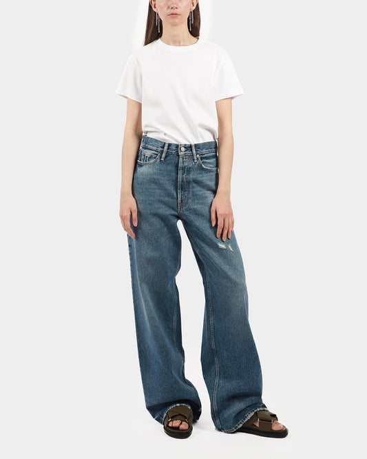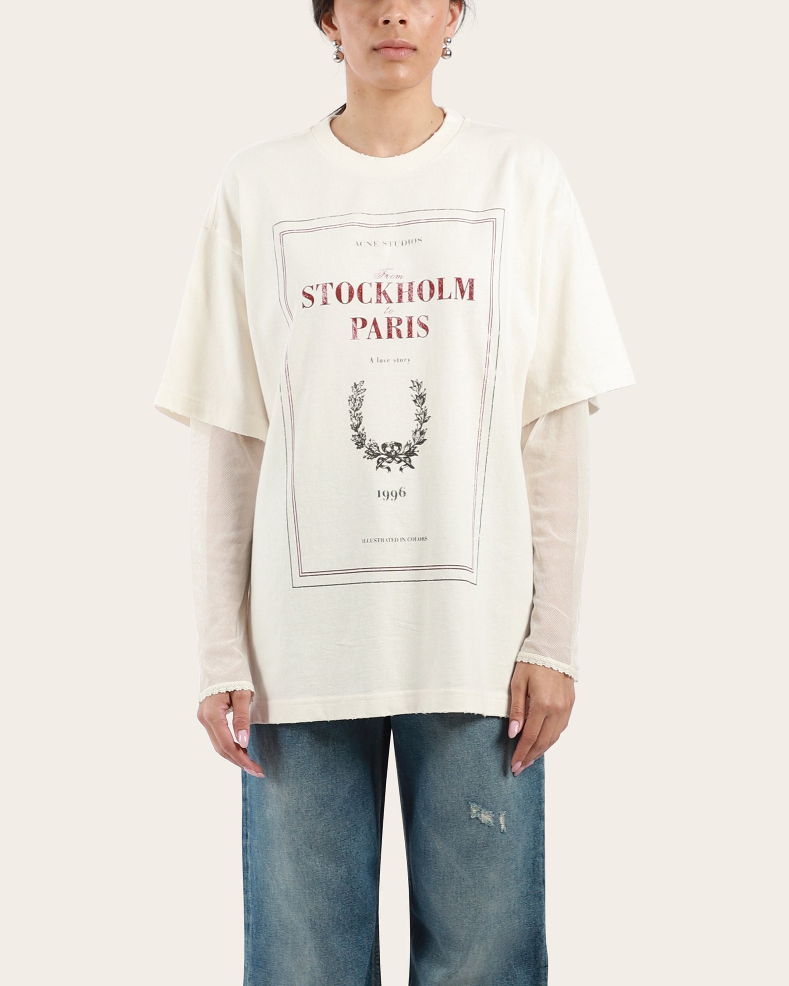 Cotton jersey long sleeve T-shirt with a vintage look, mesh lace underlayer, and Acne Studios seasonal front artwork. It features distressed edges, relaxed fit, and below hip length style. Made in Portugal.