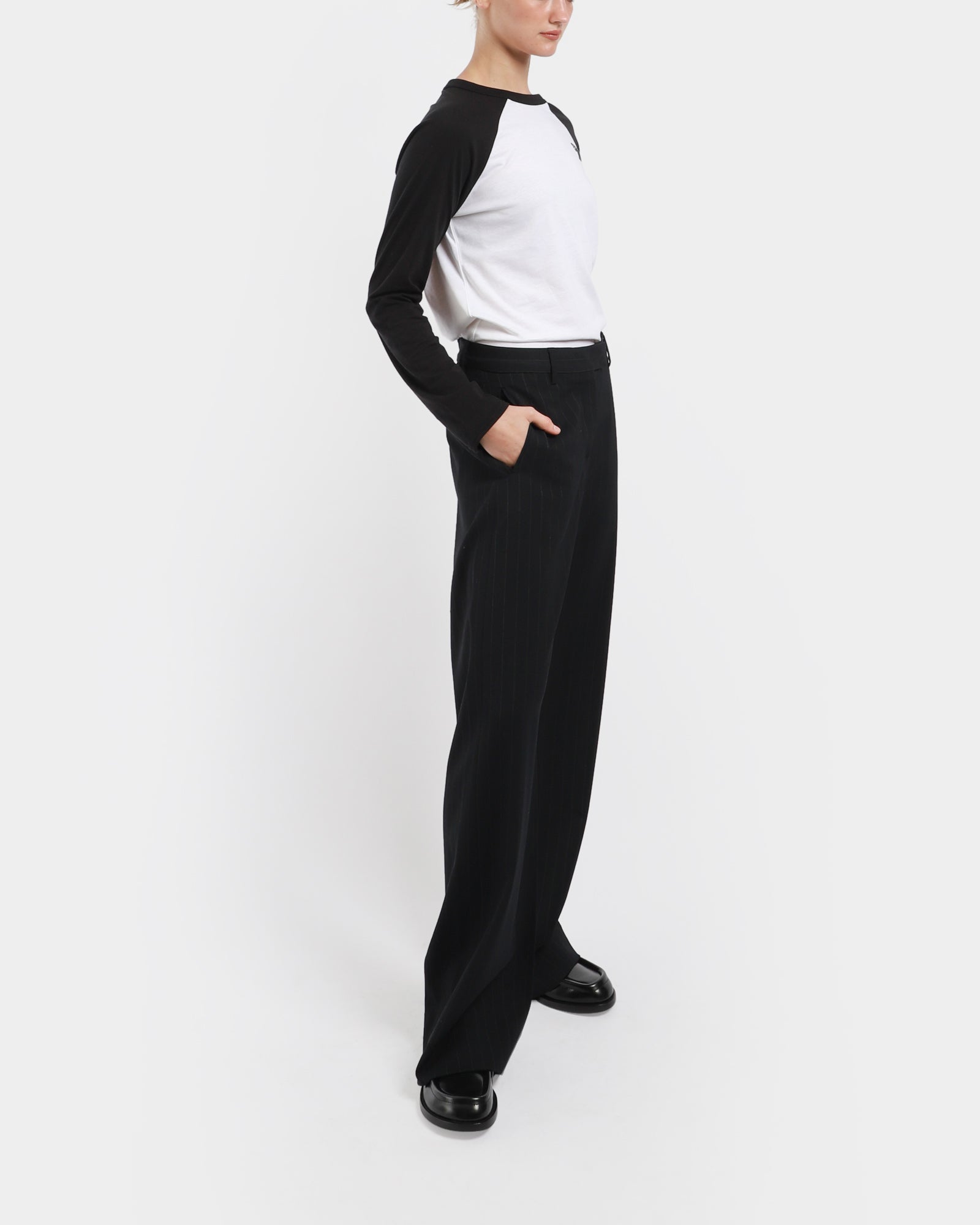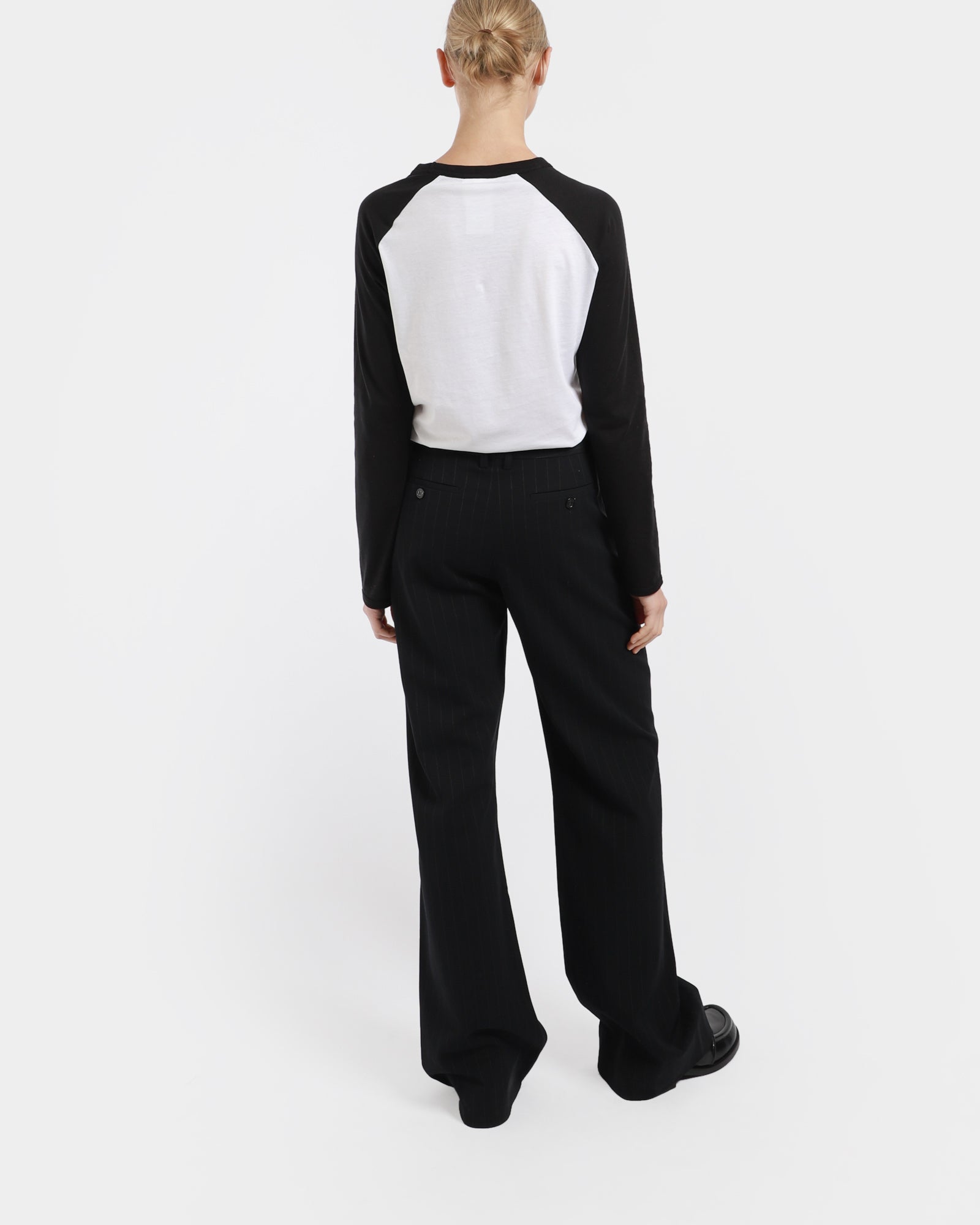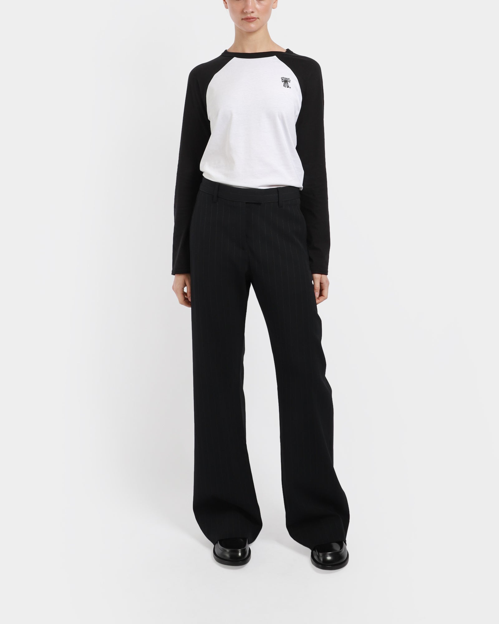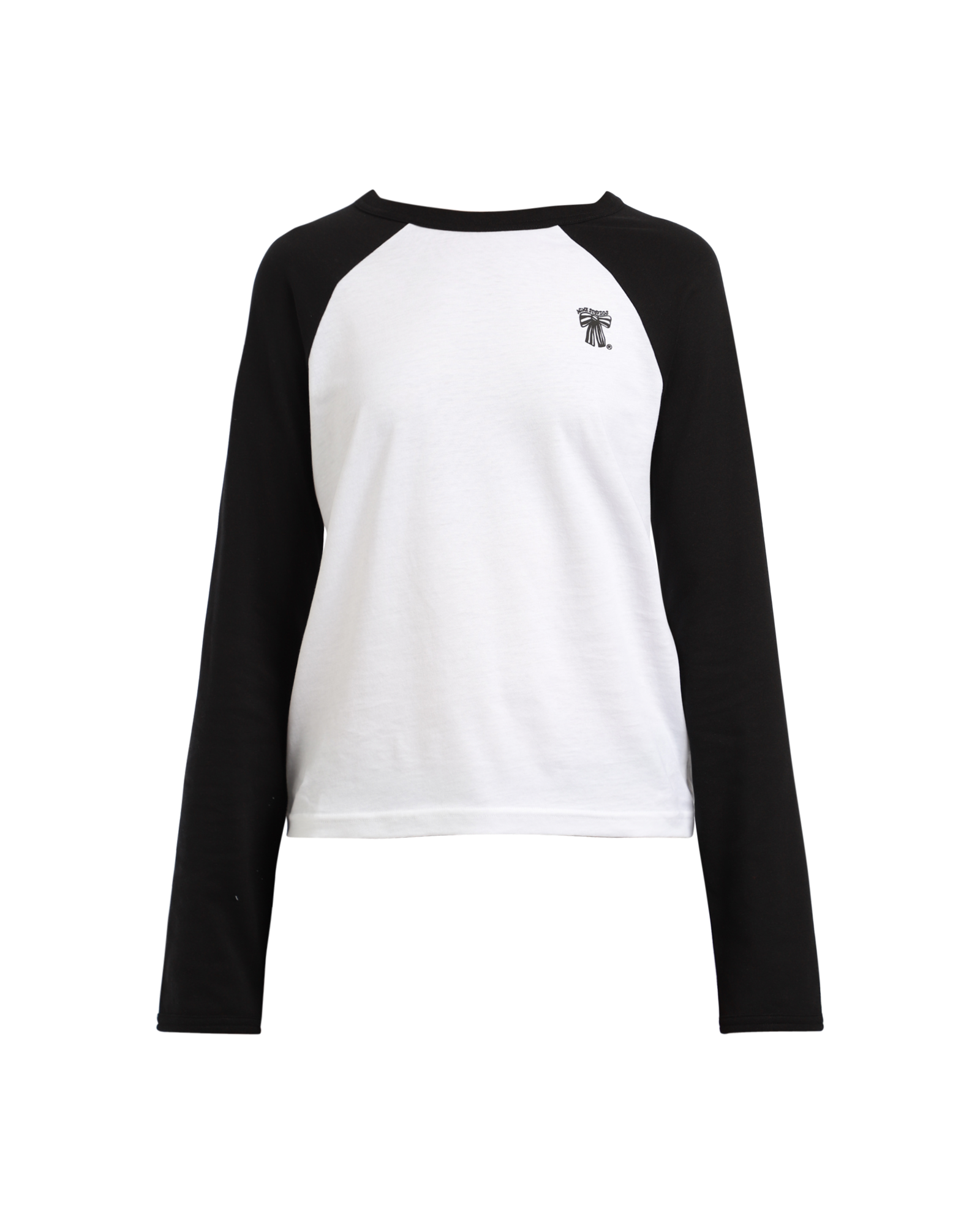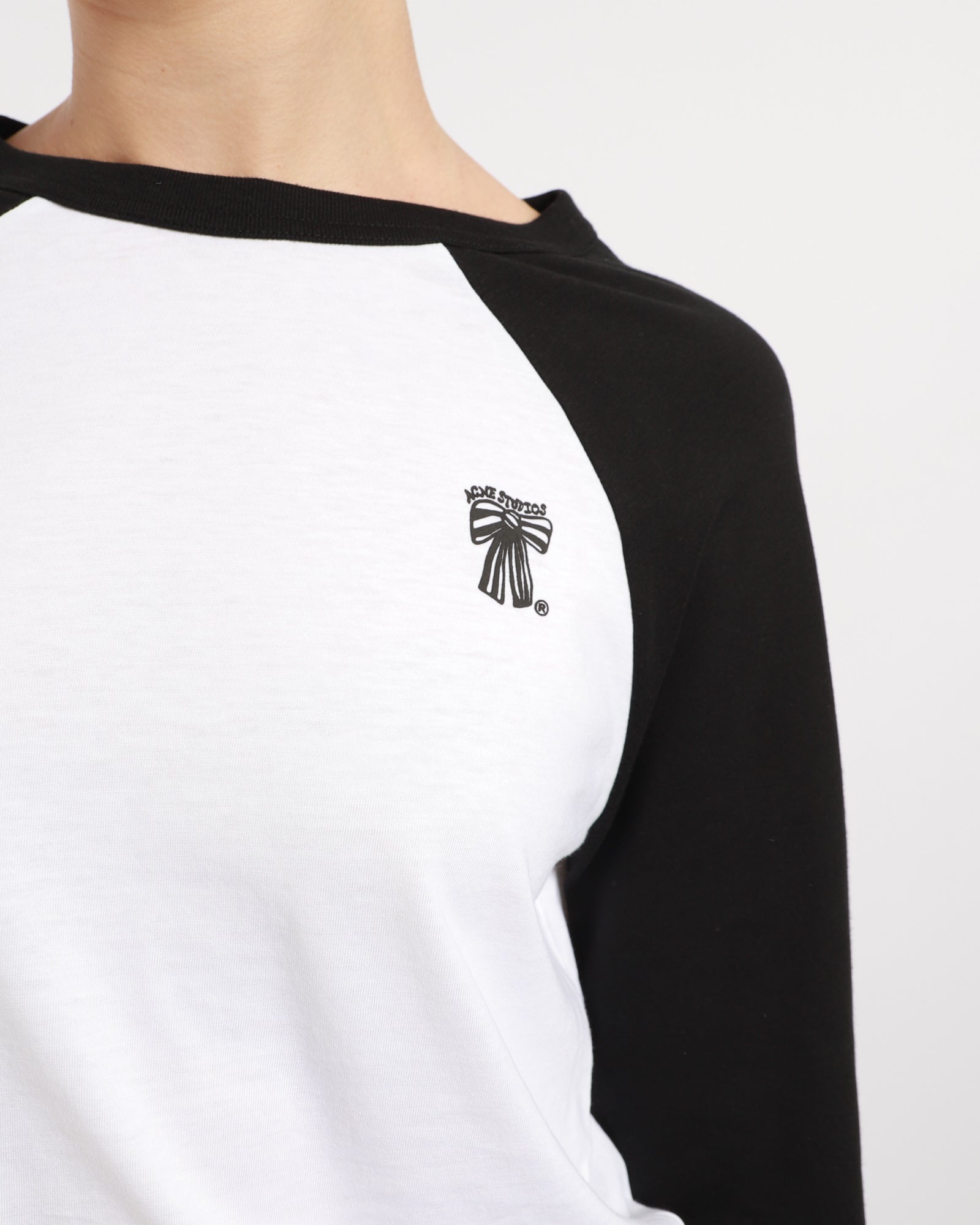 This Acne Studios tee features a modern raglan design with a white body, black sleeves, and a subtle logo. Soft and comfortable, it's perfect for layering or everyday wear.