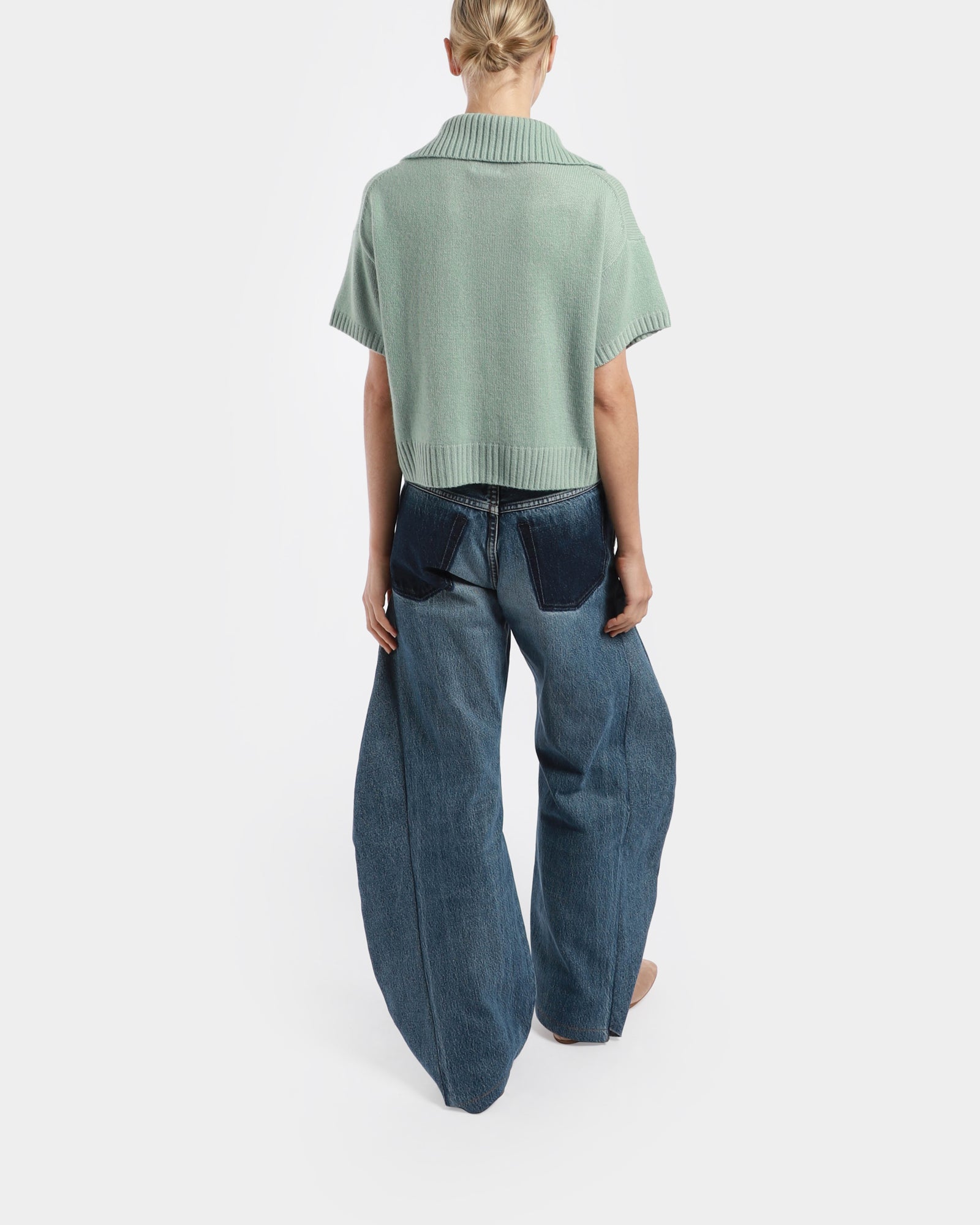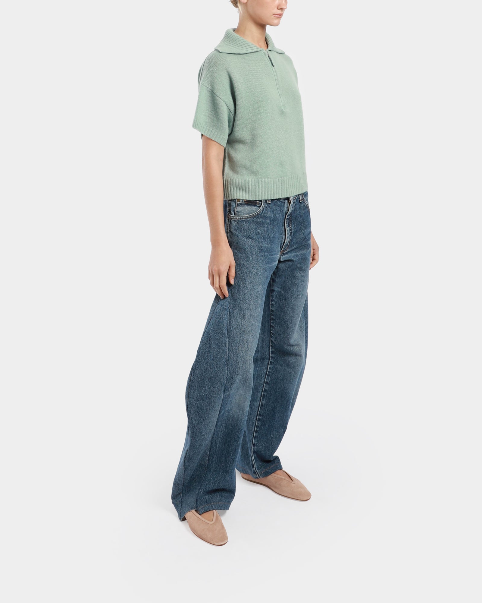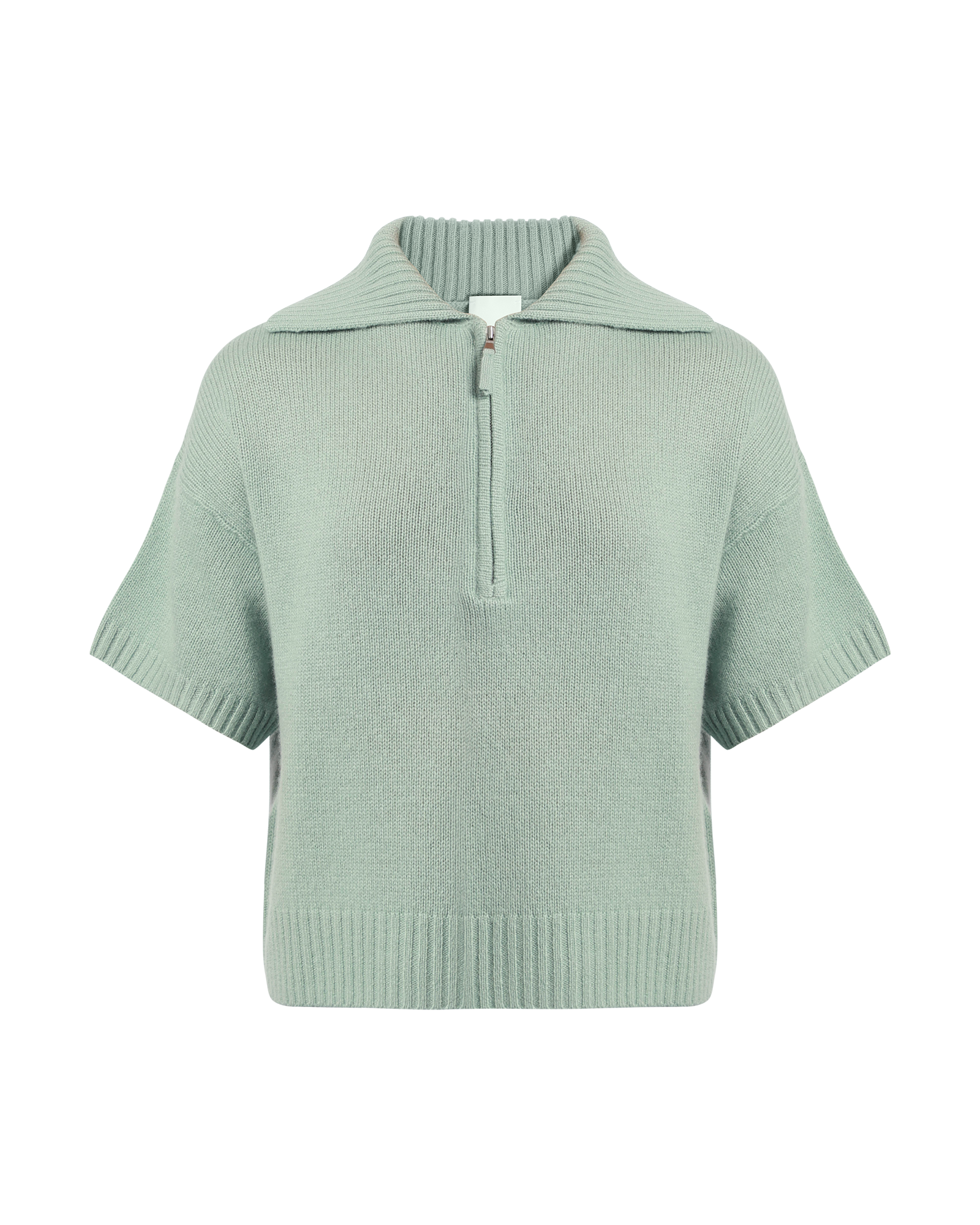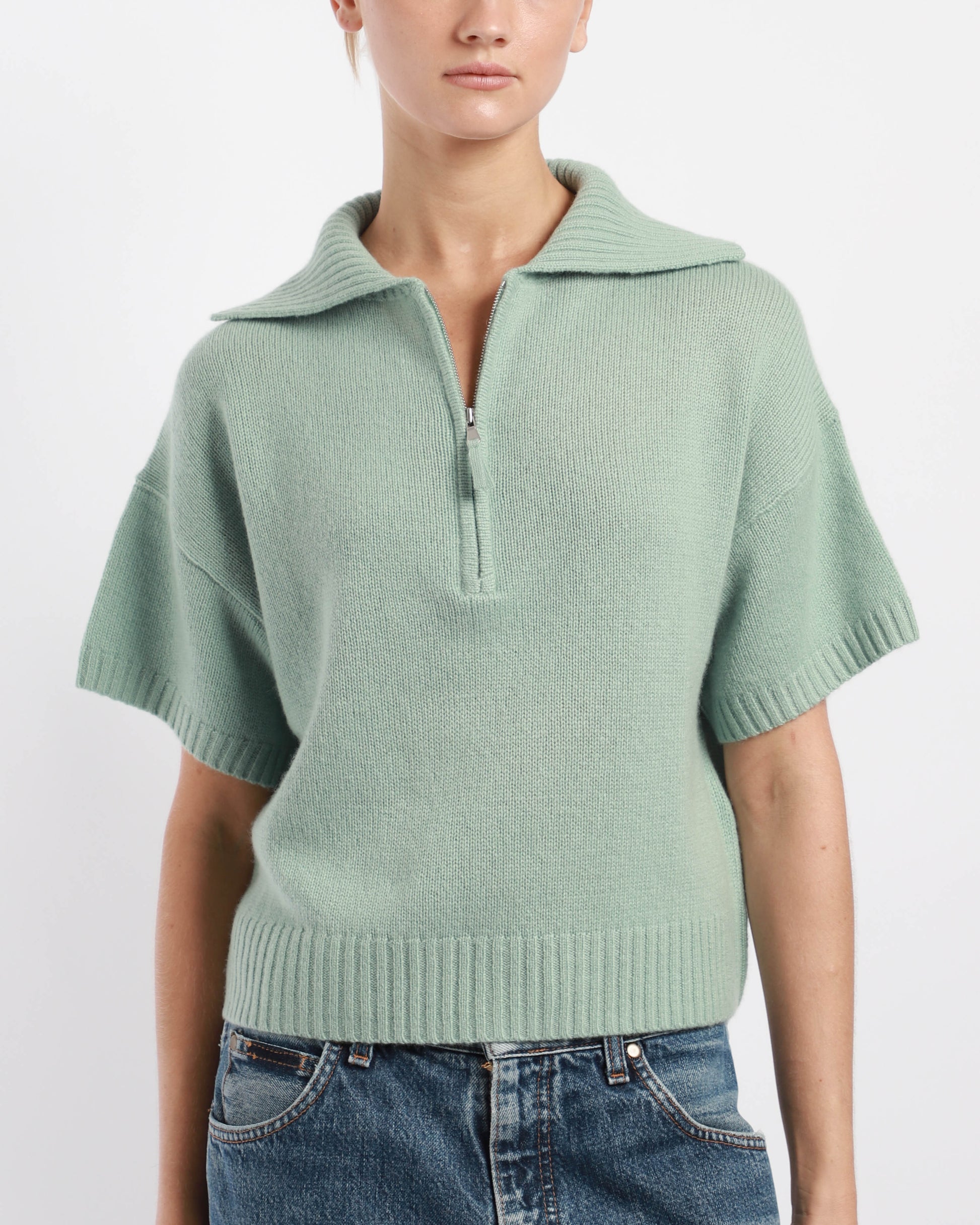 A beautiful cashmere jumper, featuring a zip collar, short slightly wide sleeves. It has ribbed detail at the collar, sleeves and bottom hem of the garment.
