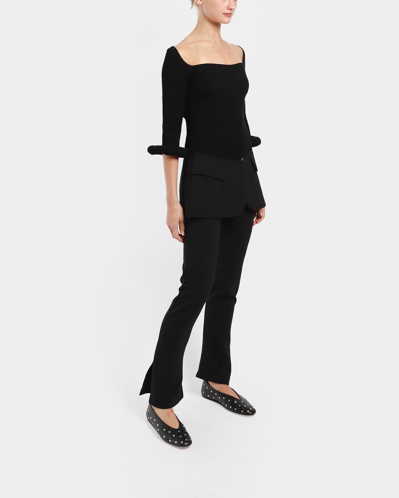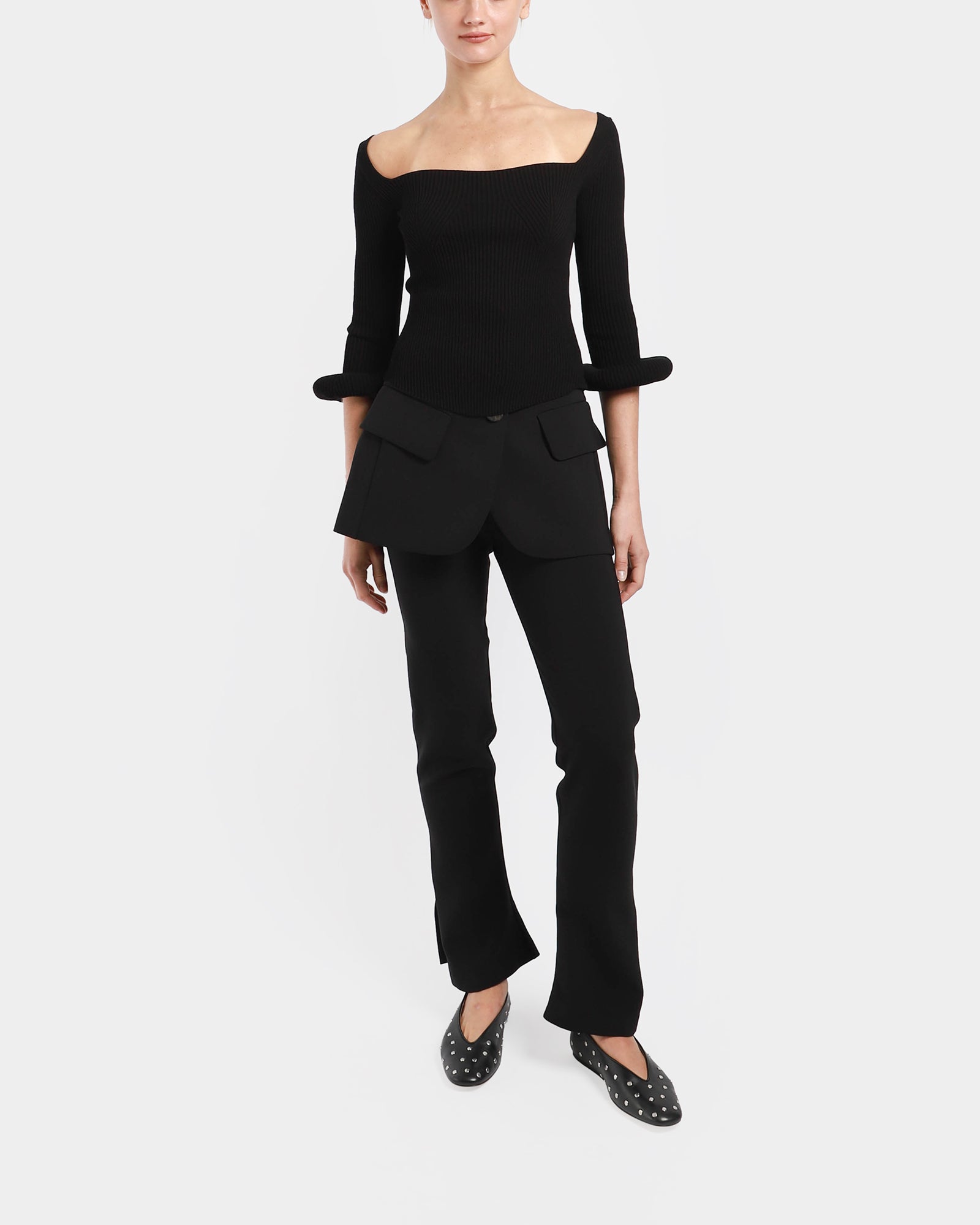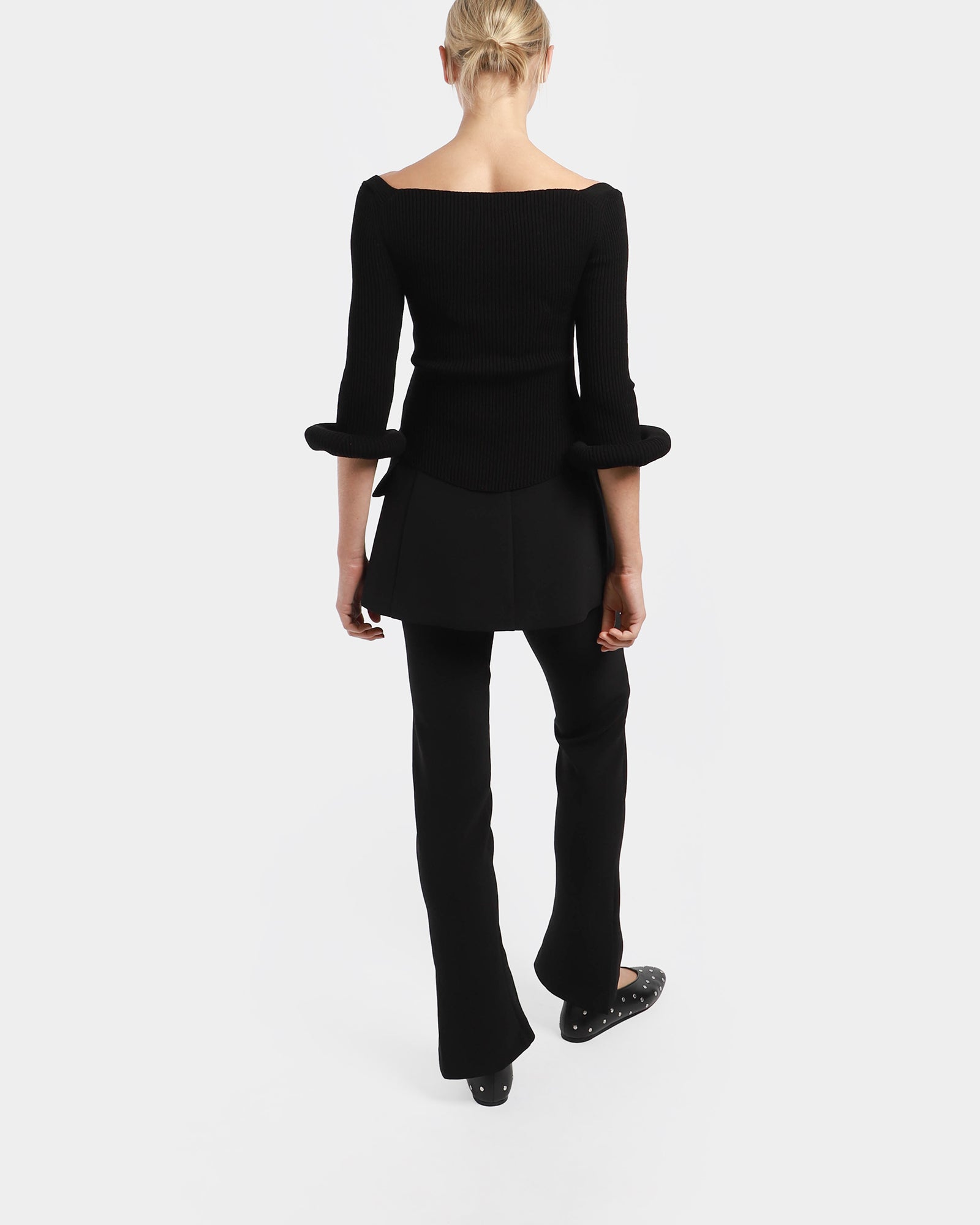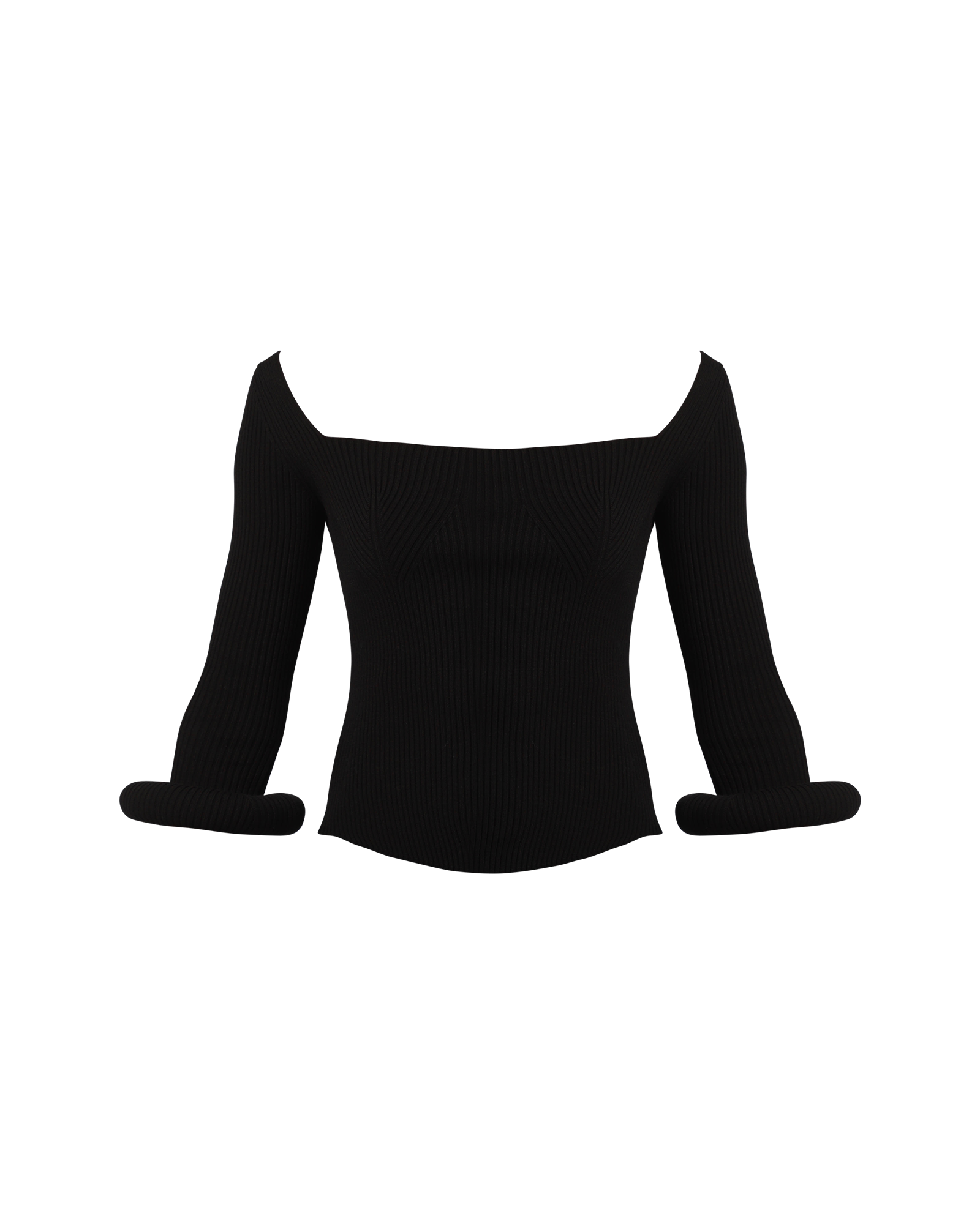 A fitted top with an open neckline that offers an elegant silhouette to the garment. It has a 3/4 sleeves with unique wide rolled hem.