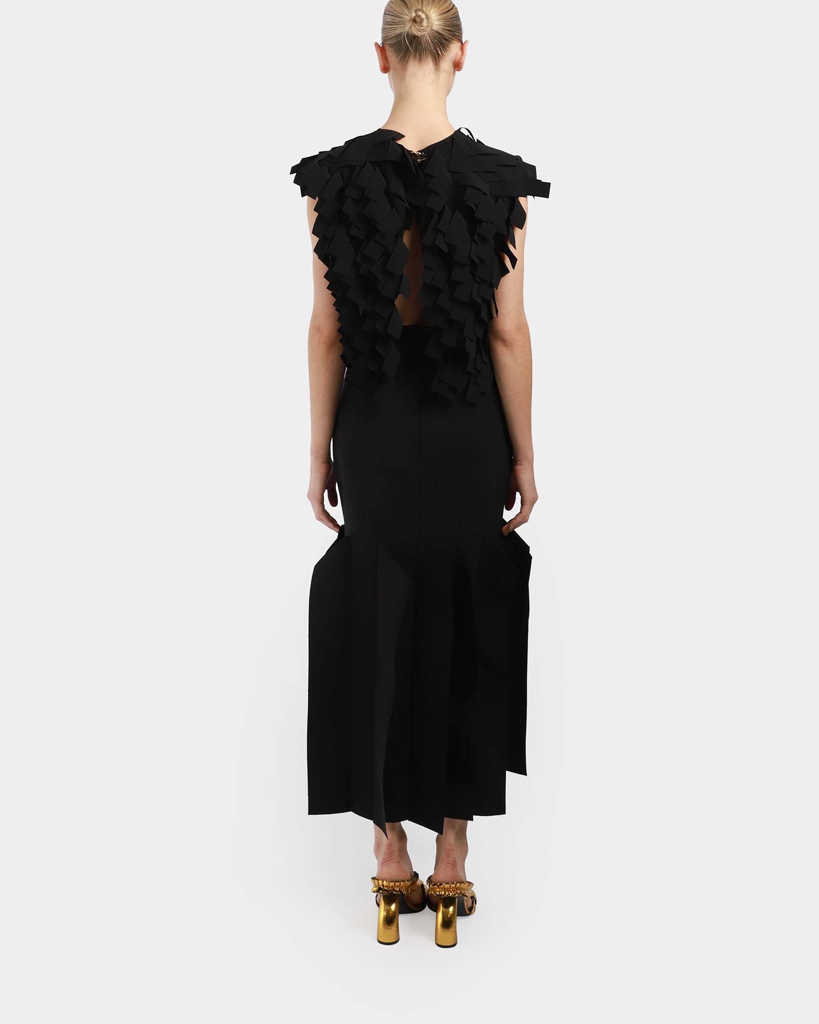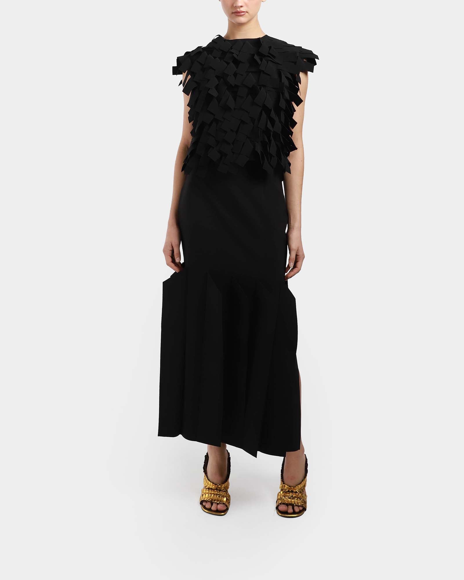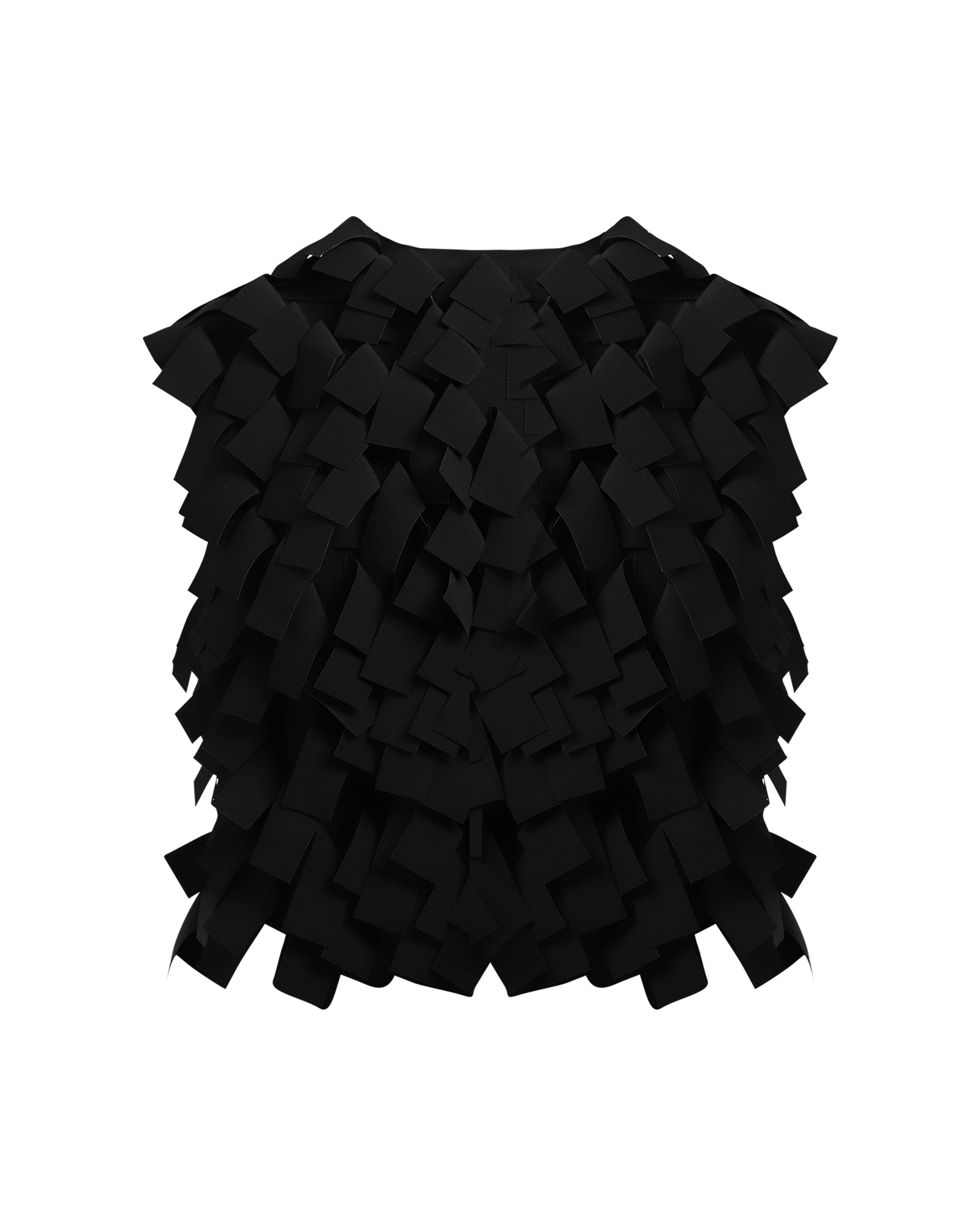 The Multi Rectangle Top, crafted from luxurious crepe, features signature laser-cut rectangles, a crew neckline, and a slim sleeveless silhouette, perfect for elevating your evening outfit. Made in Italy.