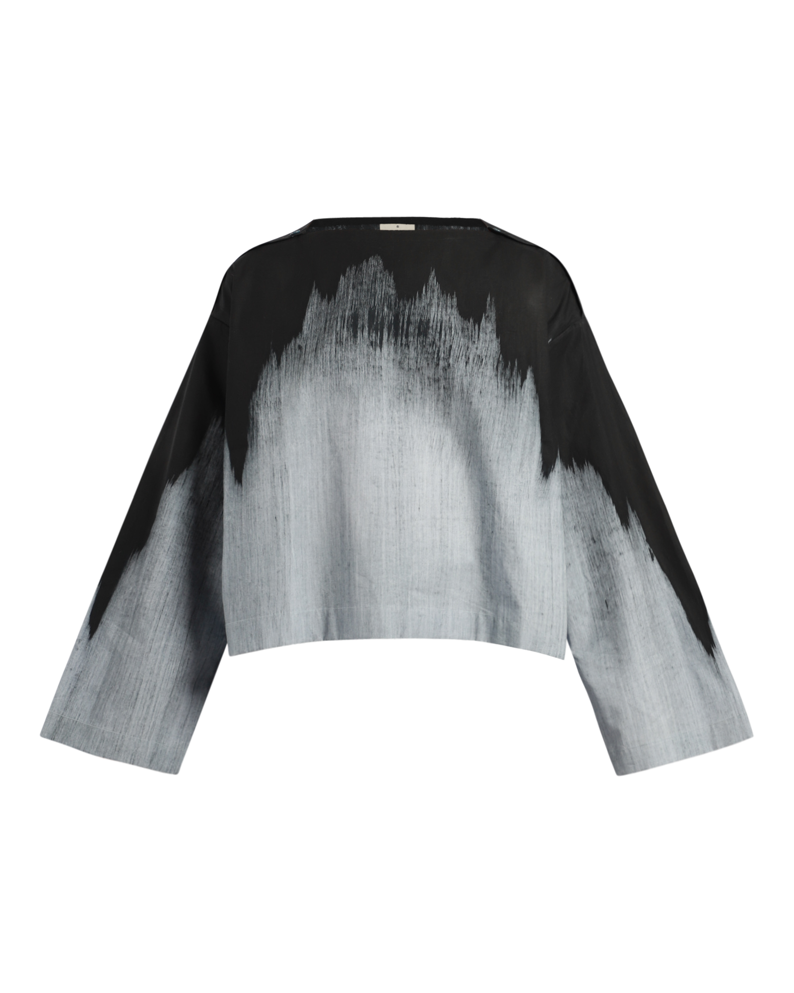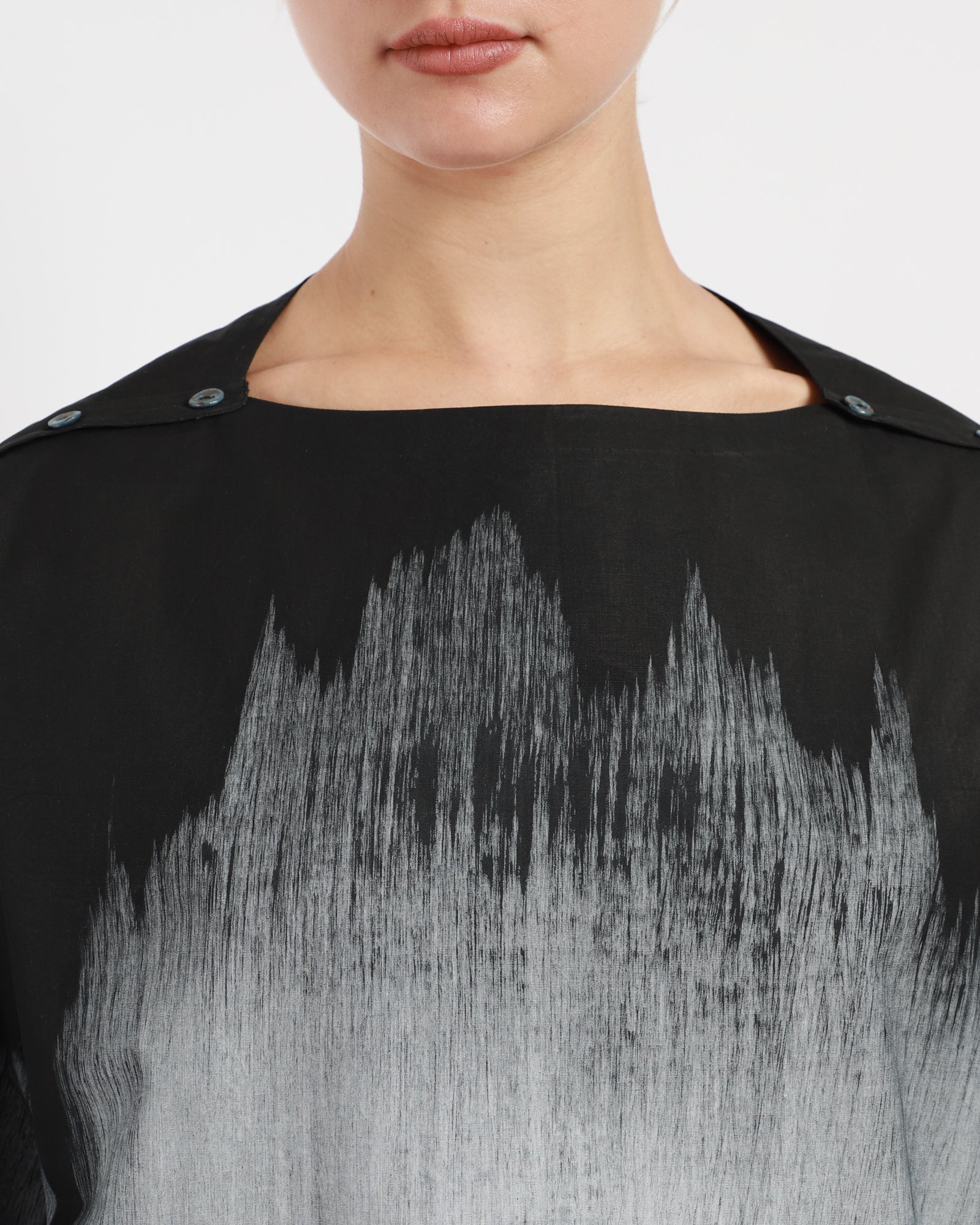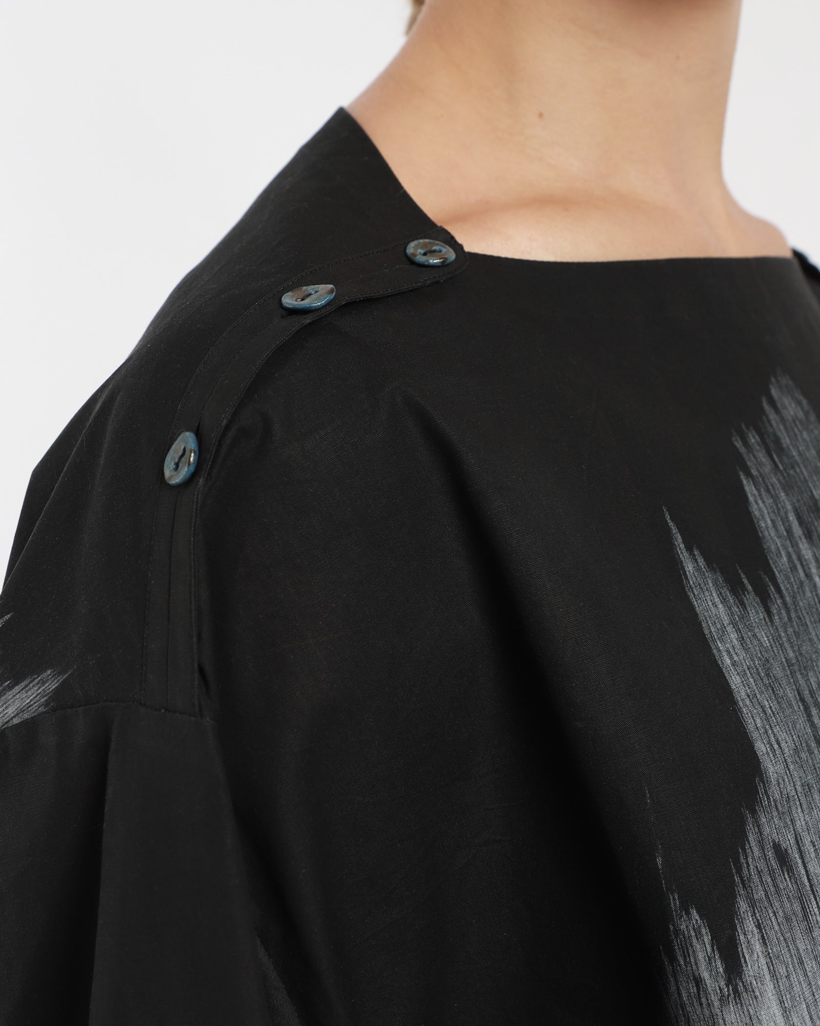 This top is meticulously handcrafted using traditional block printing and dragging techniques. It features handcrafted, irregularly shaped ceramic buttons on the shoulders, a boat neckline and a three-quarter sleeve. Made in India.