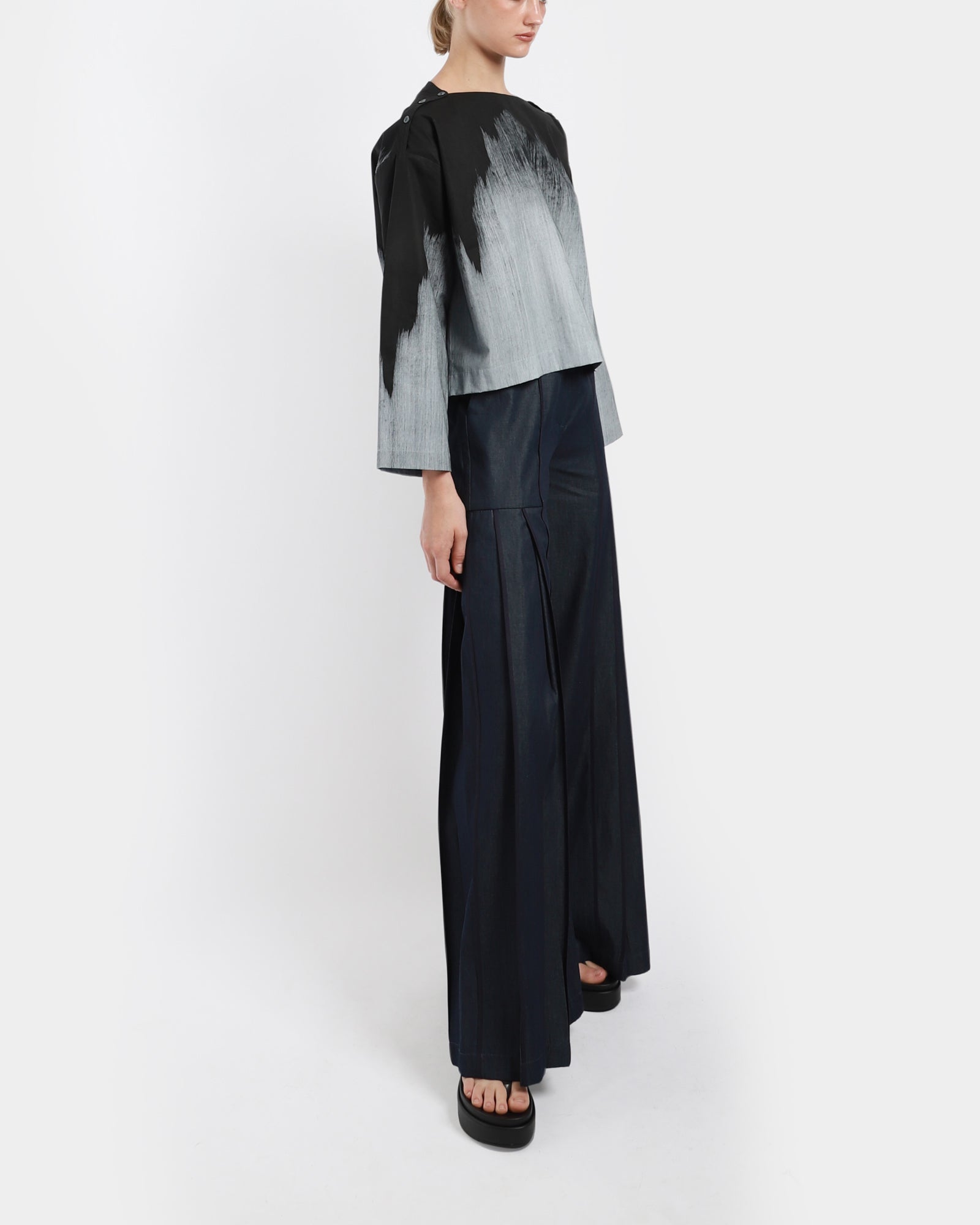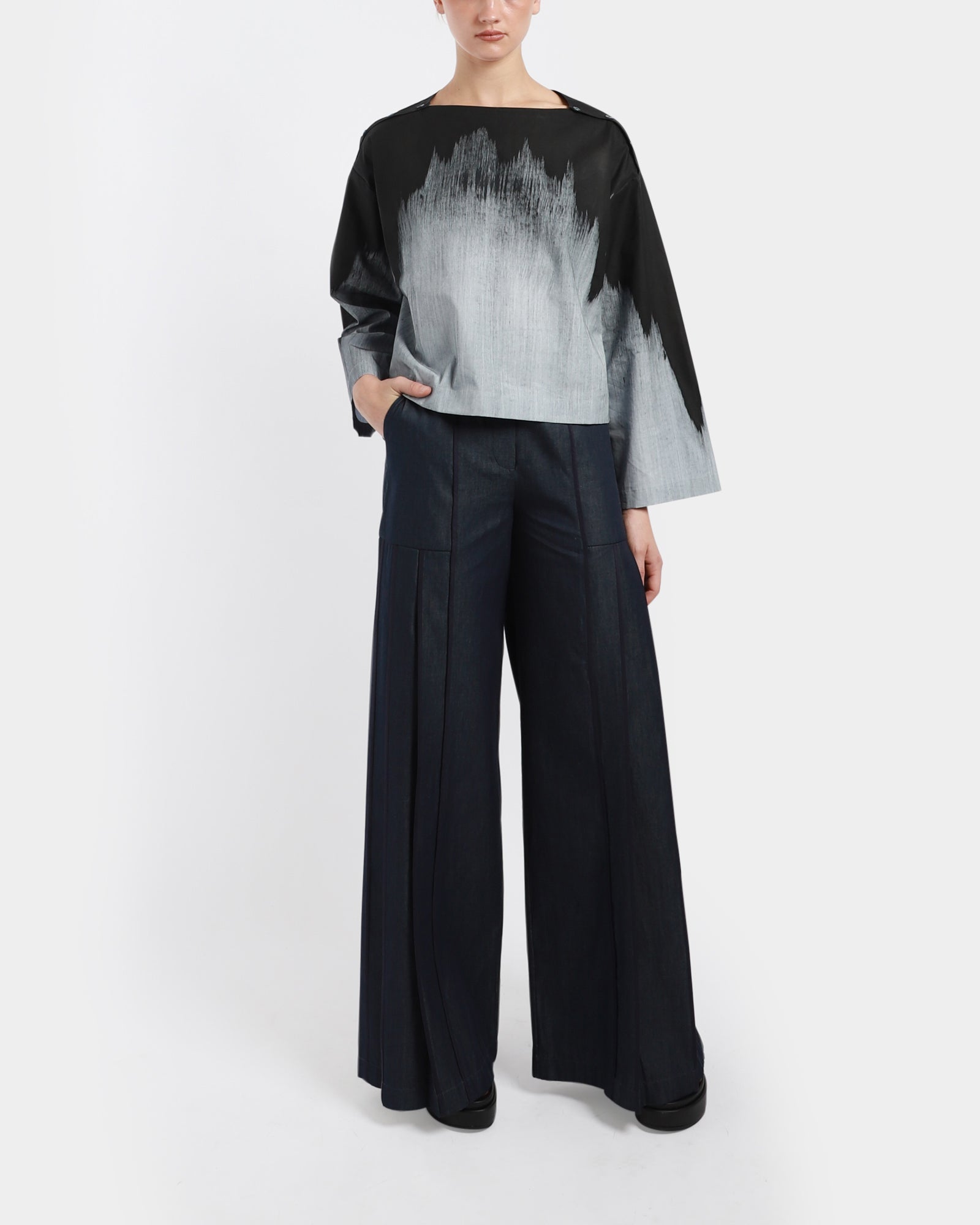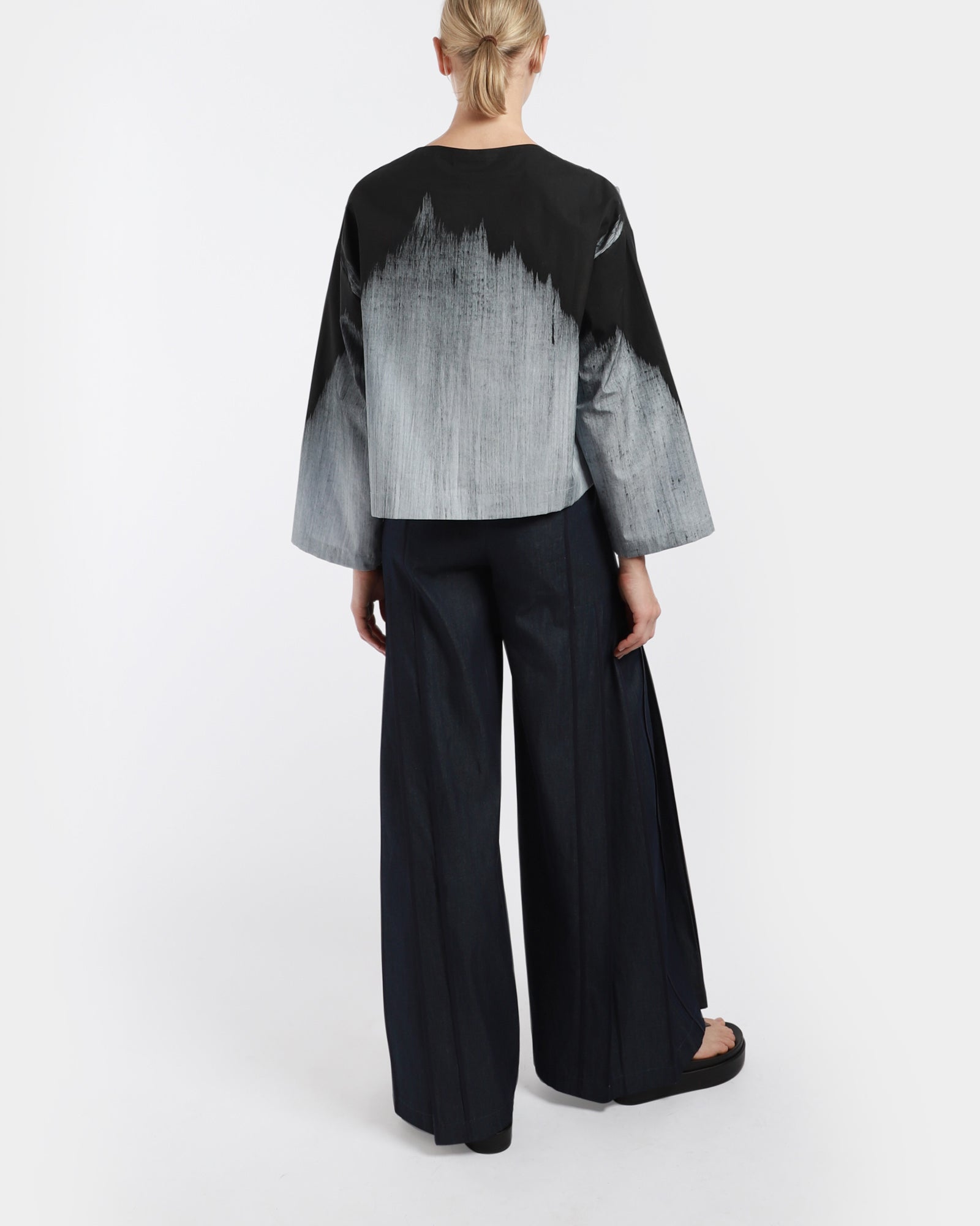 This top is meticulously handcrafted using traditional block printing and dragging techniques. It features handcrafted, irregularly shaped ceramic buttons on the shoulders, a boat neckline and a three-quarter sleeve. Made in India.