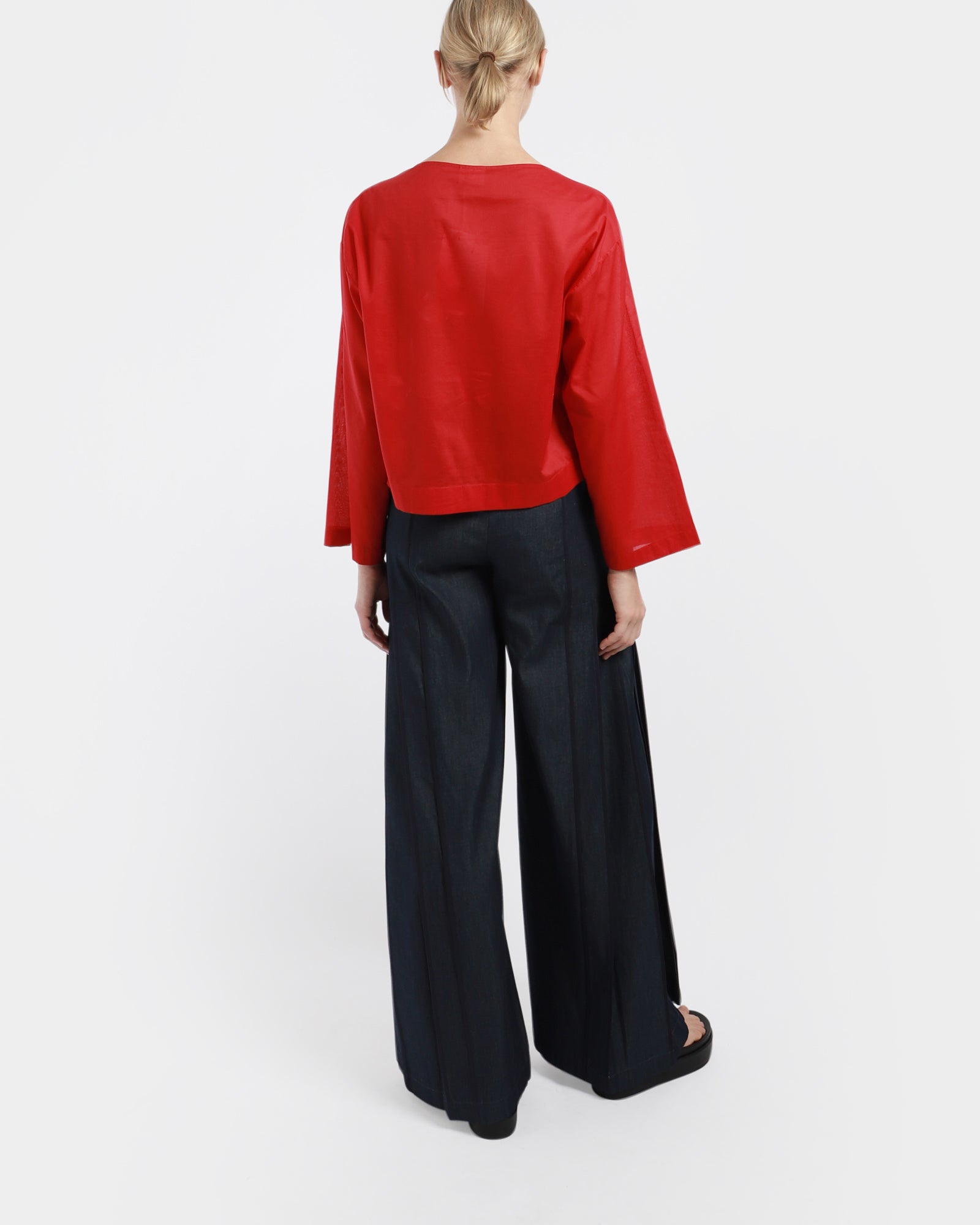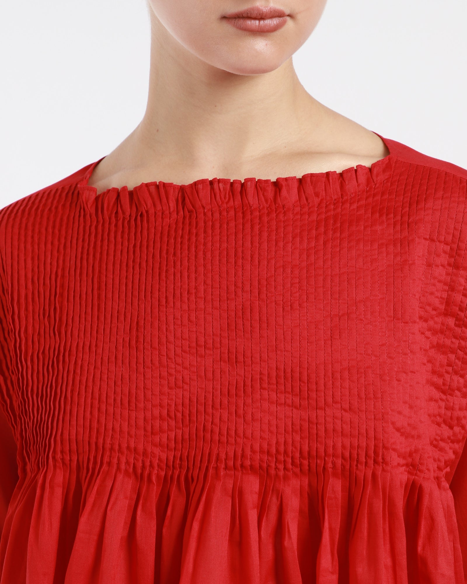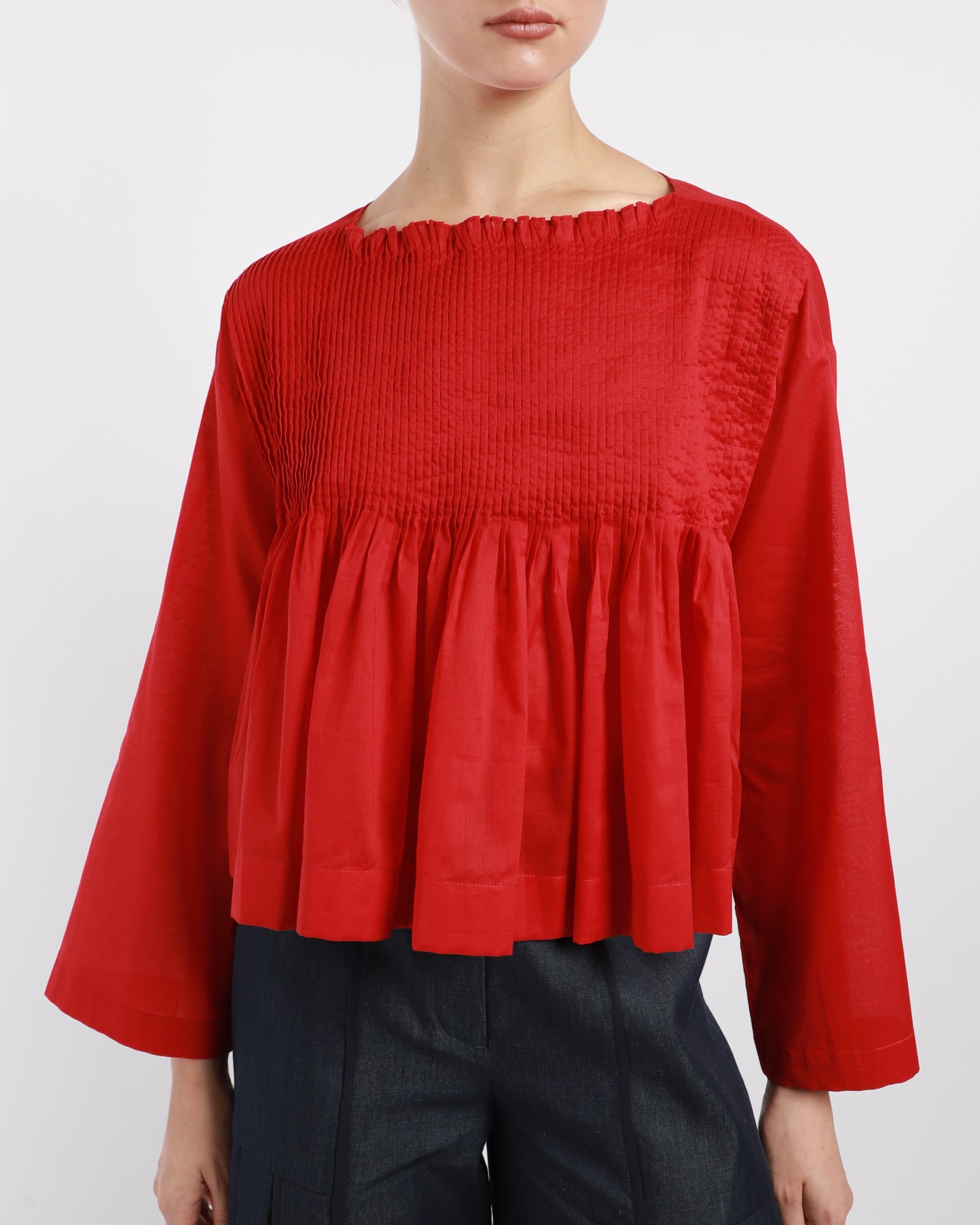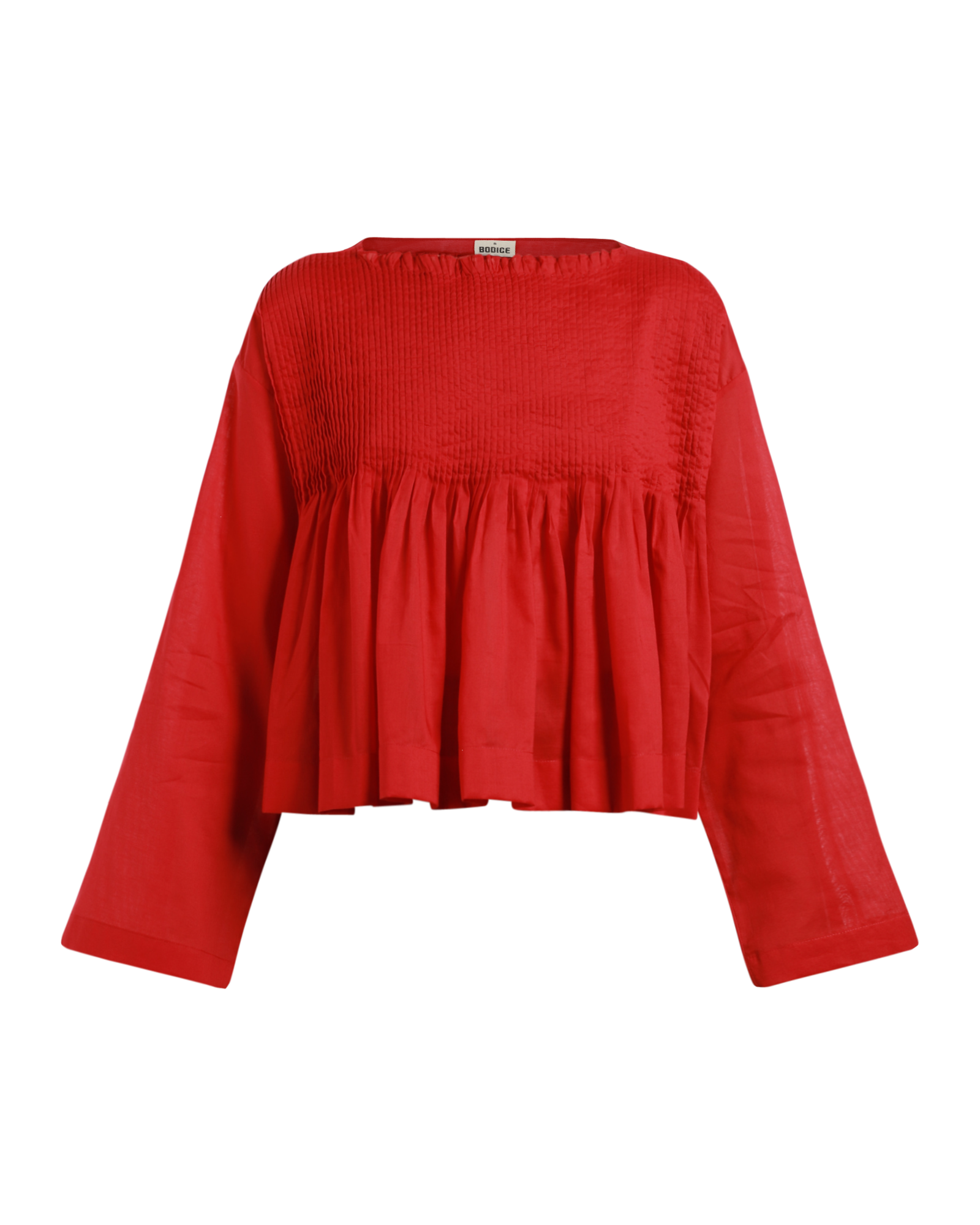 The Pin-Tuck Flared Top is crafted from a lightweight, soft cotton in India. It features a ruched chest, with a pleated bodice and long sleeves.