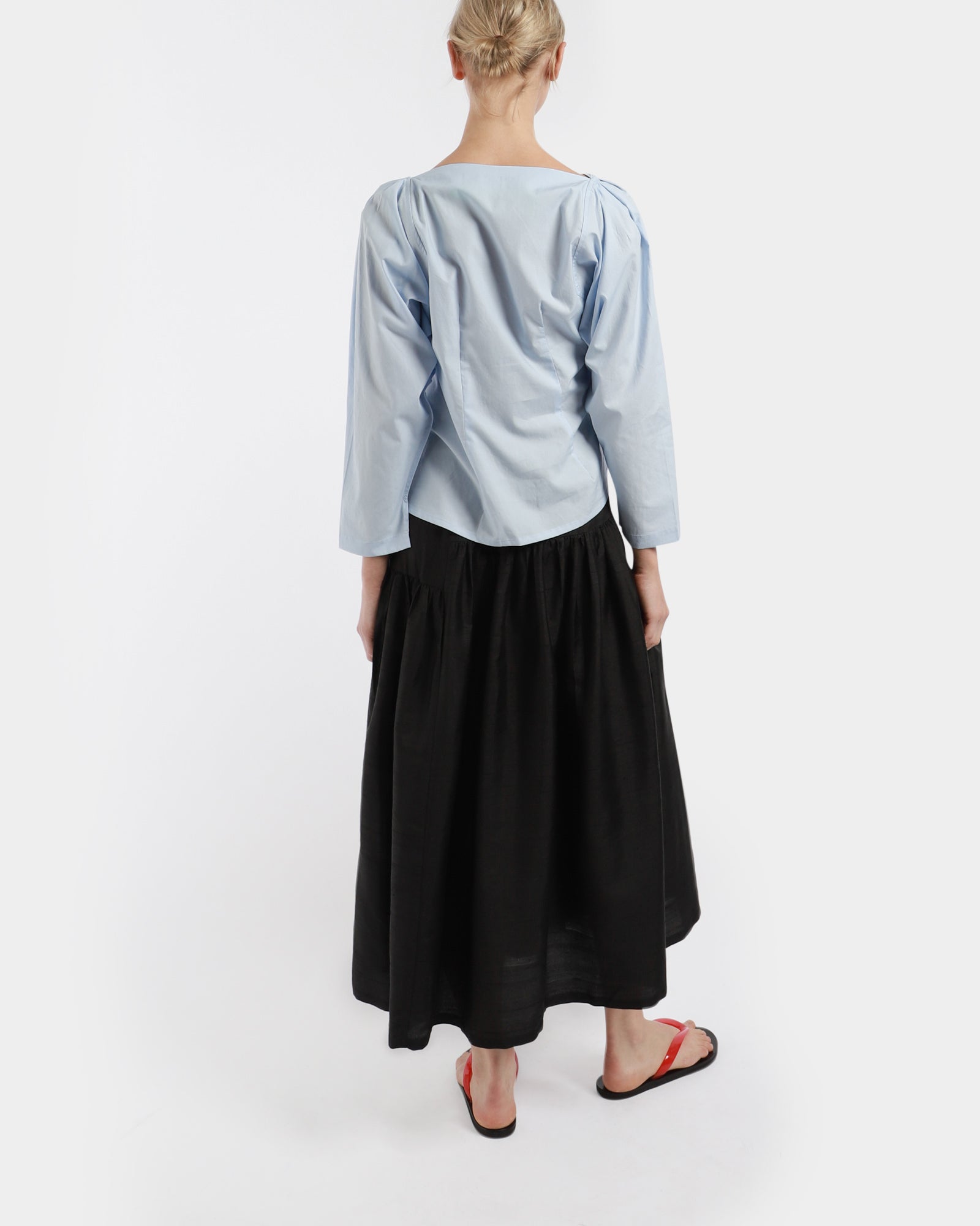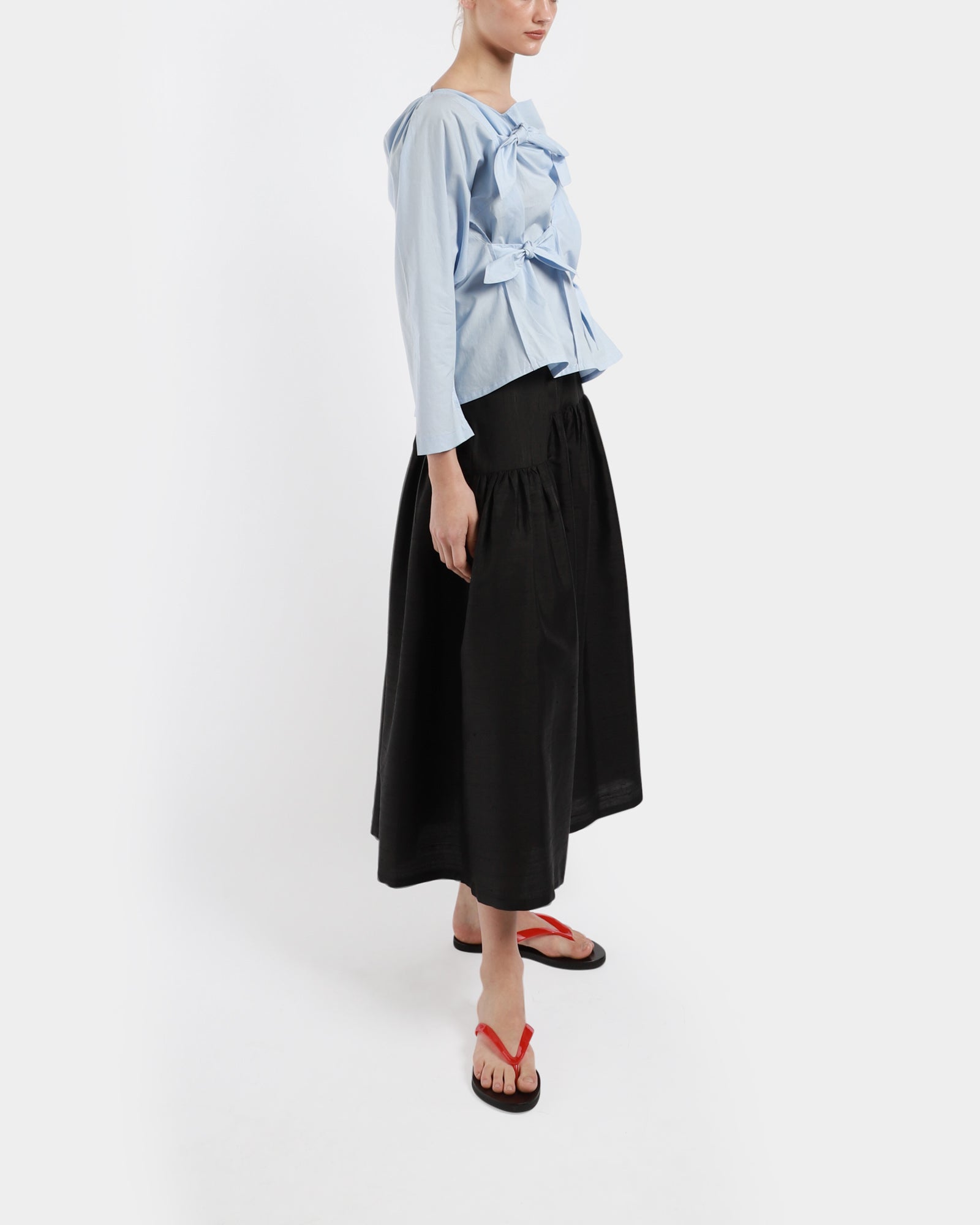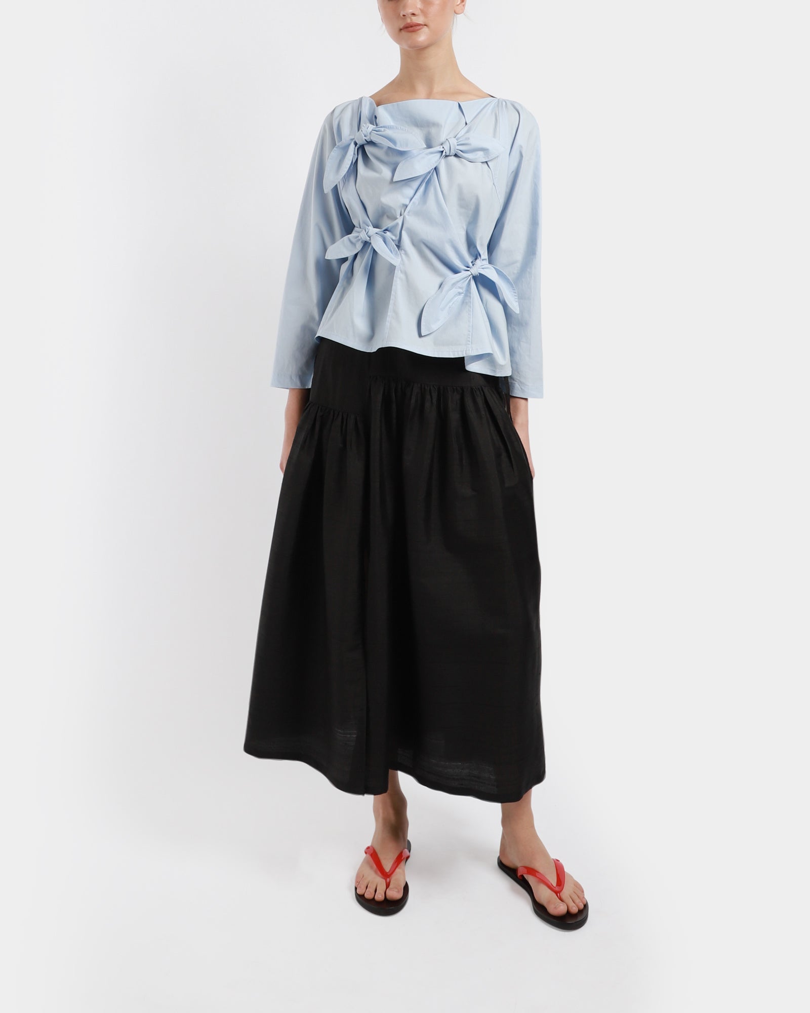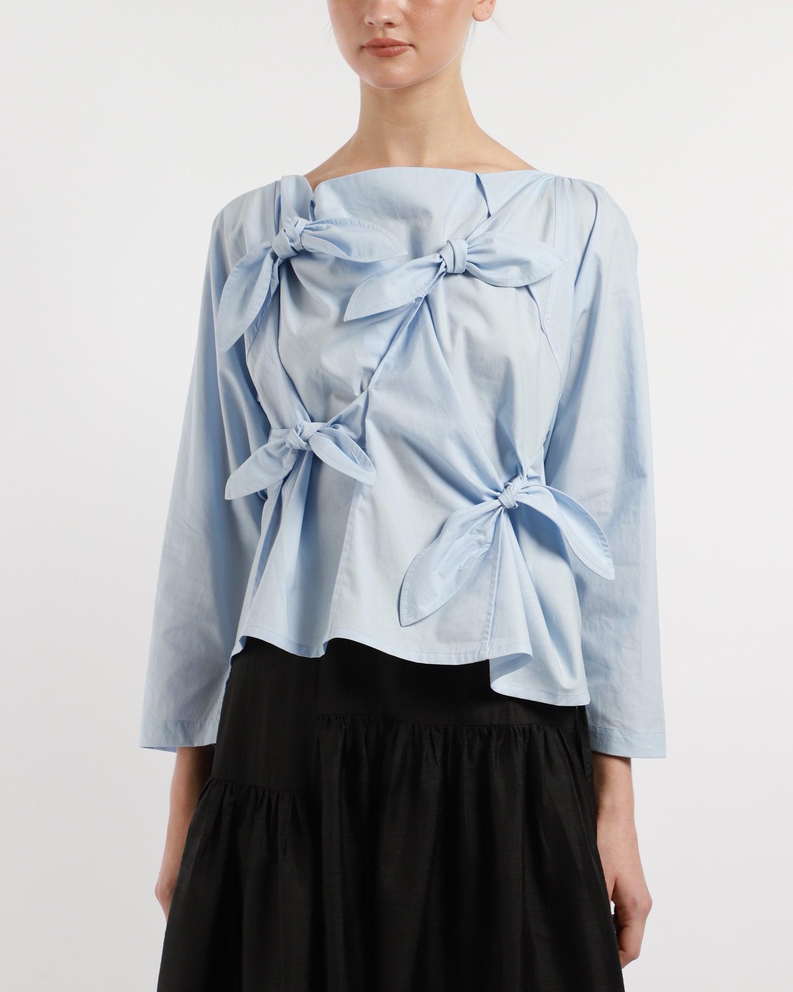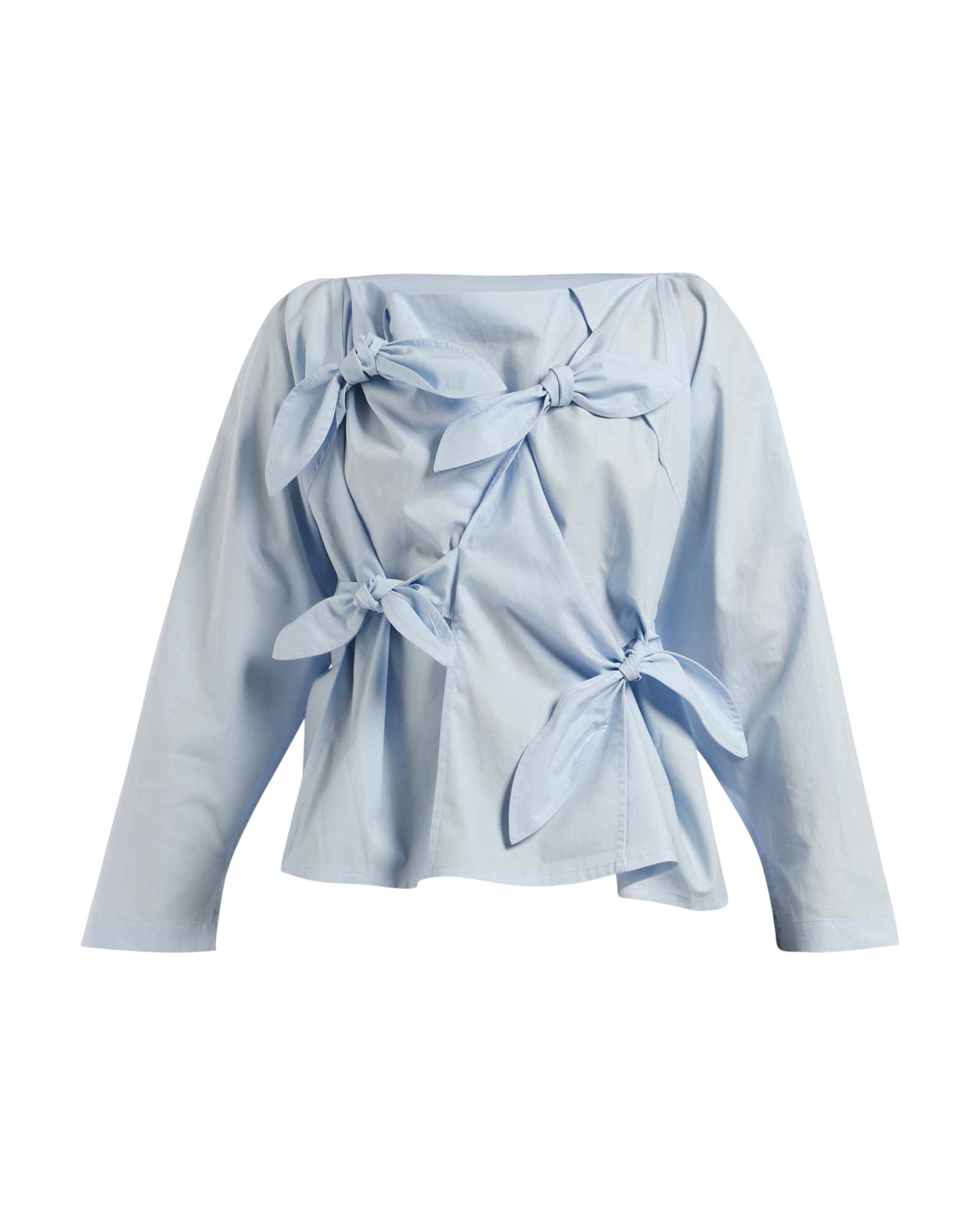 The Petra Top is crafted from cotton and features a bateau neckline with tie-front detailing and three-quarter length sleeves. Made in Shanghai.