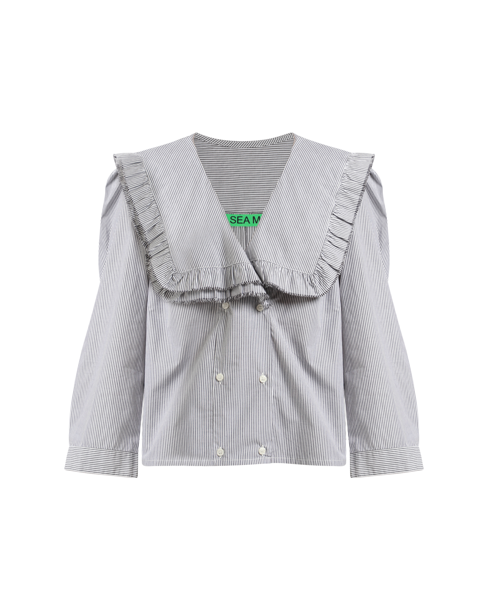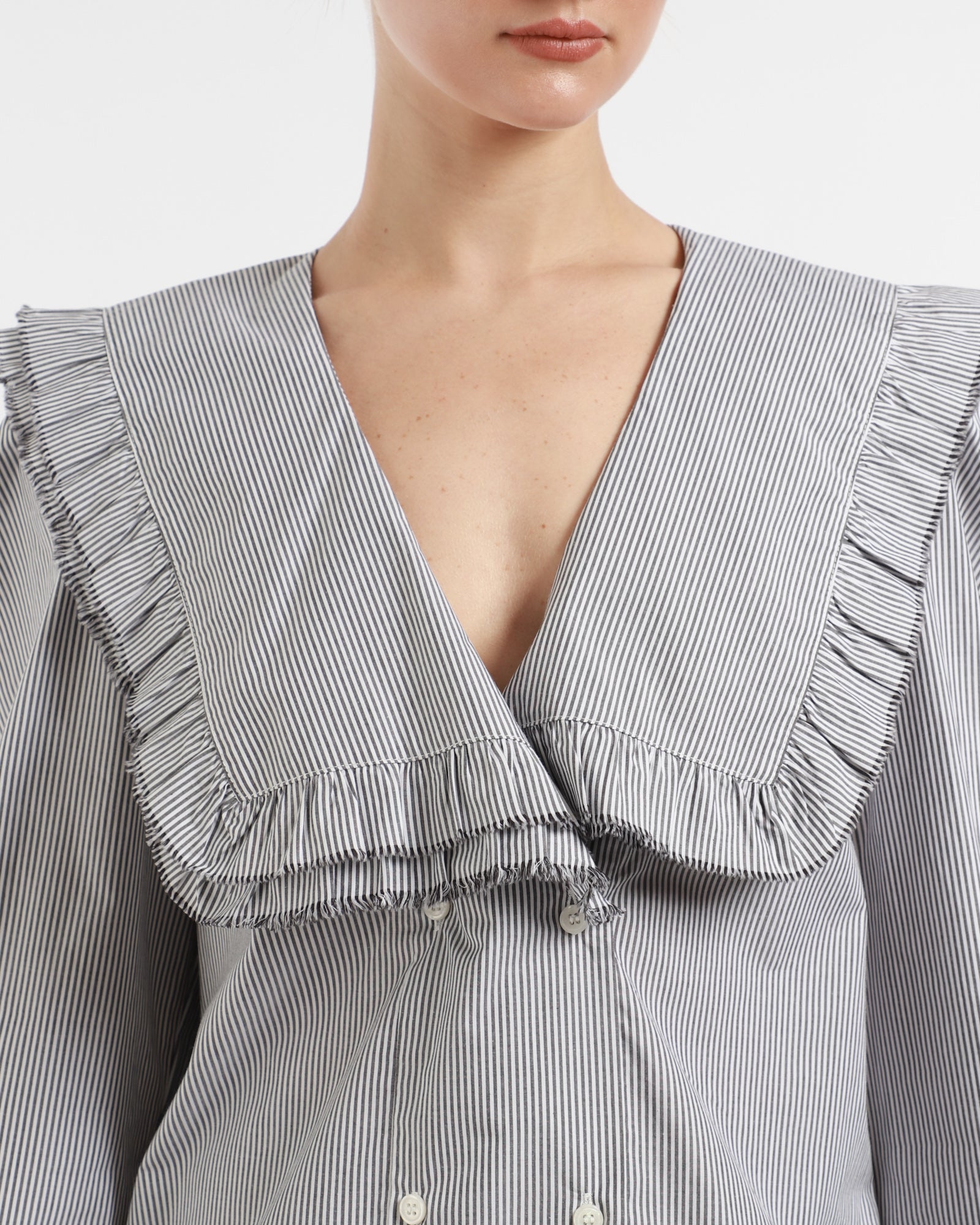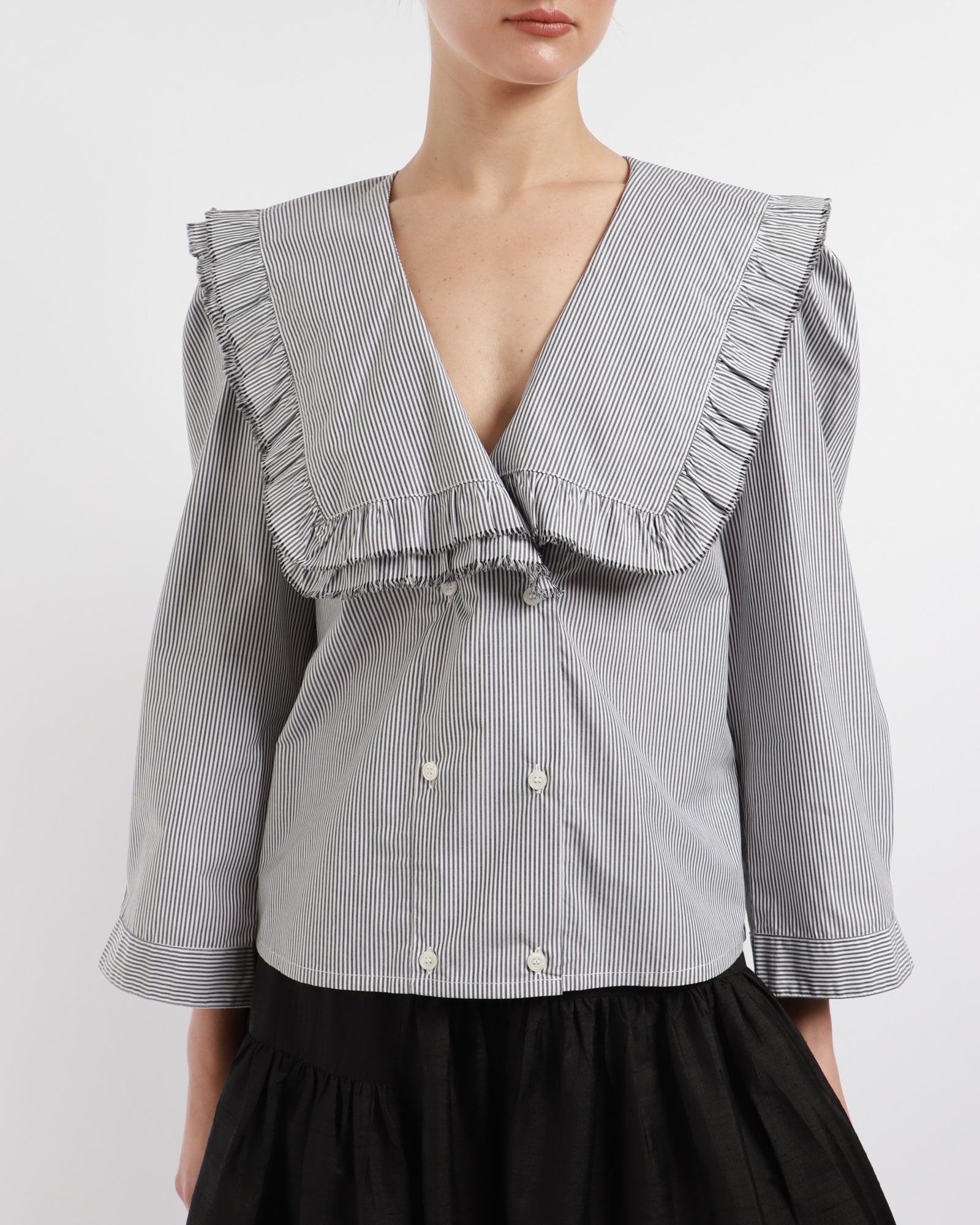 The Vienna Top is an iconic and a touch avant-garde, 80's inflected statement blouse with full sleeves, a dramatic raw edge ruffle collar, and a double-breasted centre front closure. It is crafted from cotton, and is intended to be worn oversized.