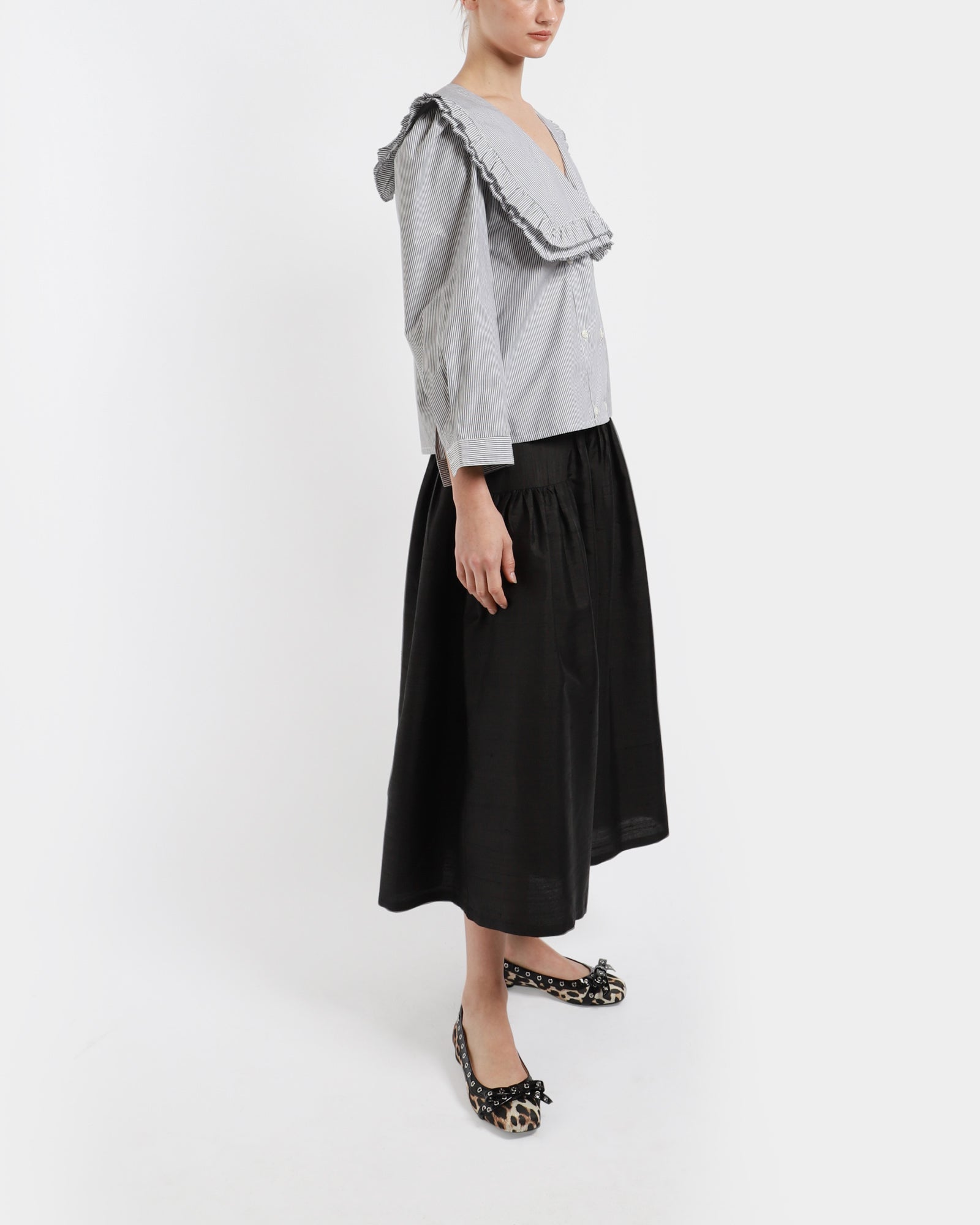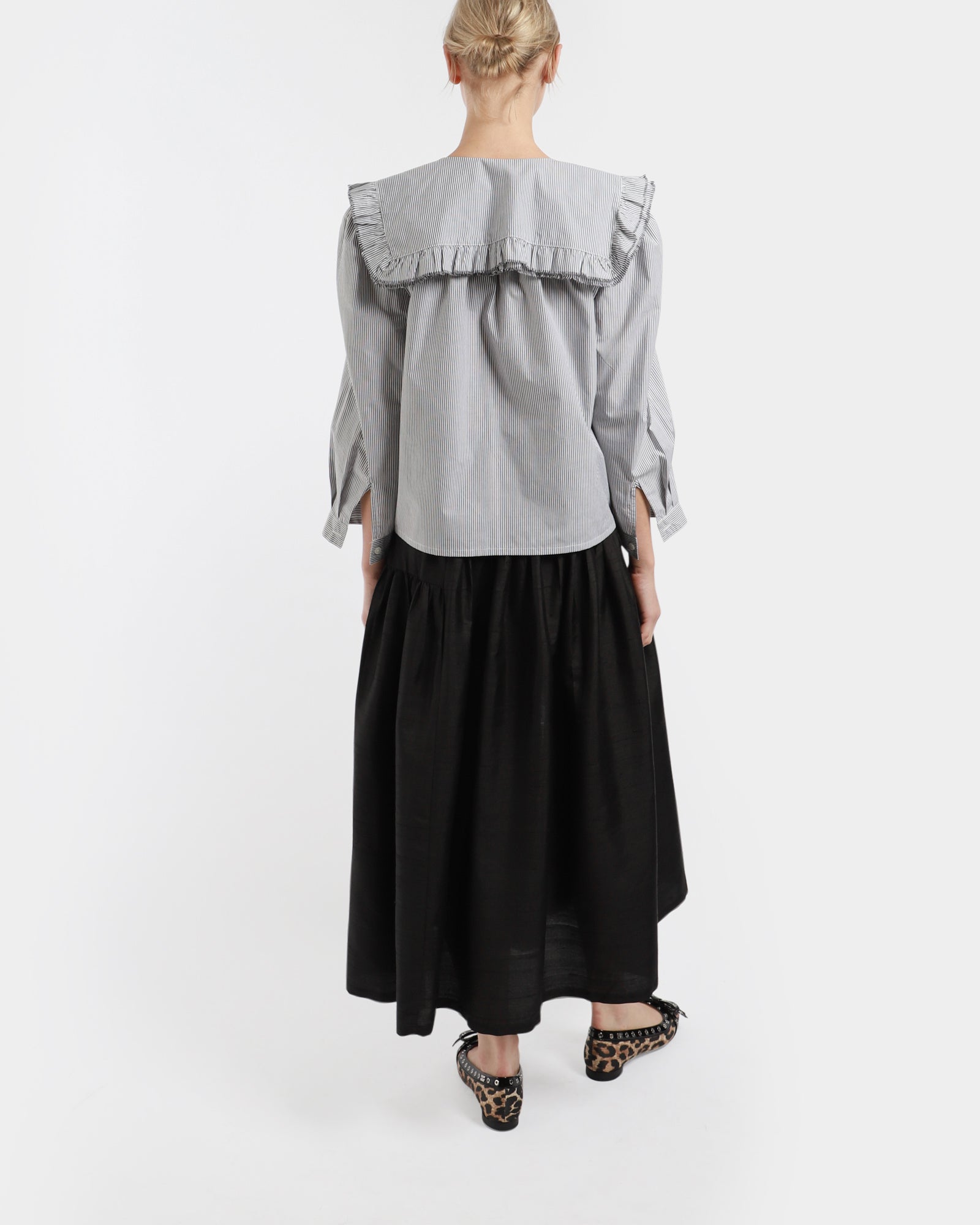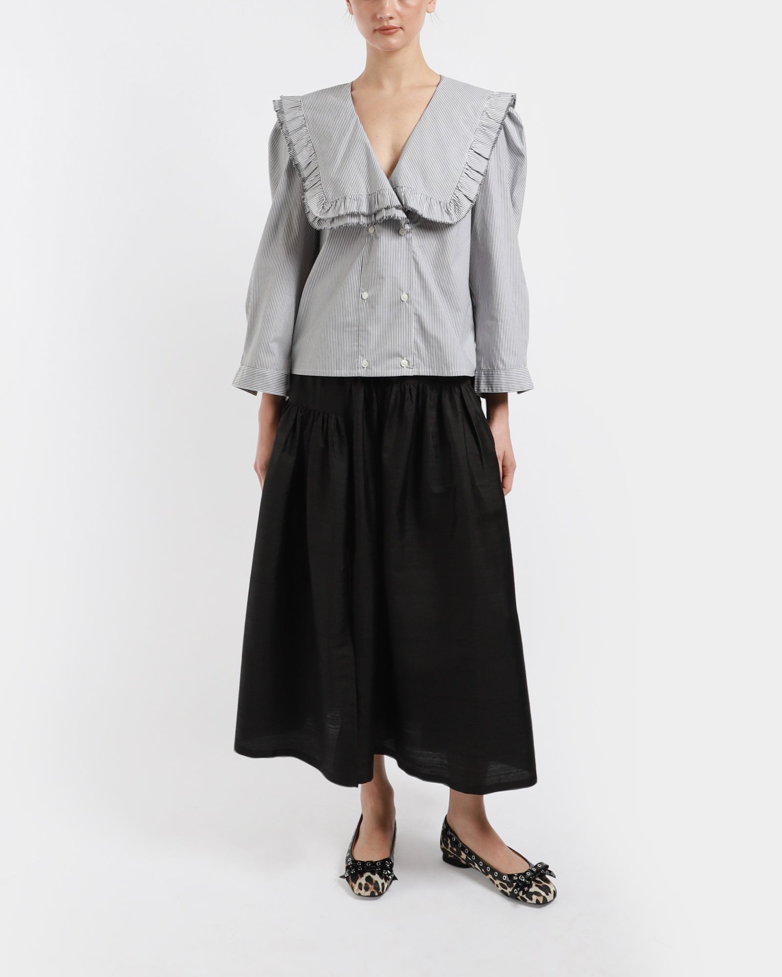 The Vienna Top is an iconic and a touch avant-garde, 80's inflected statement blouse with full sleeves, a dramatic raw edge ruffle collar, and a double-breasted centre front closure. It is crafted from cotton, and is intended to be worn oversized.