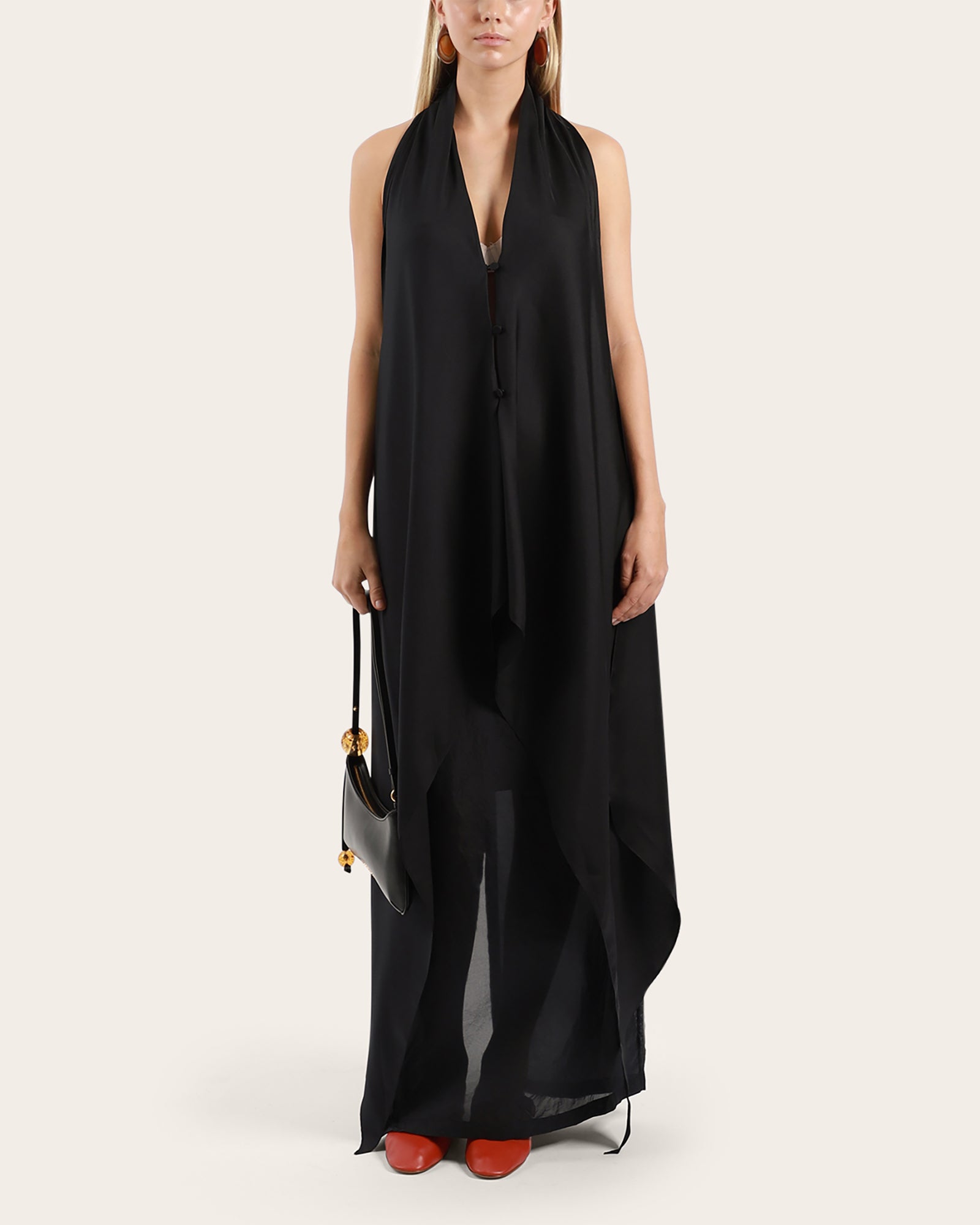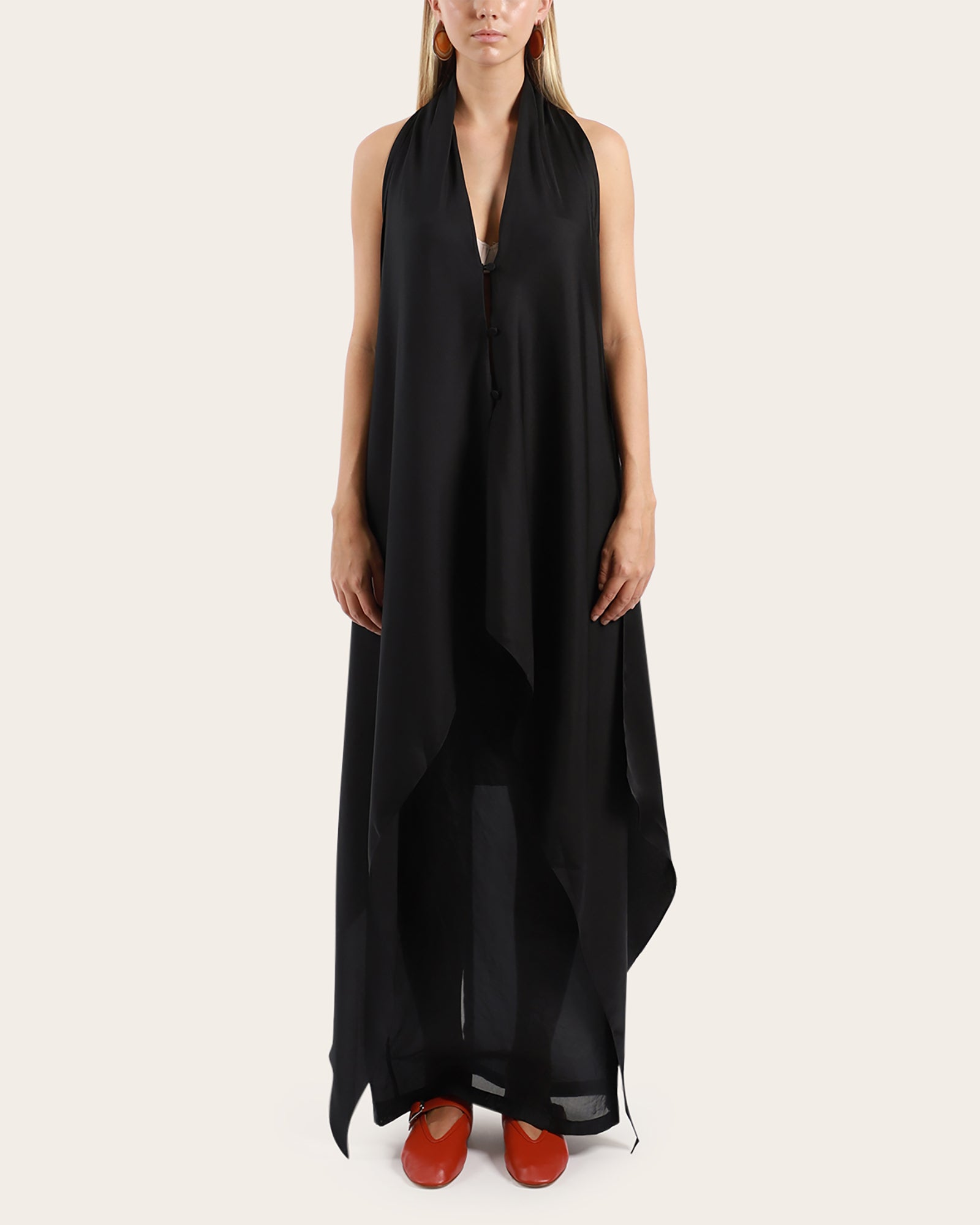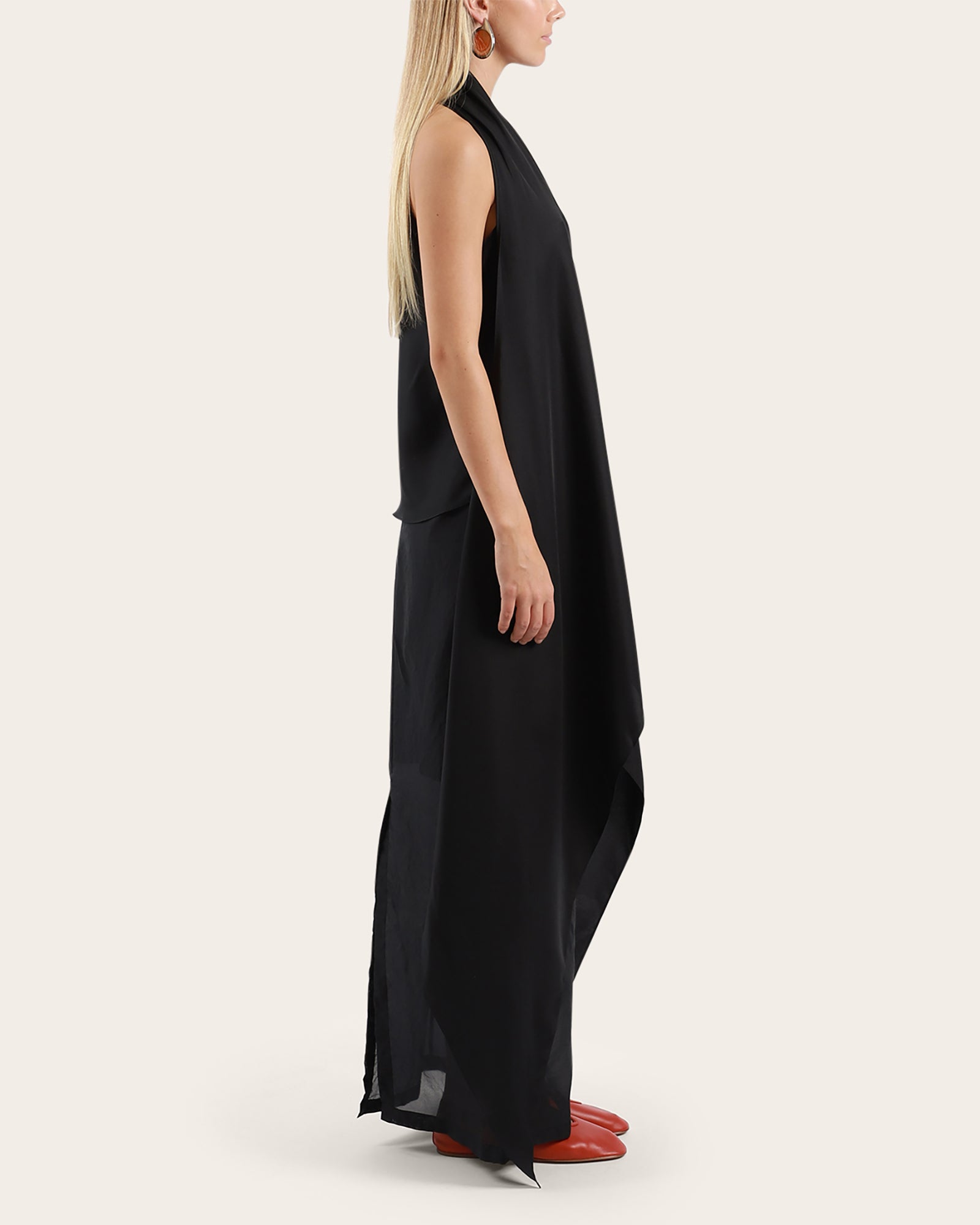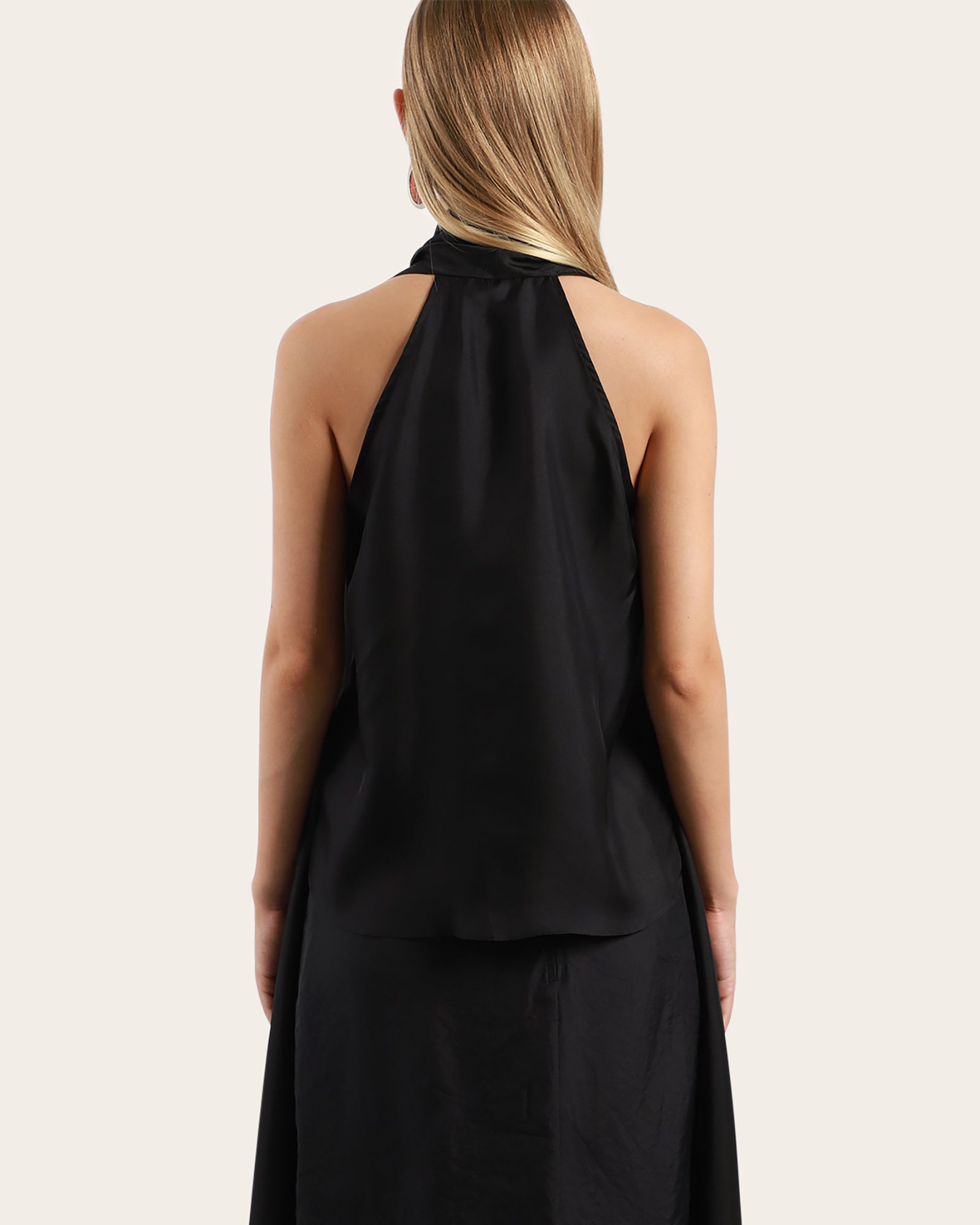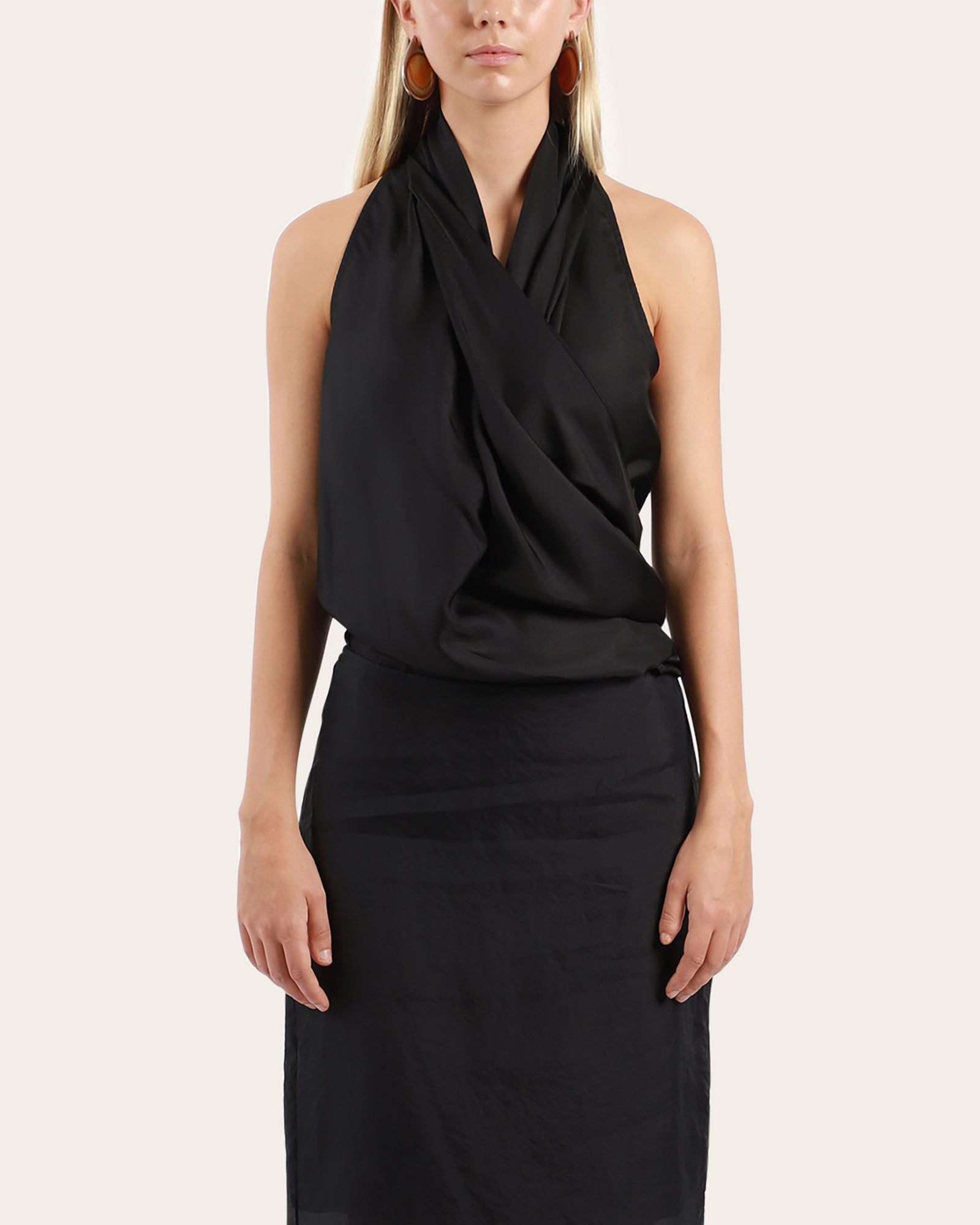 A beautifully draped top, made from 100% silk twill, features a sleeveless look, wrap around waistline to secure, with three buttons to close. This versatile piece can be worn different ways, unwrapped around waistline, wrapped at front back or side.