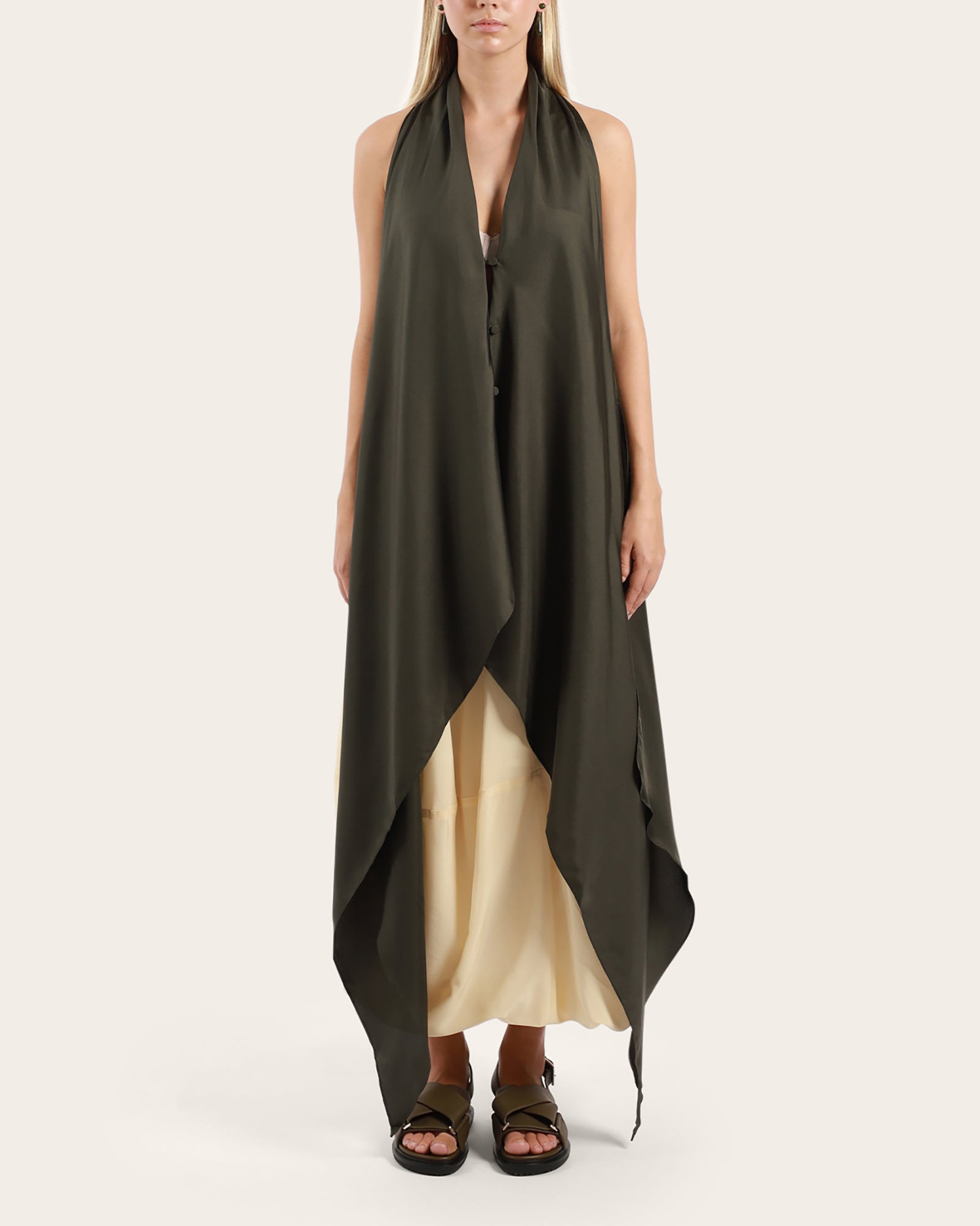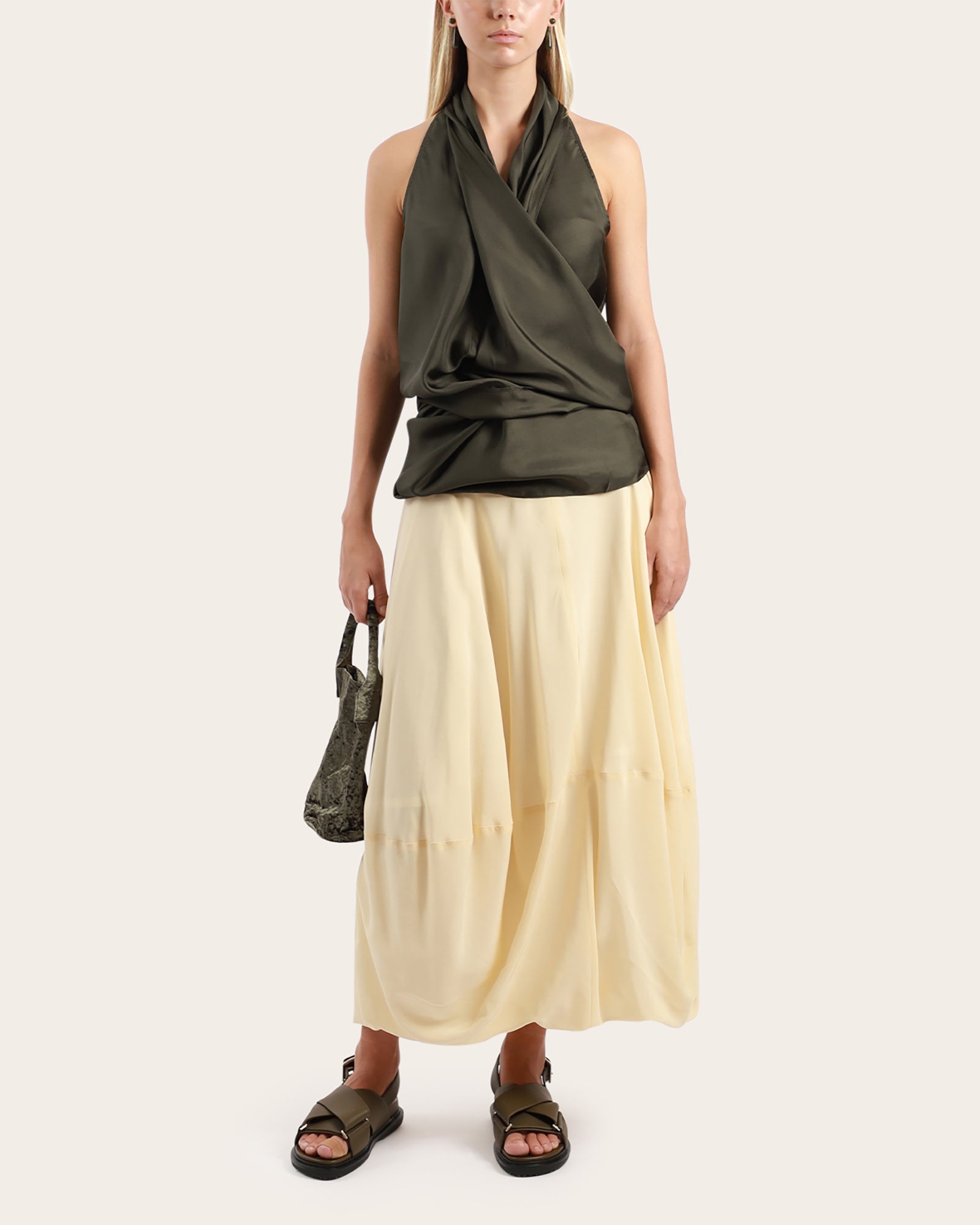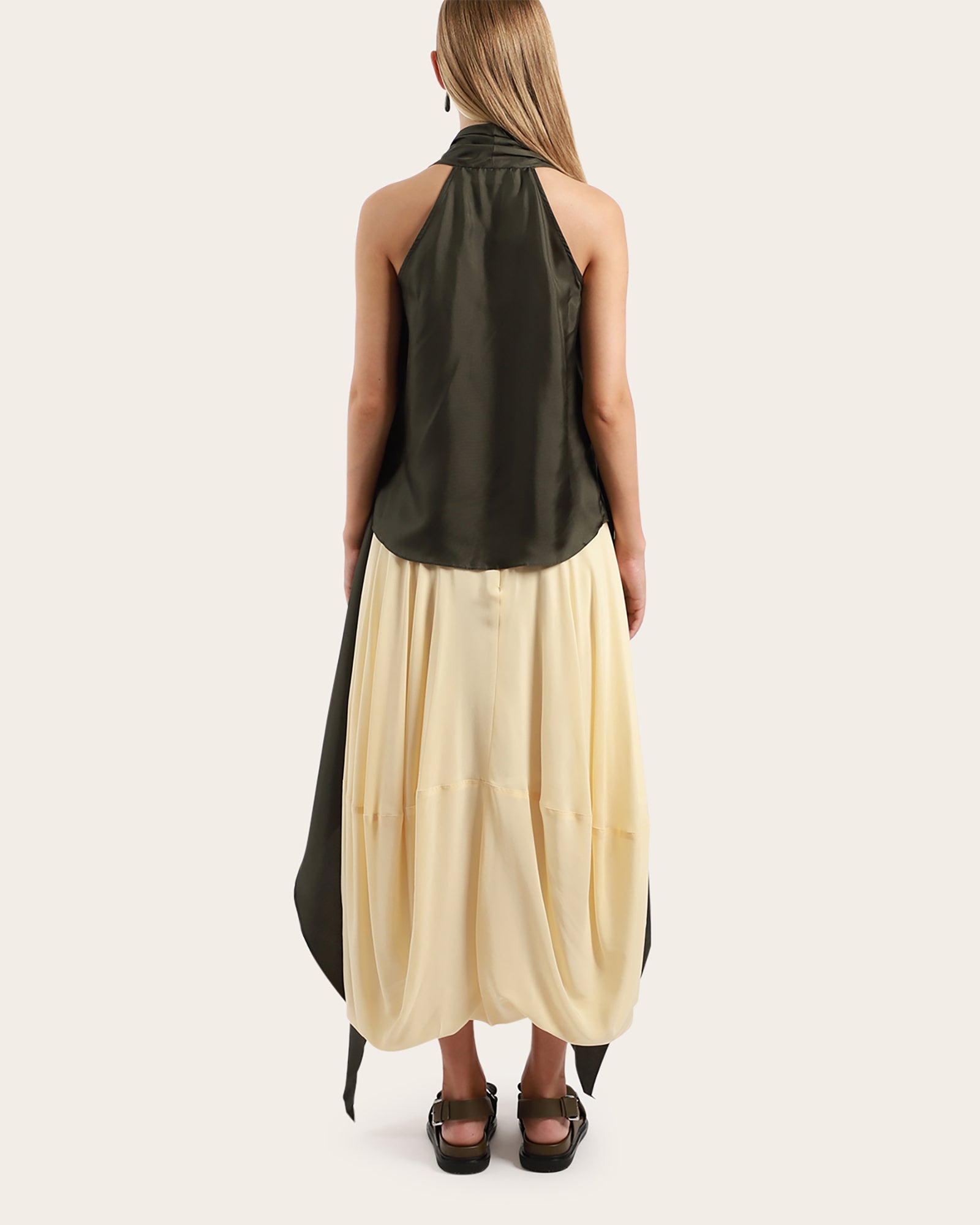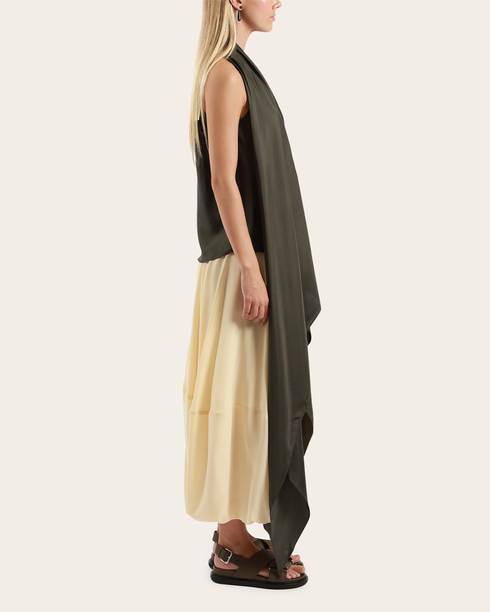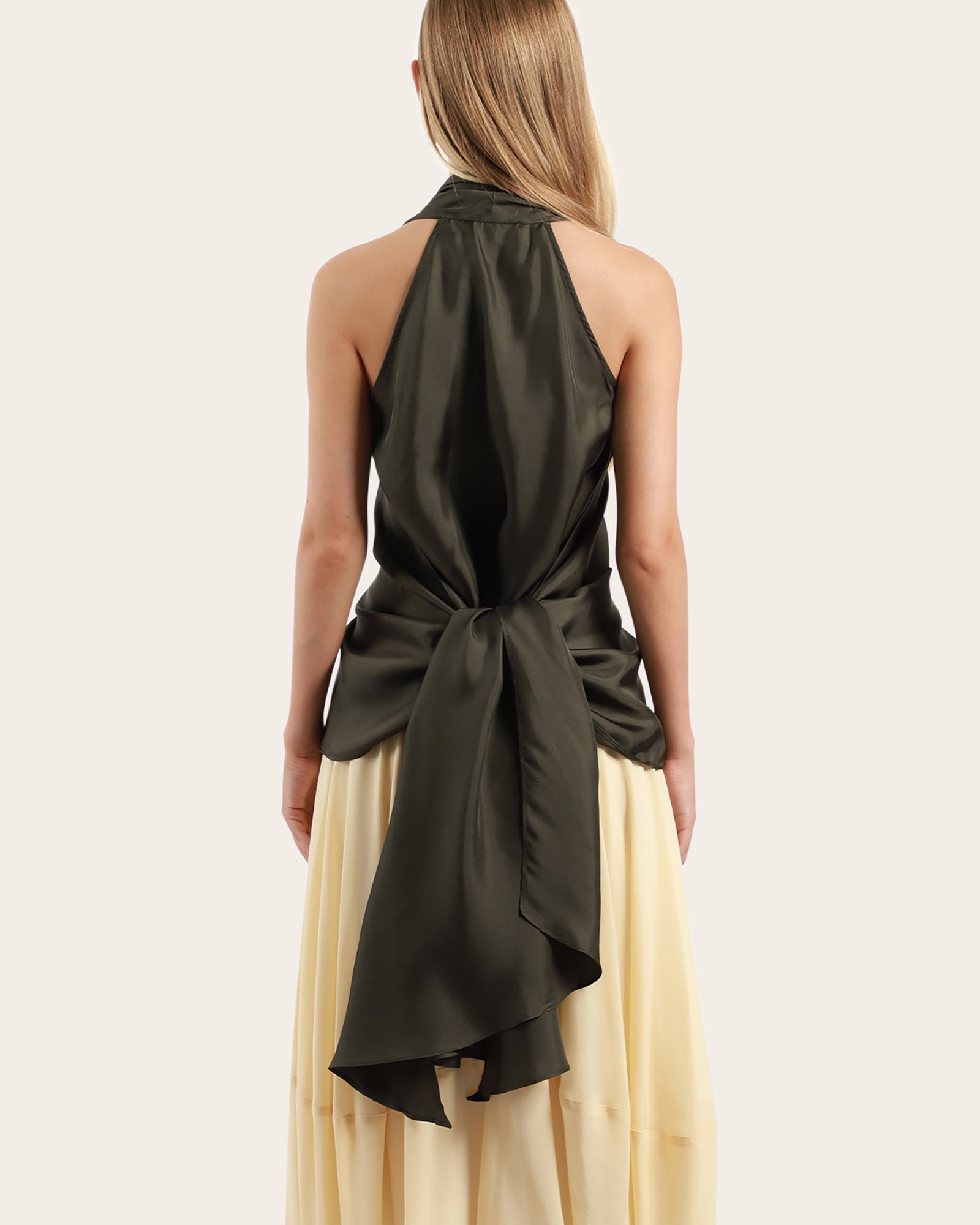 A beautifully draped top, made from 100% silk twill, features a sleeveless look, wrap around waistline to secure, with three buttons to close. This versatile piece can be worn different ways, unwrapped around waistline, wrapped at front back or side.