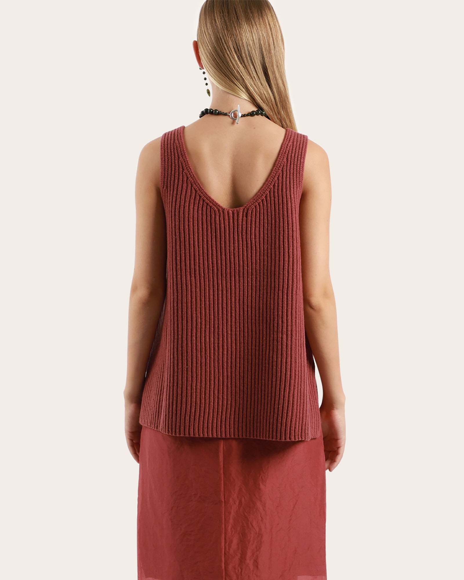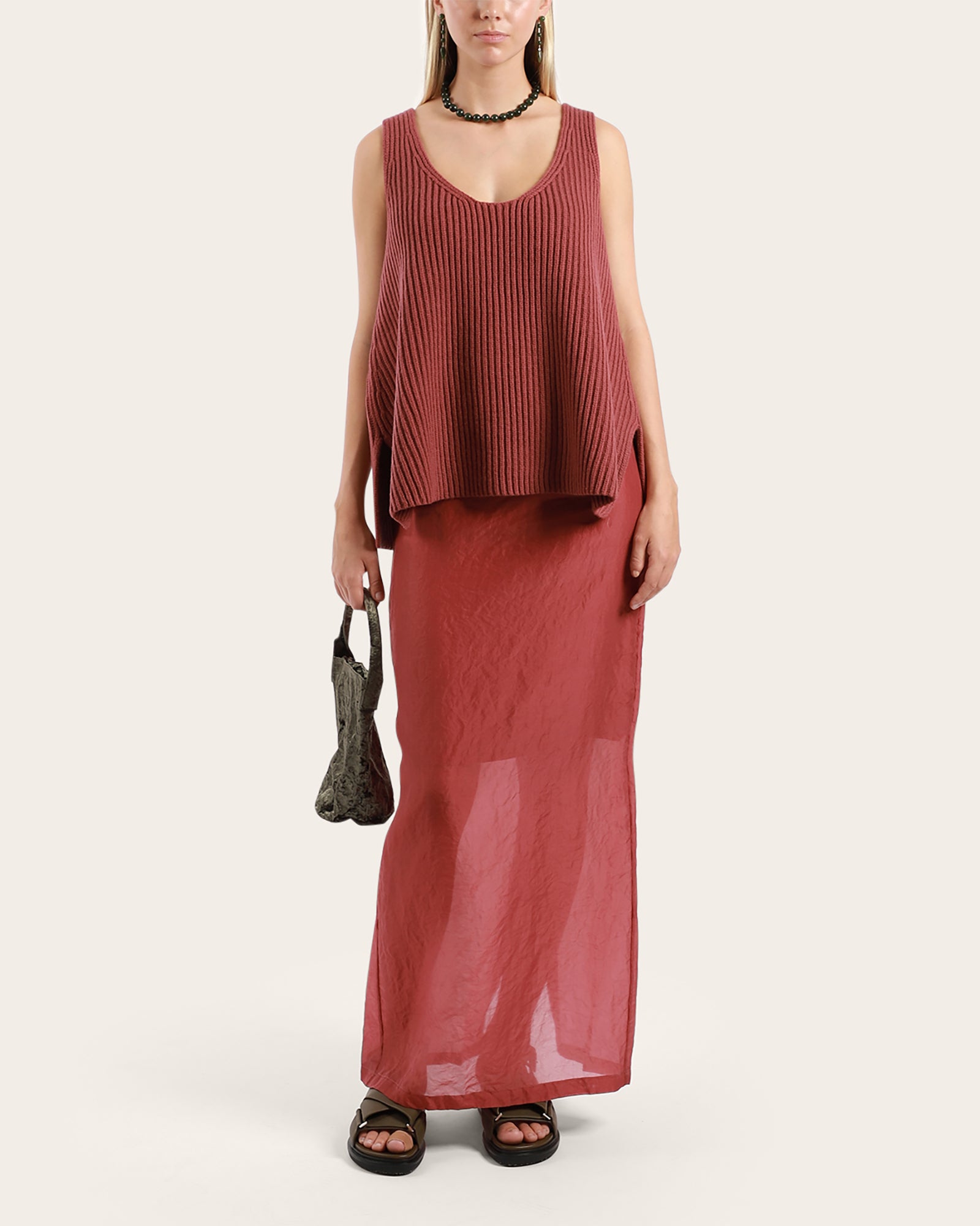 Ribbed-knit oversized tank top with a deep scoop neckline. Features a straight, extended cut that flows away from the body, while wide straps and minimalist lines create a sculptural, structured-yet-soft silhouette.