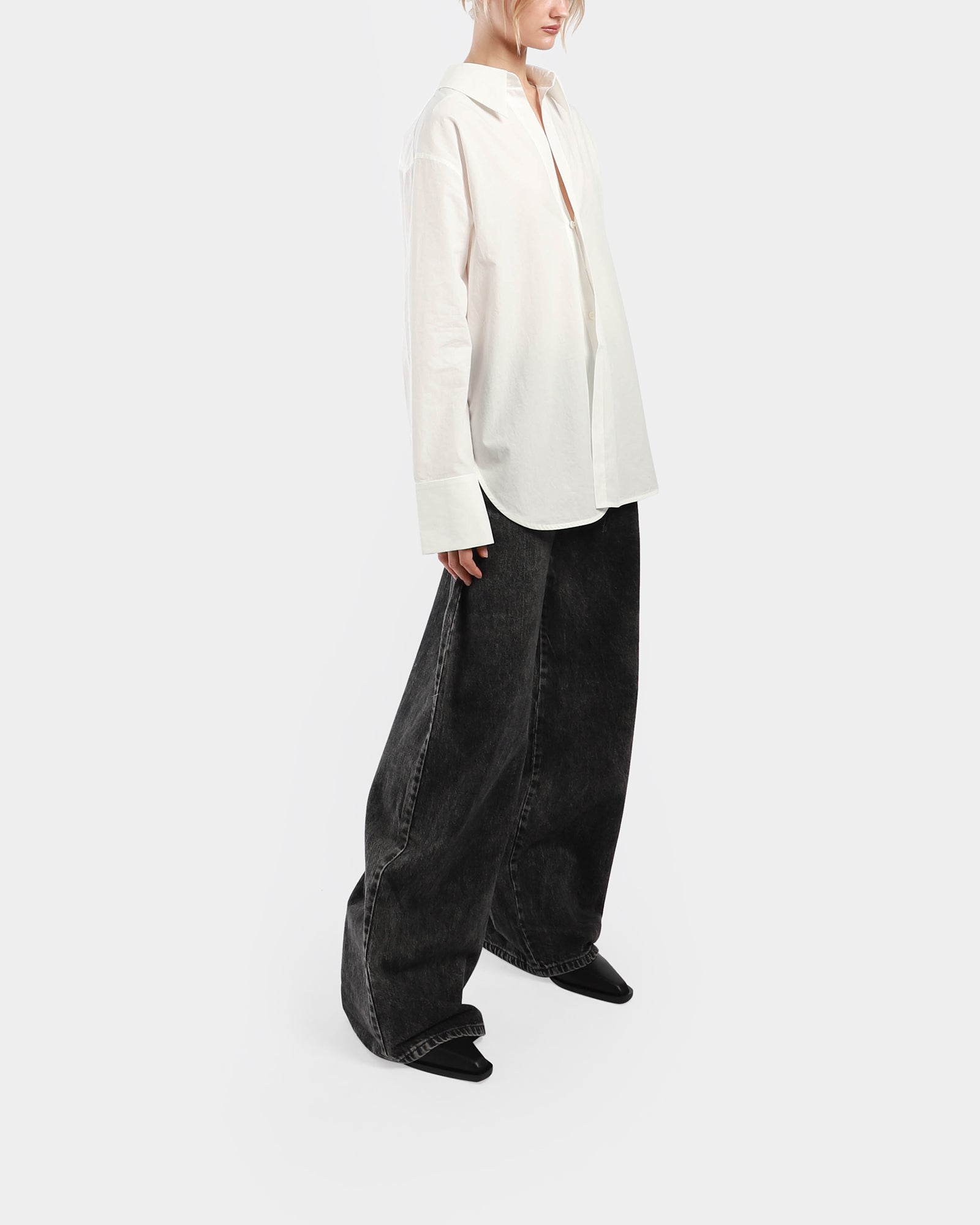 This oversized cotton shirt offers a modern, pocket-free design with a single-button closure. It has a wide collar and cuffs. Its relaxed fit and crisp fabric make it a versatile wardrobe staple.