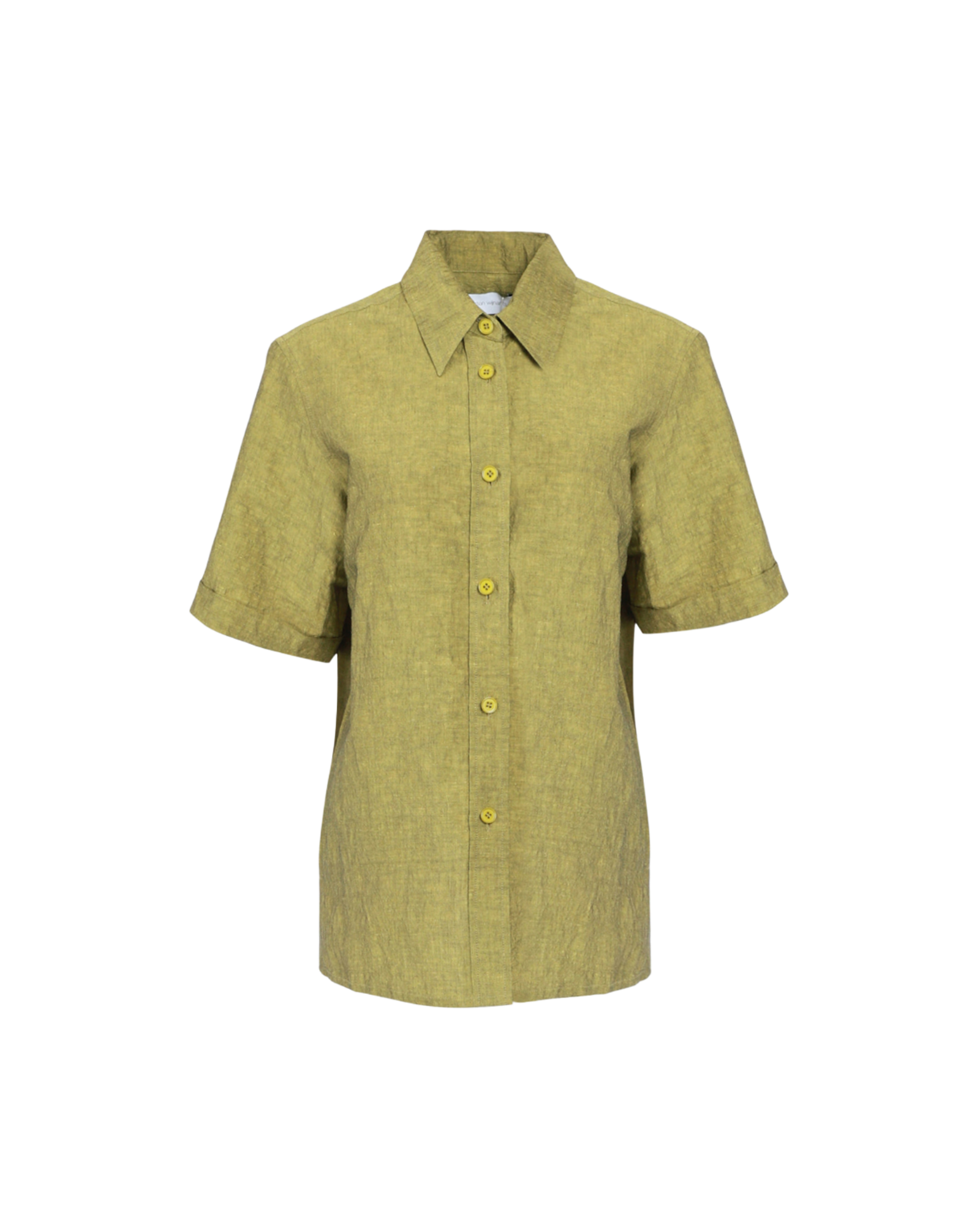 Christian Wijnants short sleeve shirt, featuring linen blend textured fabric, tailored fit, classic collar, upturned sleeve cuff, shirt buttons at front to close.