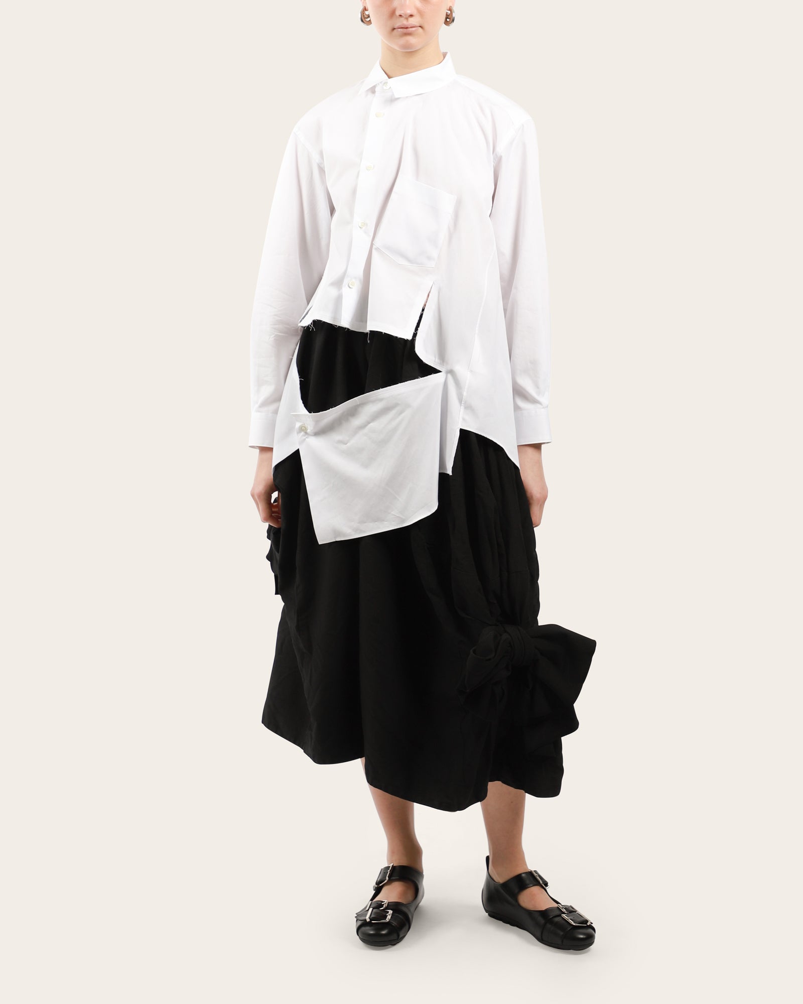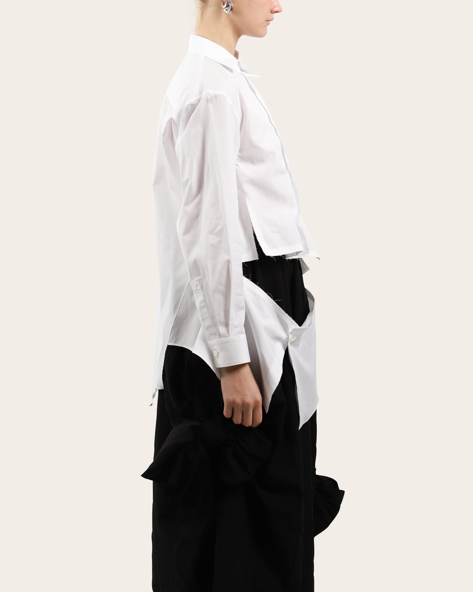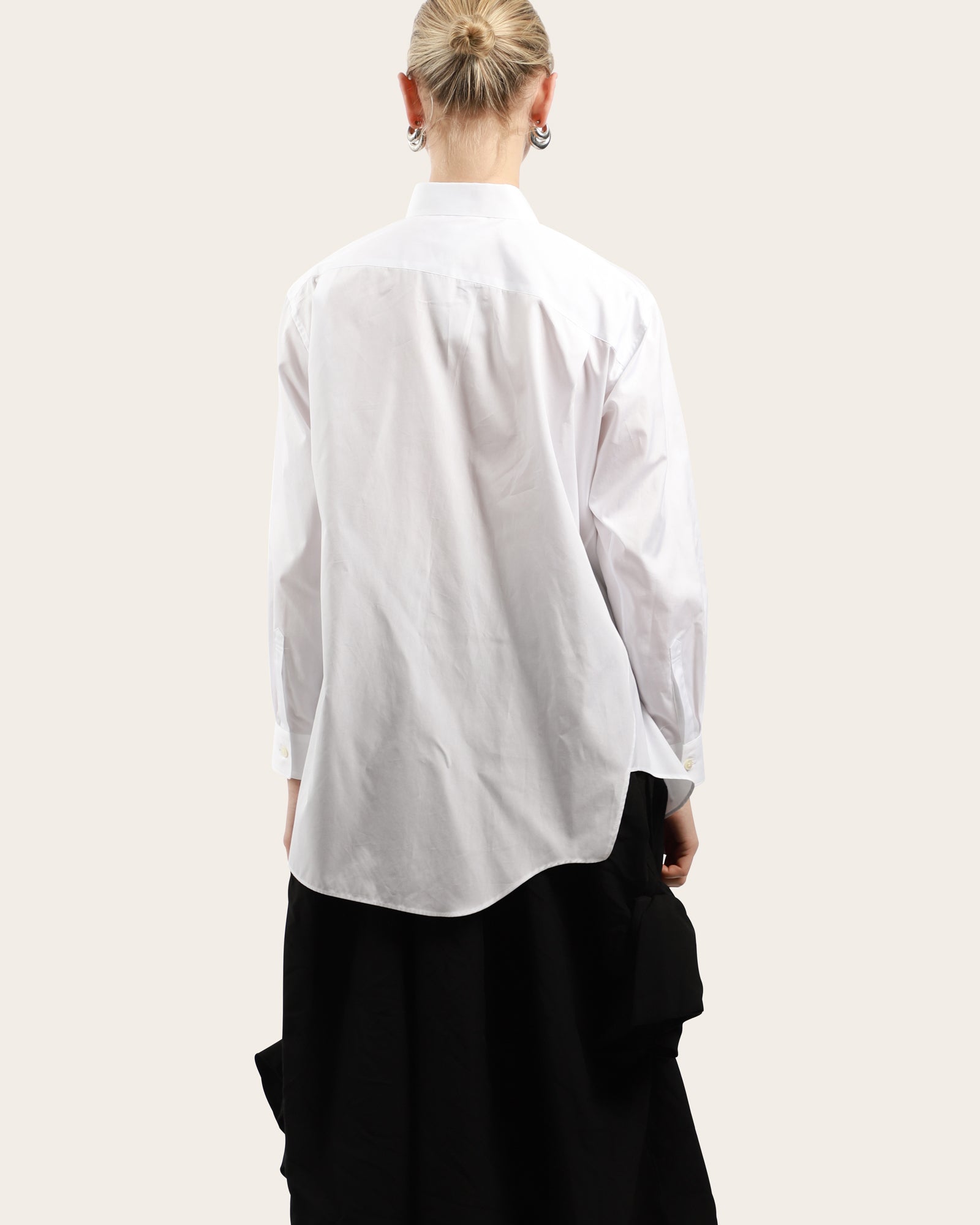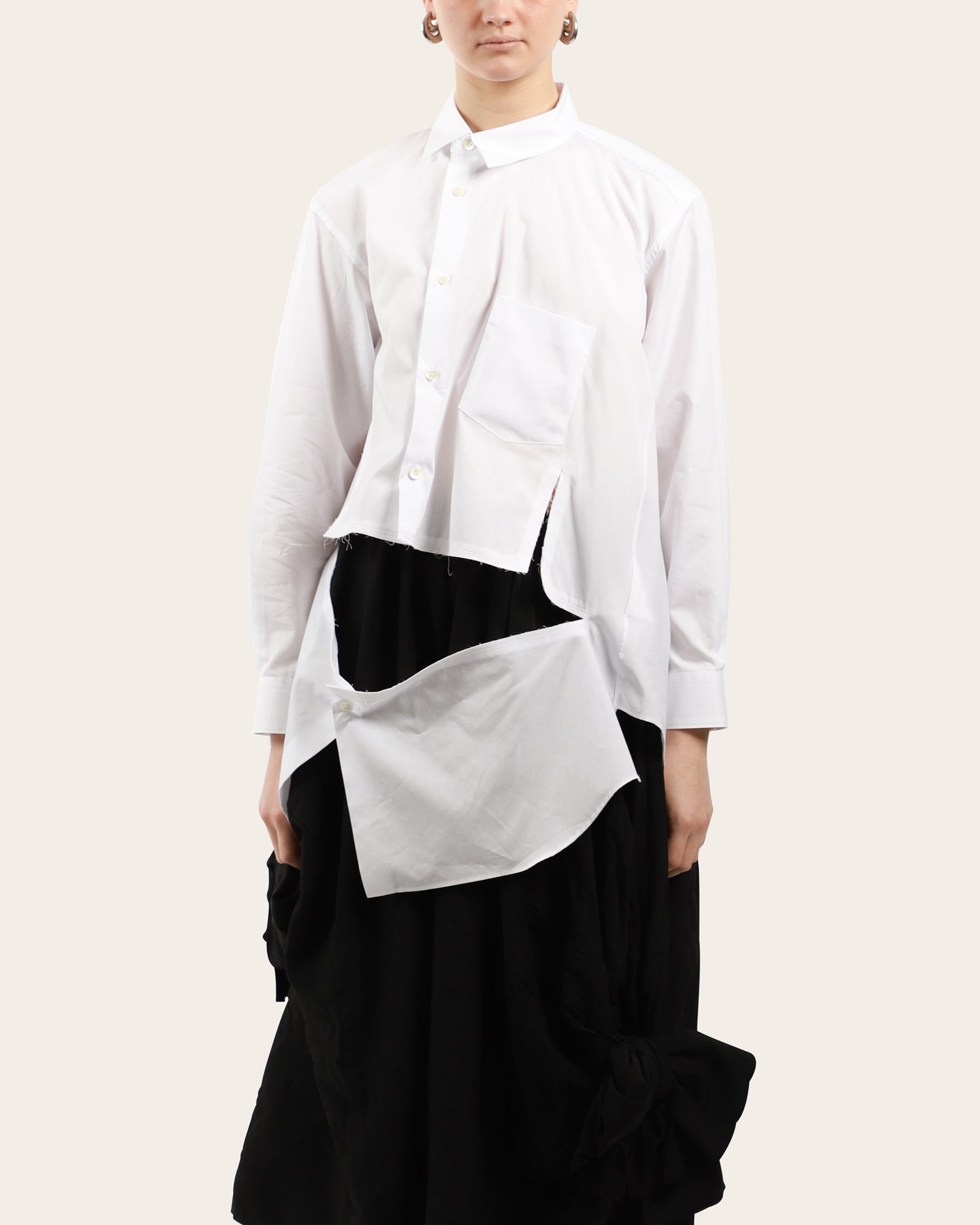 A unique shirt, made from 100% cotton, featuring a classic collar, buttons slightly on the side to close, ripped on the side with a button to attach if needed, long sleeves with button at cuffs and a chest pocket. This shirt offers a different dimension to your everyday outfit, making it unique and versatile. Made in Japan.
