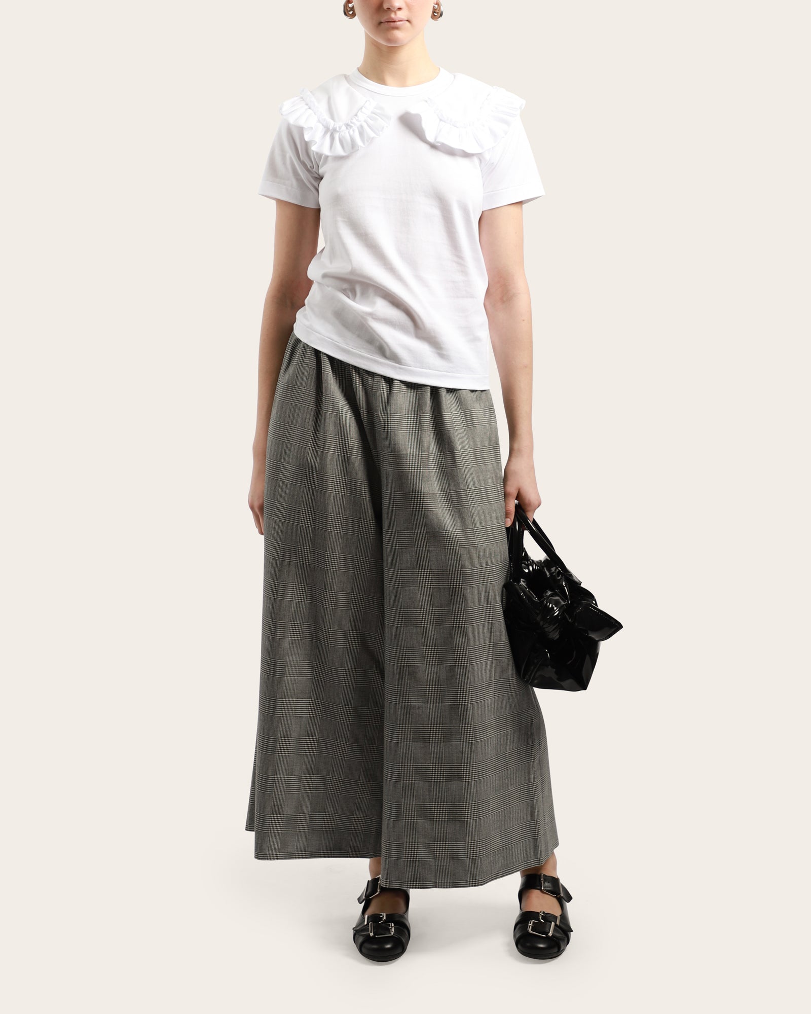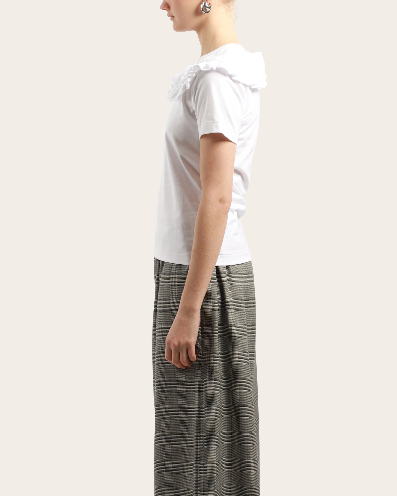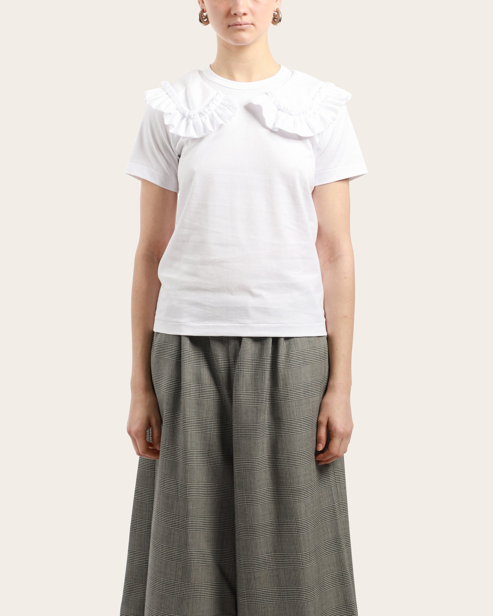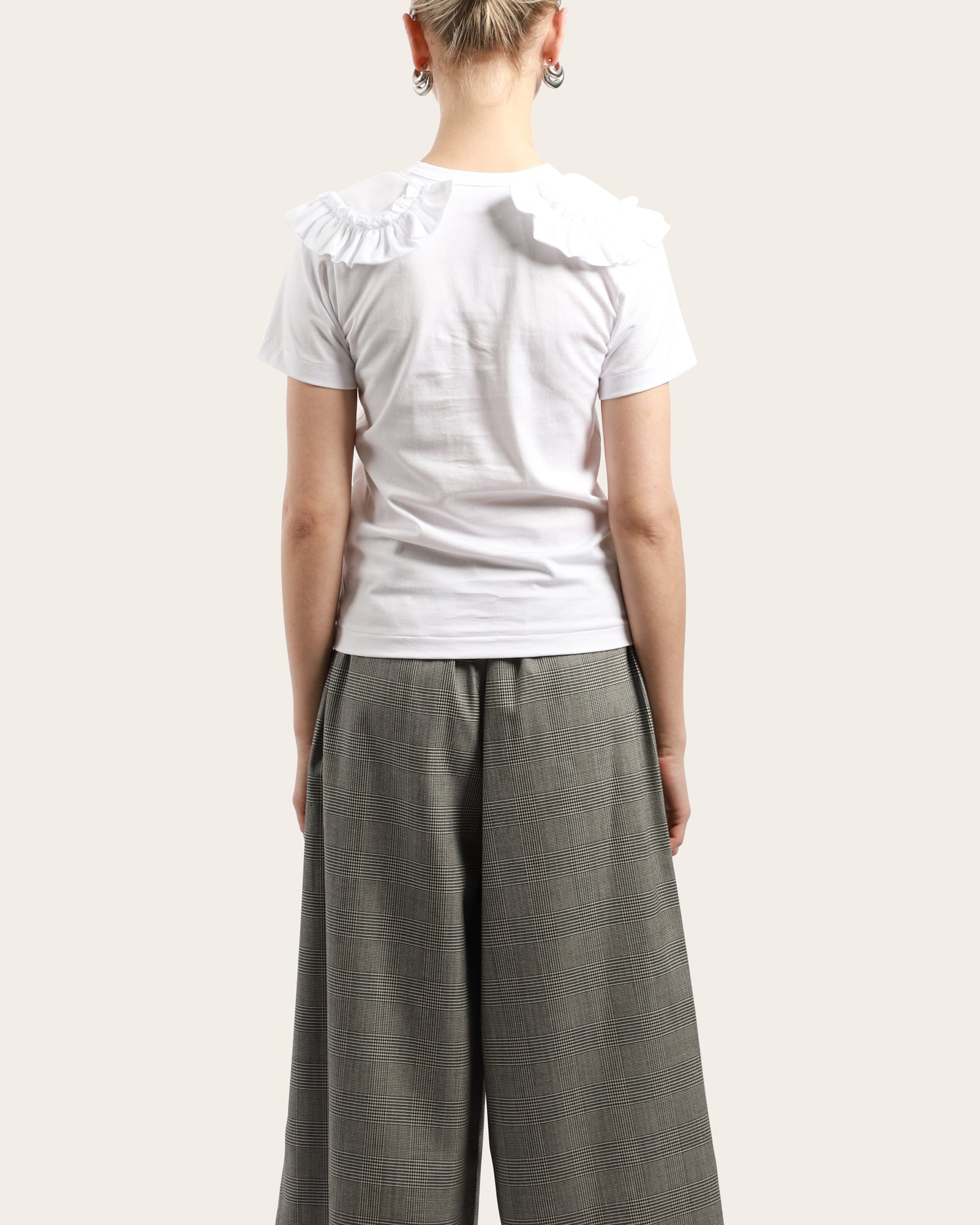 A t-shirt, made from 100% cotton, feature a ruffled round neckline showing at front and back, short sleeves and a regular fit. Made in Japan.