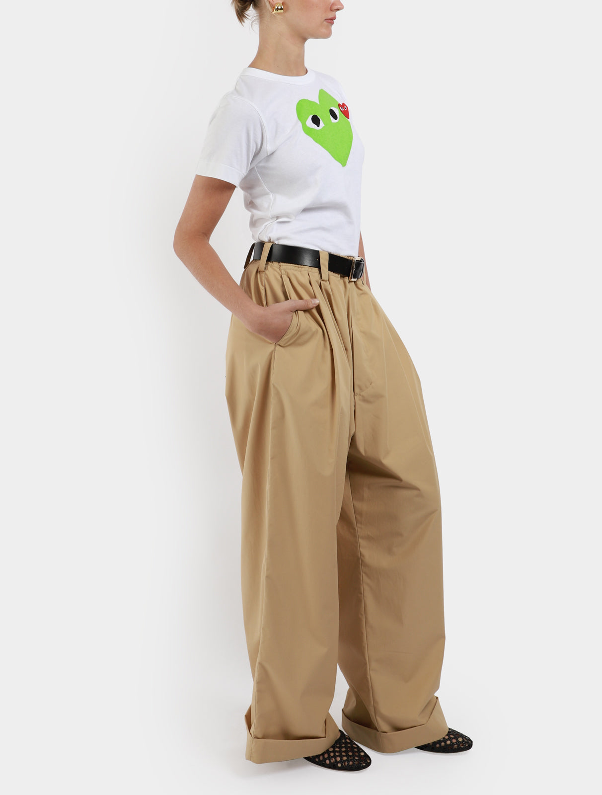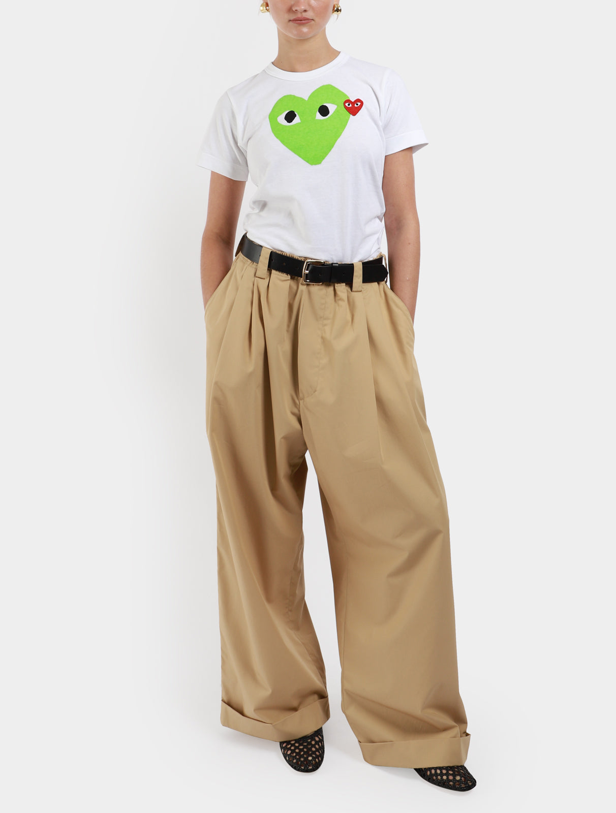 Classic white t-shirt from Comme des Garçons Play featuring the brand’s iconic almond-eyed red heart that has been embroidered to the chest and a larger heart graphic print at the front, a round neck, short sleeves, a straight hem and slim fit.