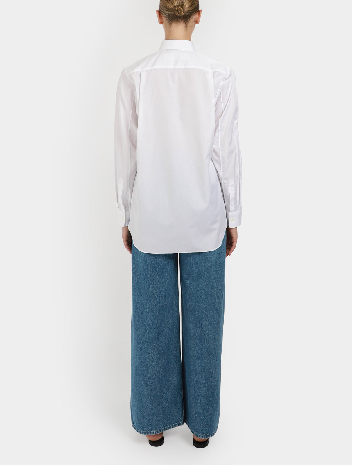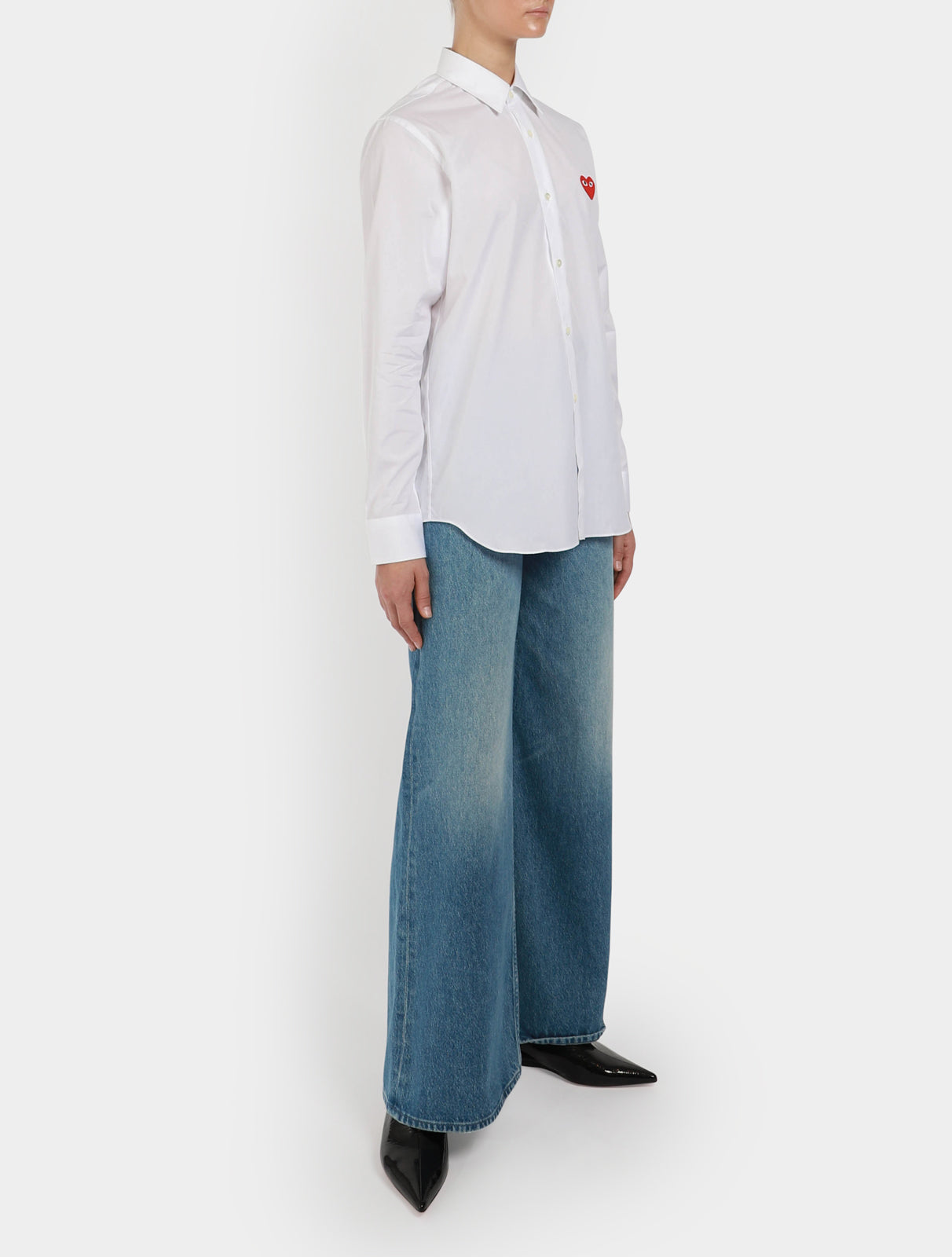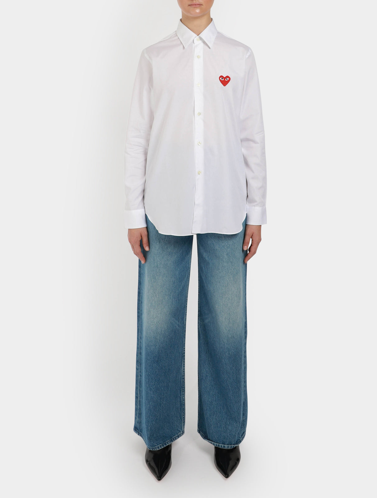 Classic white cotton poplin shirt from Comme des Garçons Play, featuring the brand’s iconic almond-eyed heart that has been embroidered to the chest, a classic collar, button down front, long sleeves and buttoned barrel cuffs.