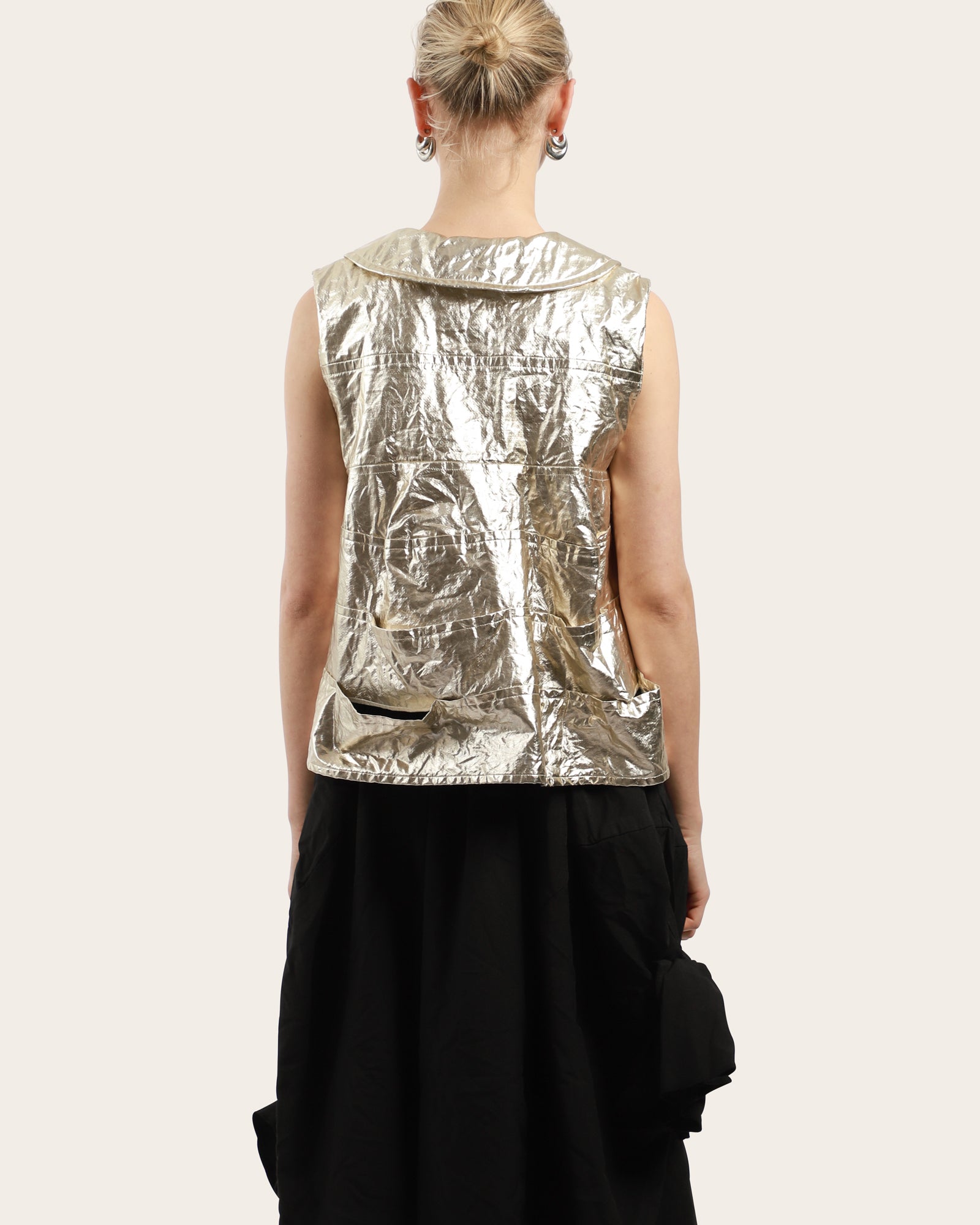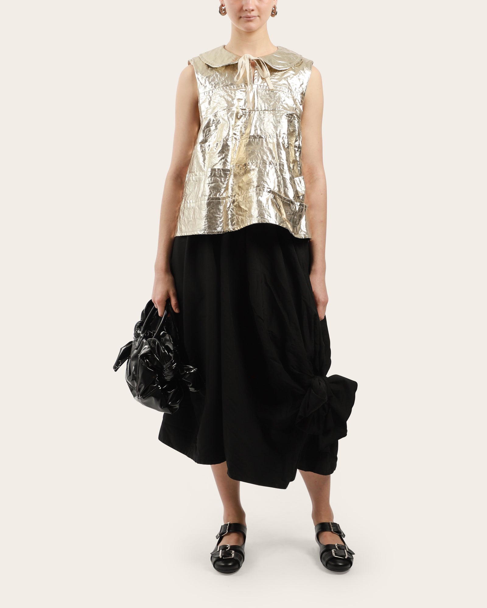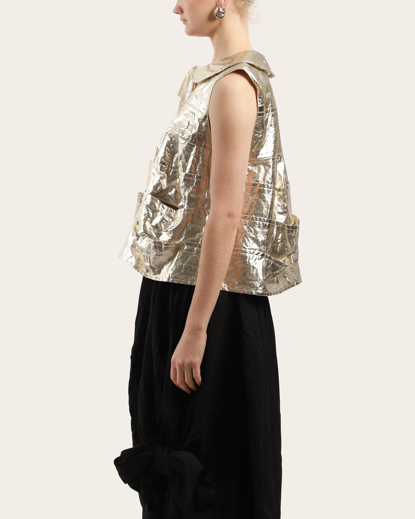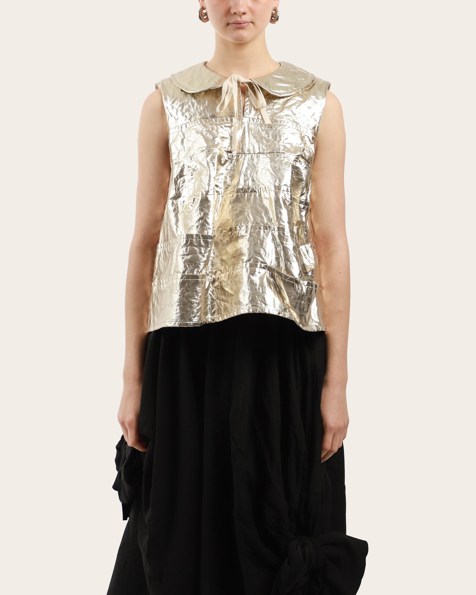 A sleeveless top, featuring a round collar with a drawstring to tie at neckline, hidden fabric cuts all over. Made in Japan.