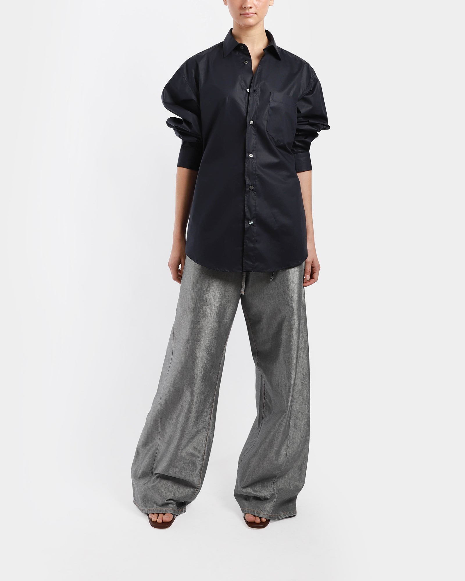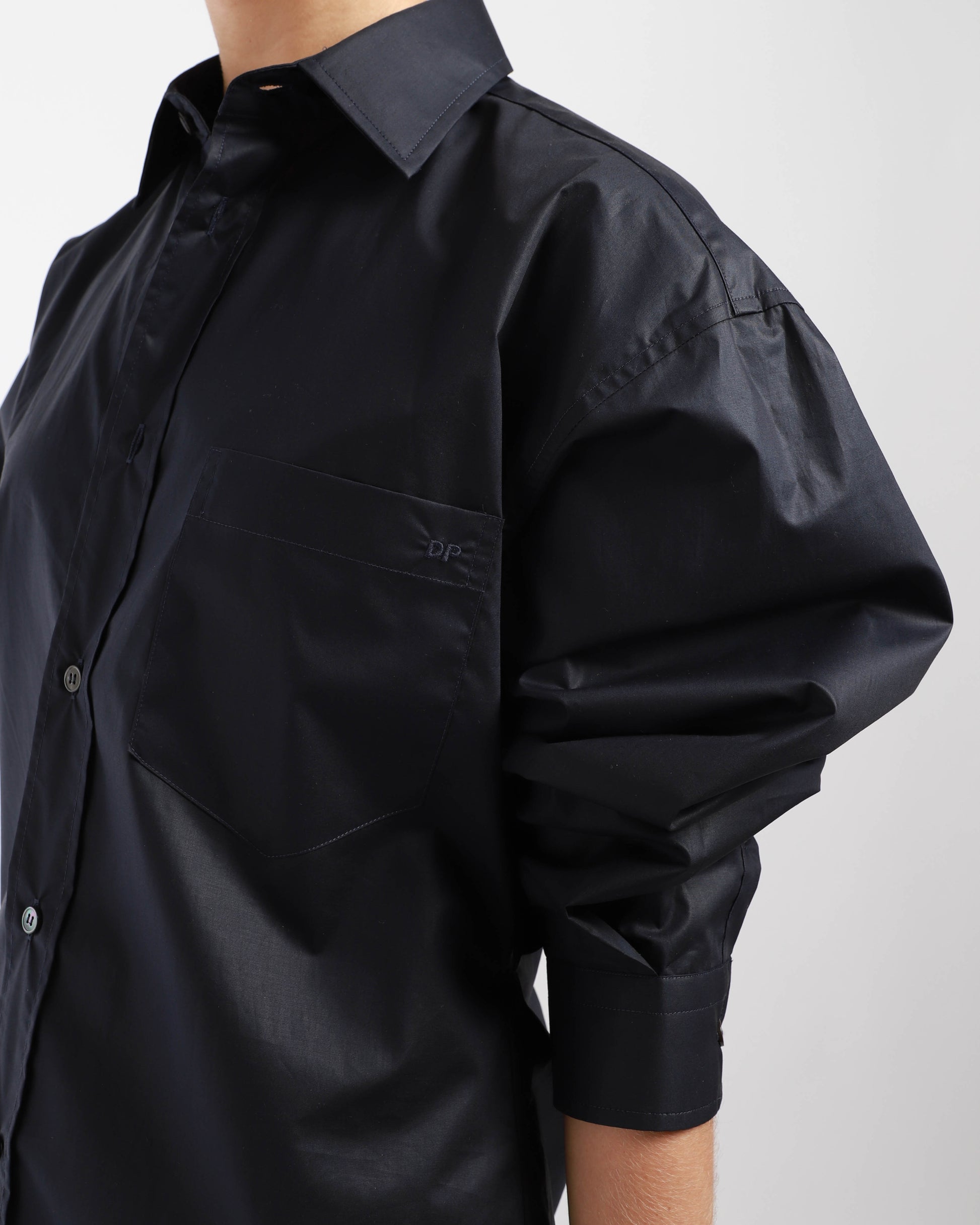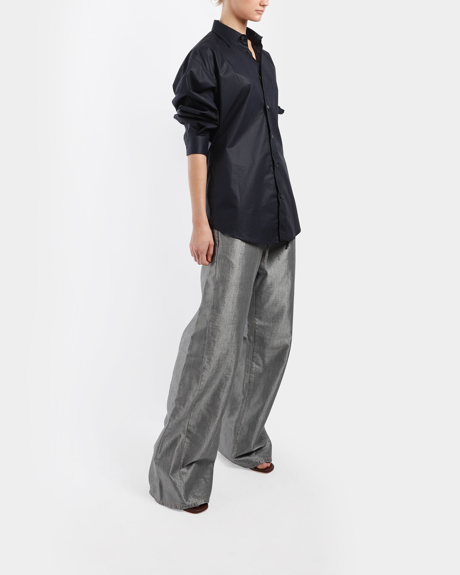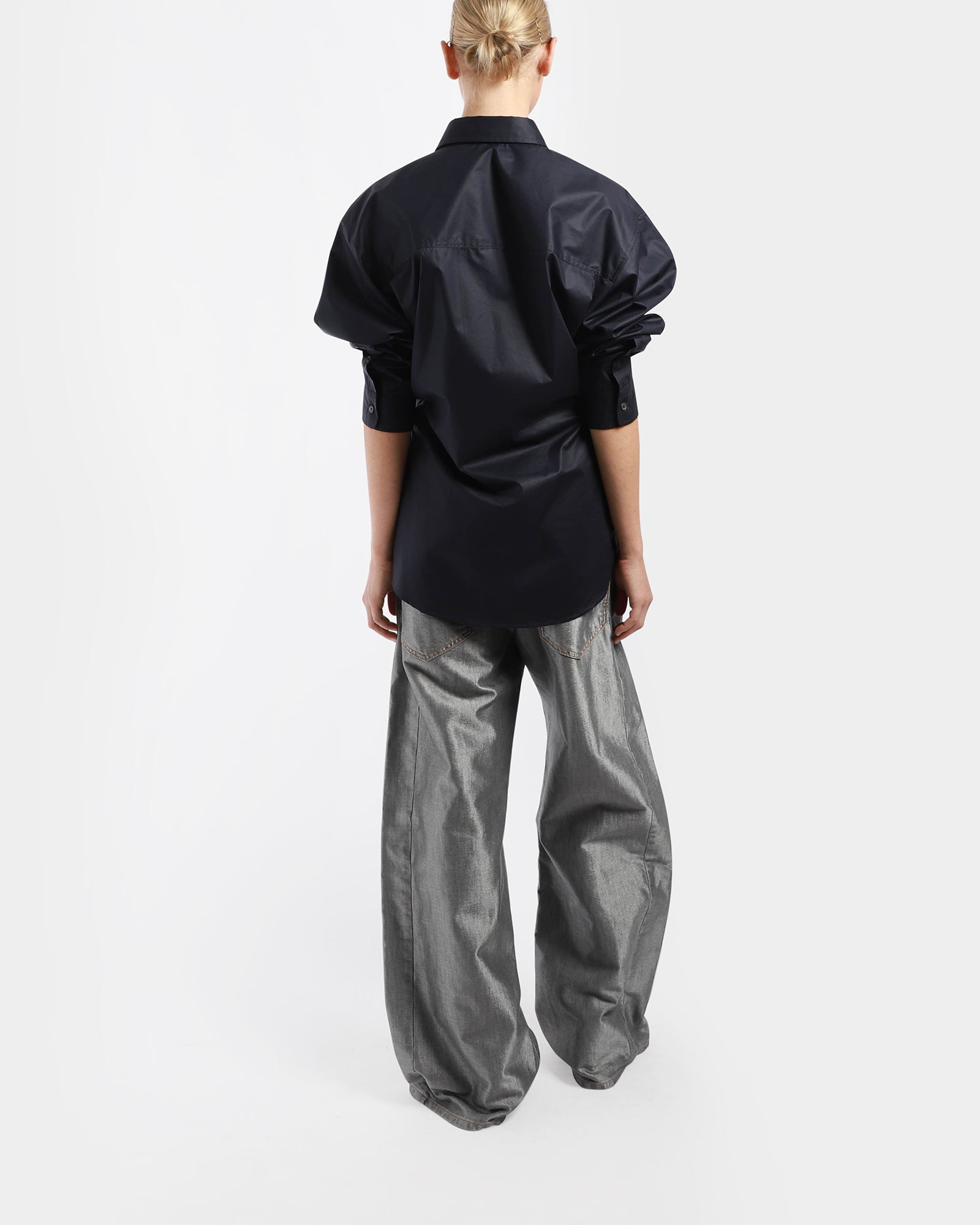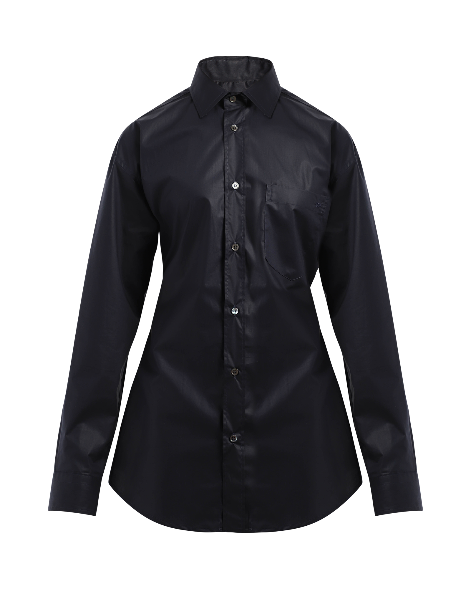 A beautiful tailored shirt, made from cotton, featuring buttons at front to close, buttons at cuffs, rounded hem. The pinched on sides creates a tailored effect on the back with a cinched waist. The cotton fabric as a soft and shiny feel to it. Made in Italy.