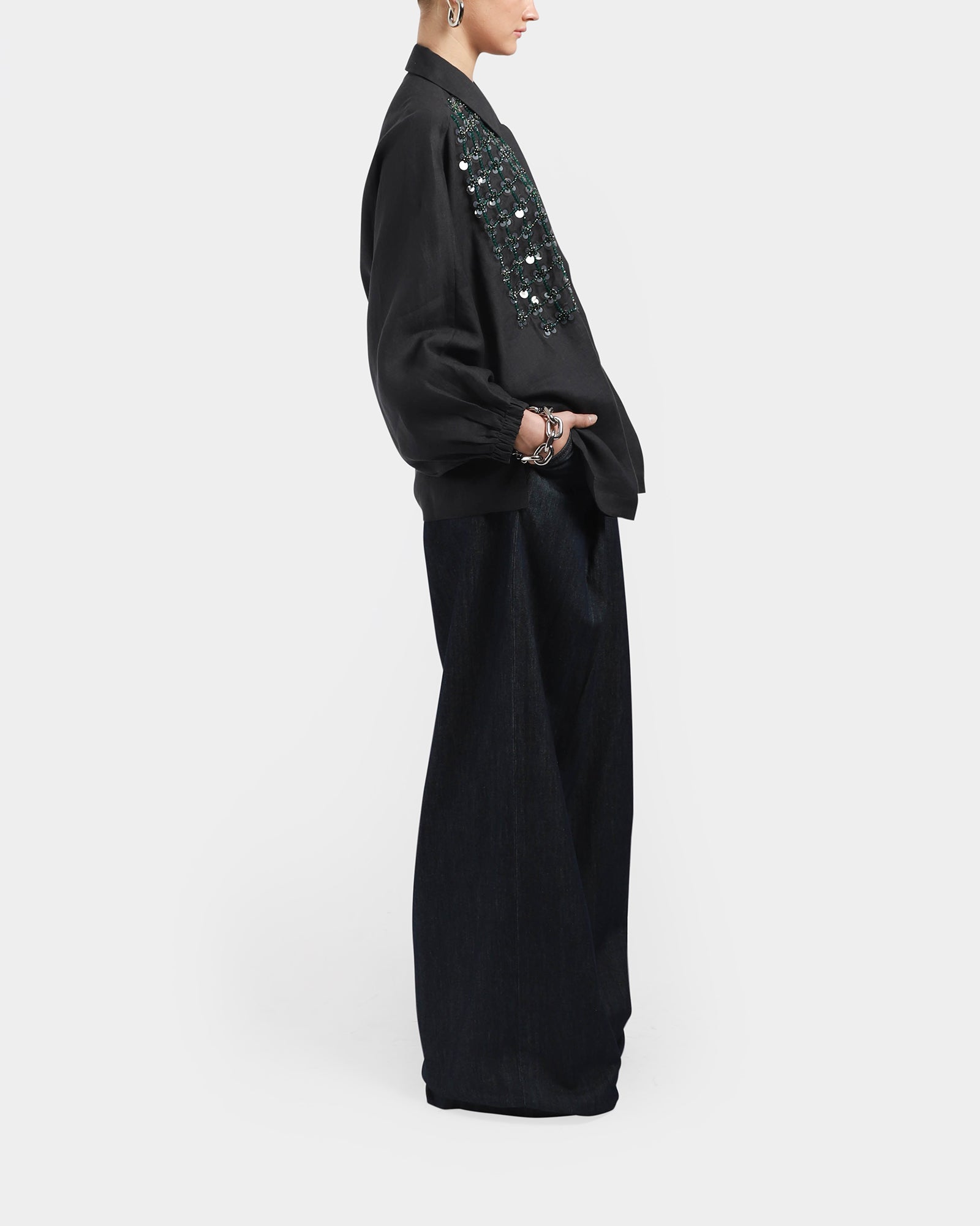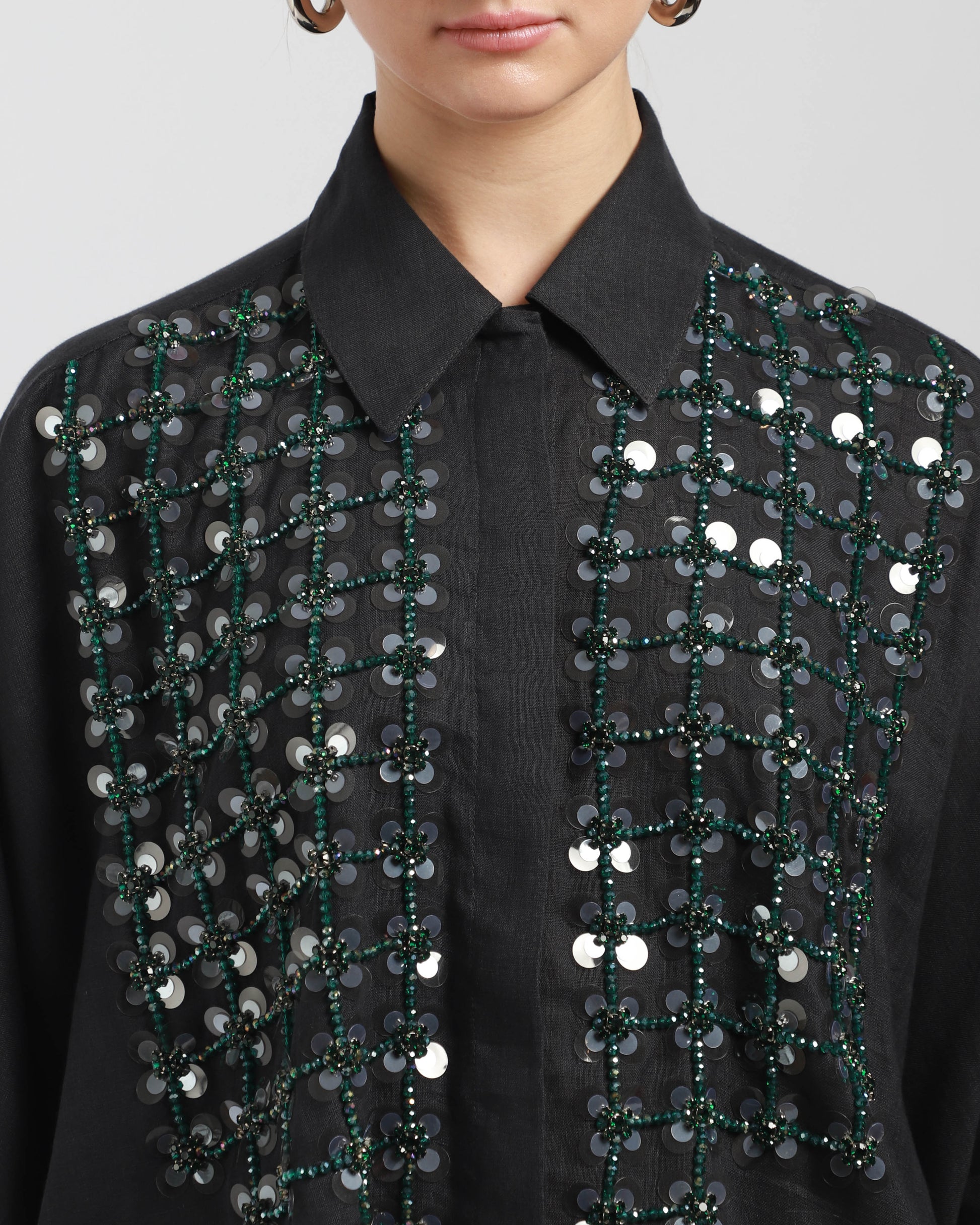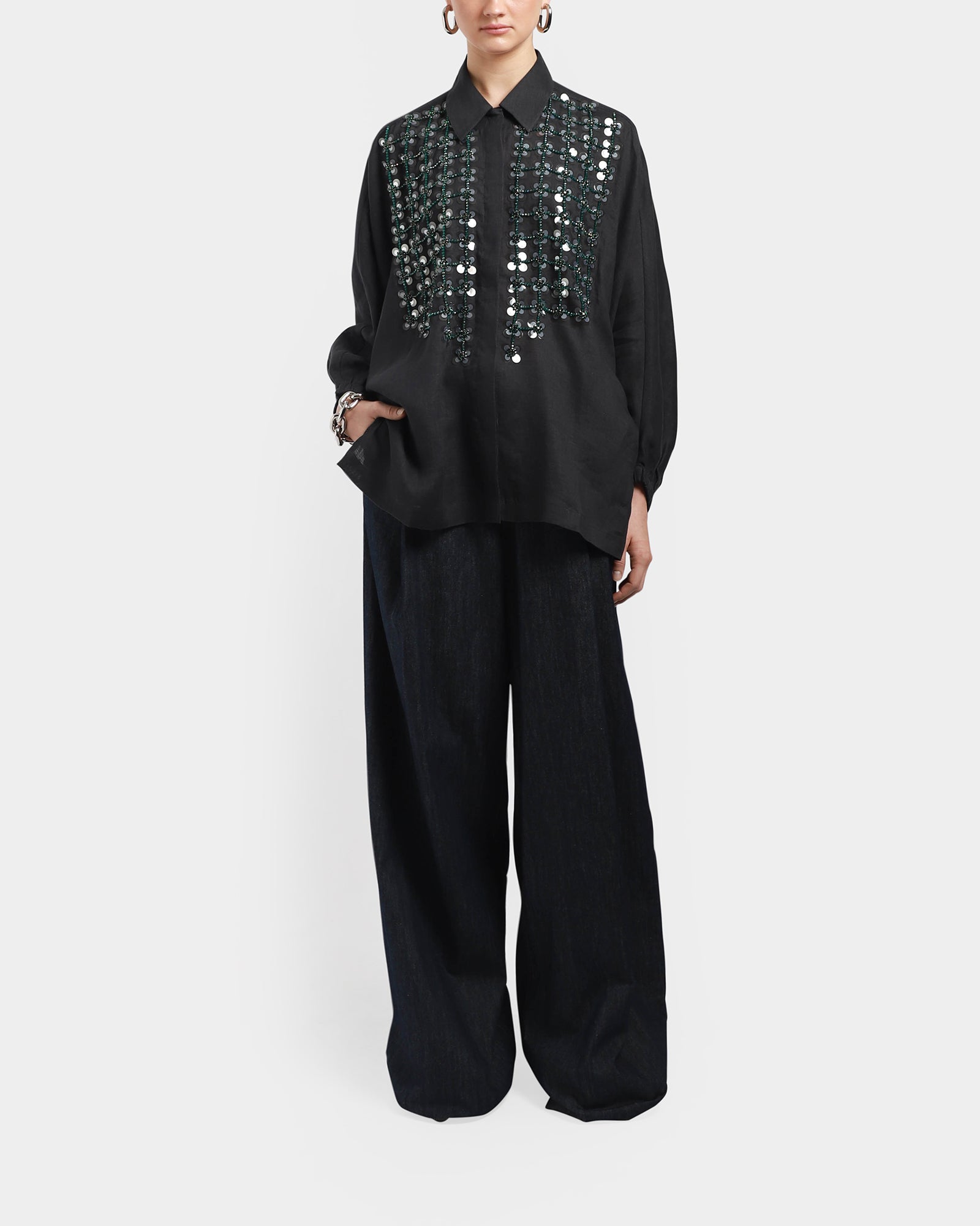 This batwing shirt made from linen and cotton, features 3/4 sleeve length with elasticated cuffs, hidden buttons at front, a classic collar, embroidered crystal beads detail at front.